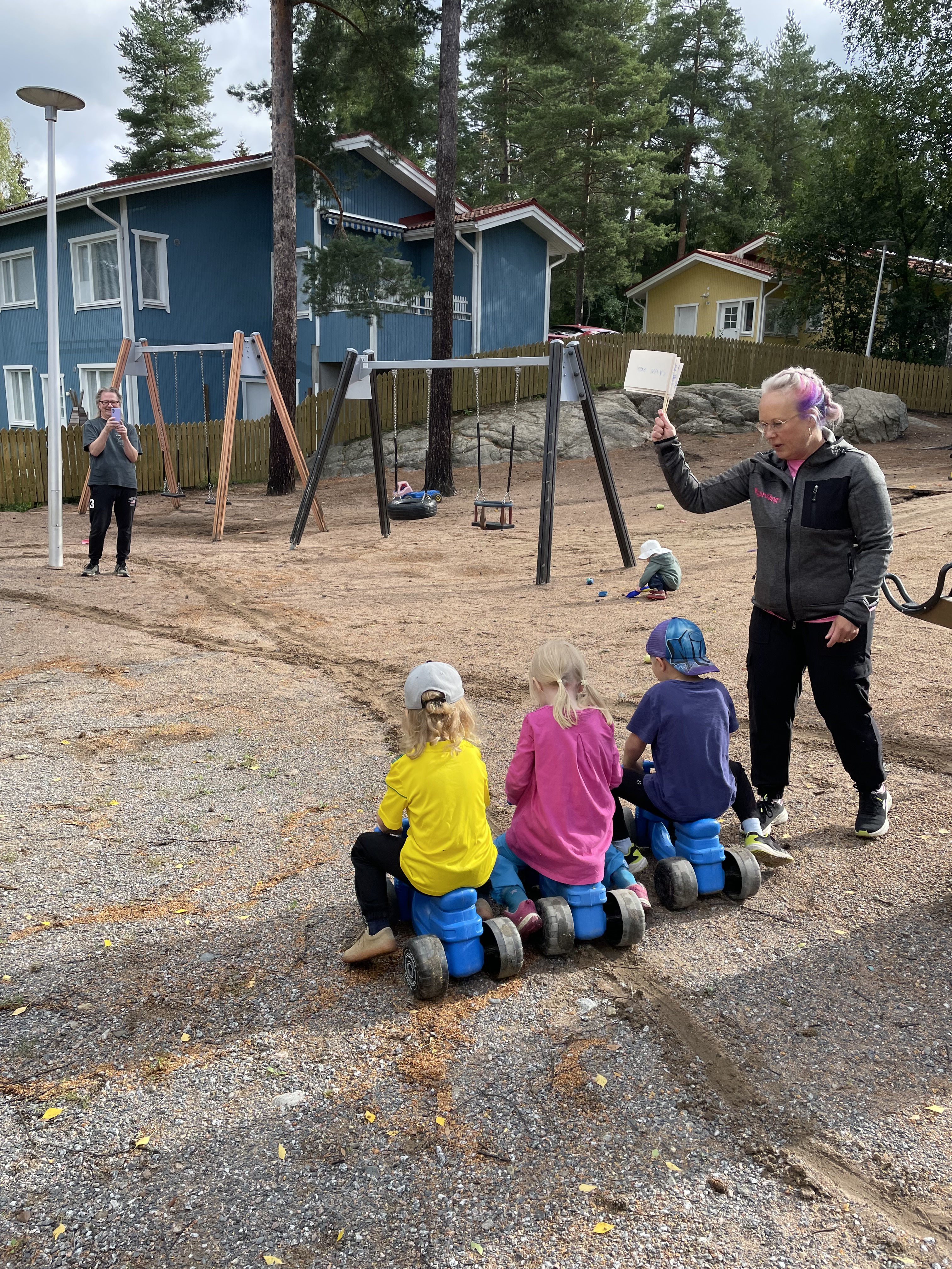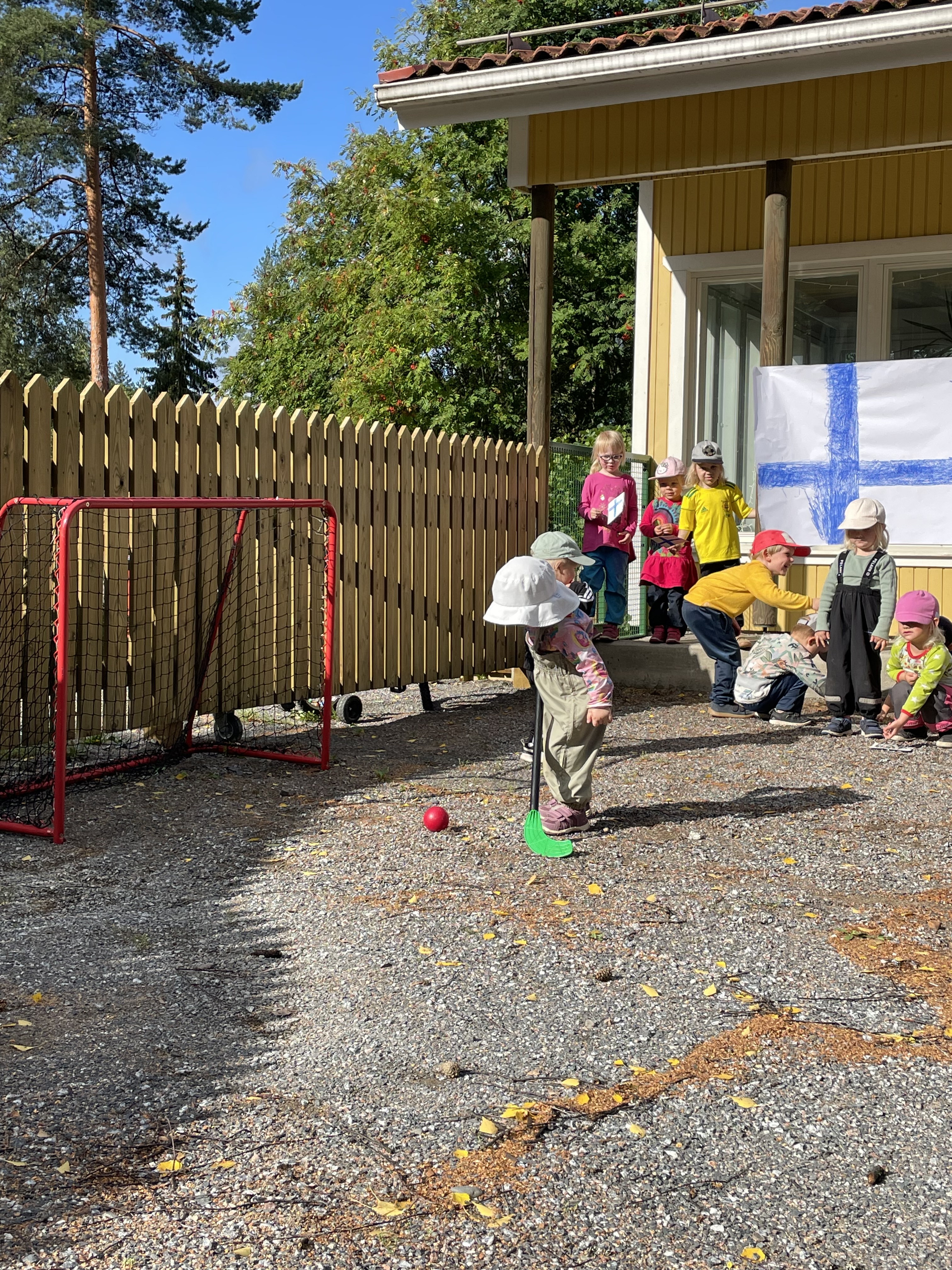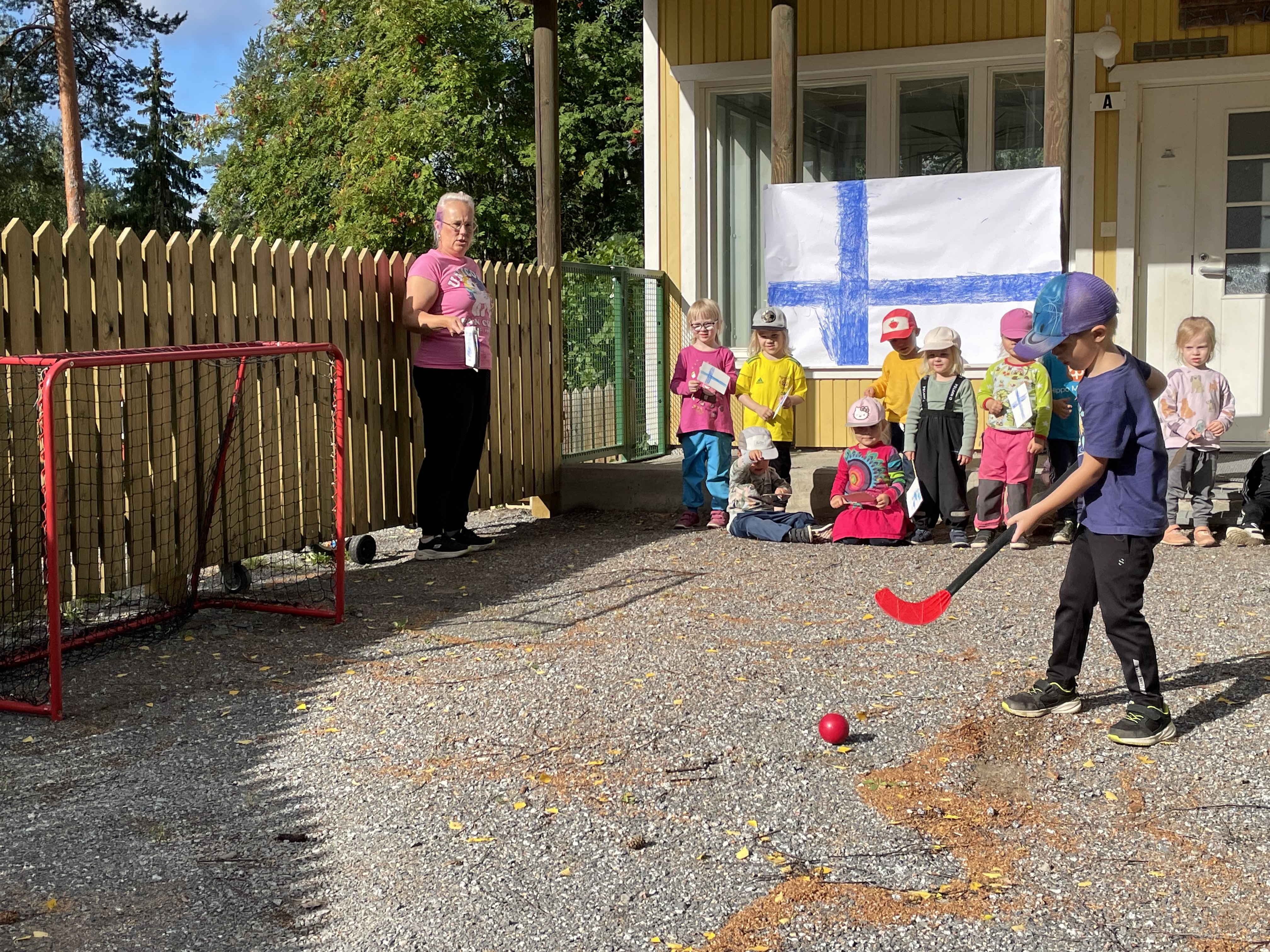Viimeisenä lajina meillä oli ”ylämummo”, toki tässä lajissa riitti ihan pallon saaminen maaliin 🙂 Harjoittelimme myös tuuletuksia kun lapset onnistuivat.