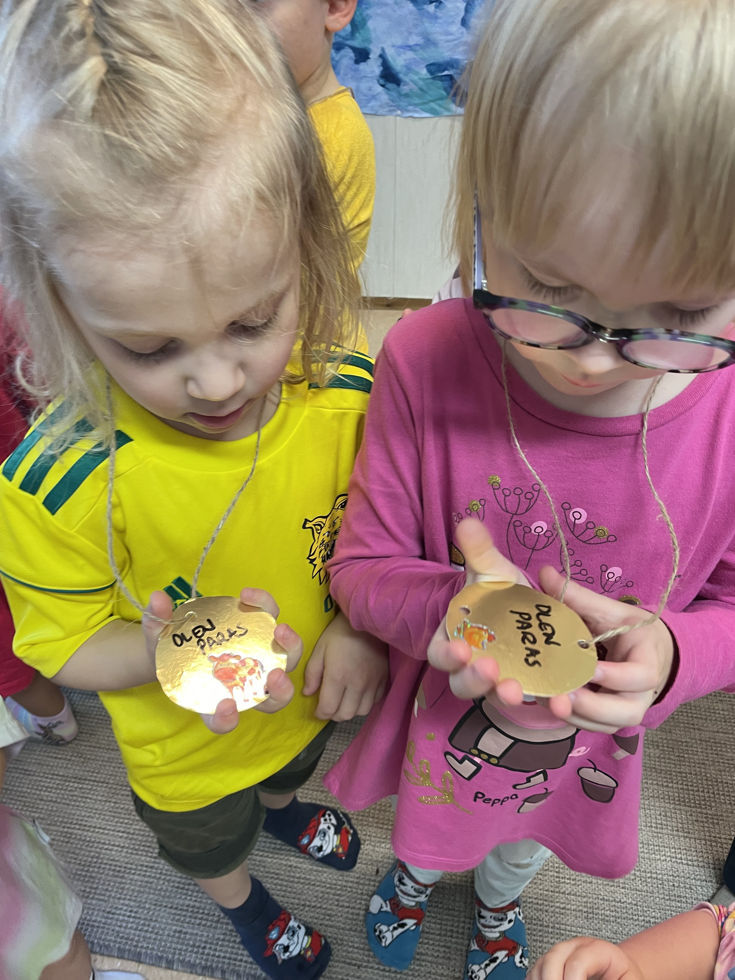 …ja kannustusjoukot edelleen jaksoivat kannustaa kaveria! Lopuksi, ahkerat urheilijat palkittiin kultamitaleilla ja kekseillä. Olo oli kaikkensa antanut!