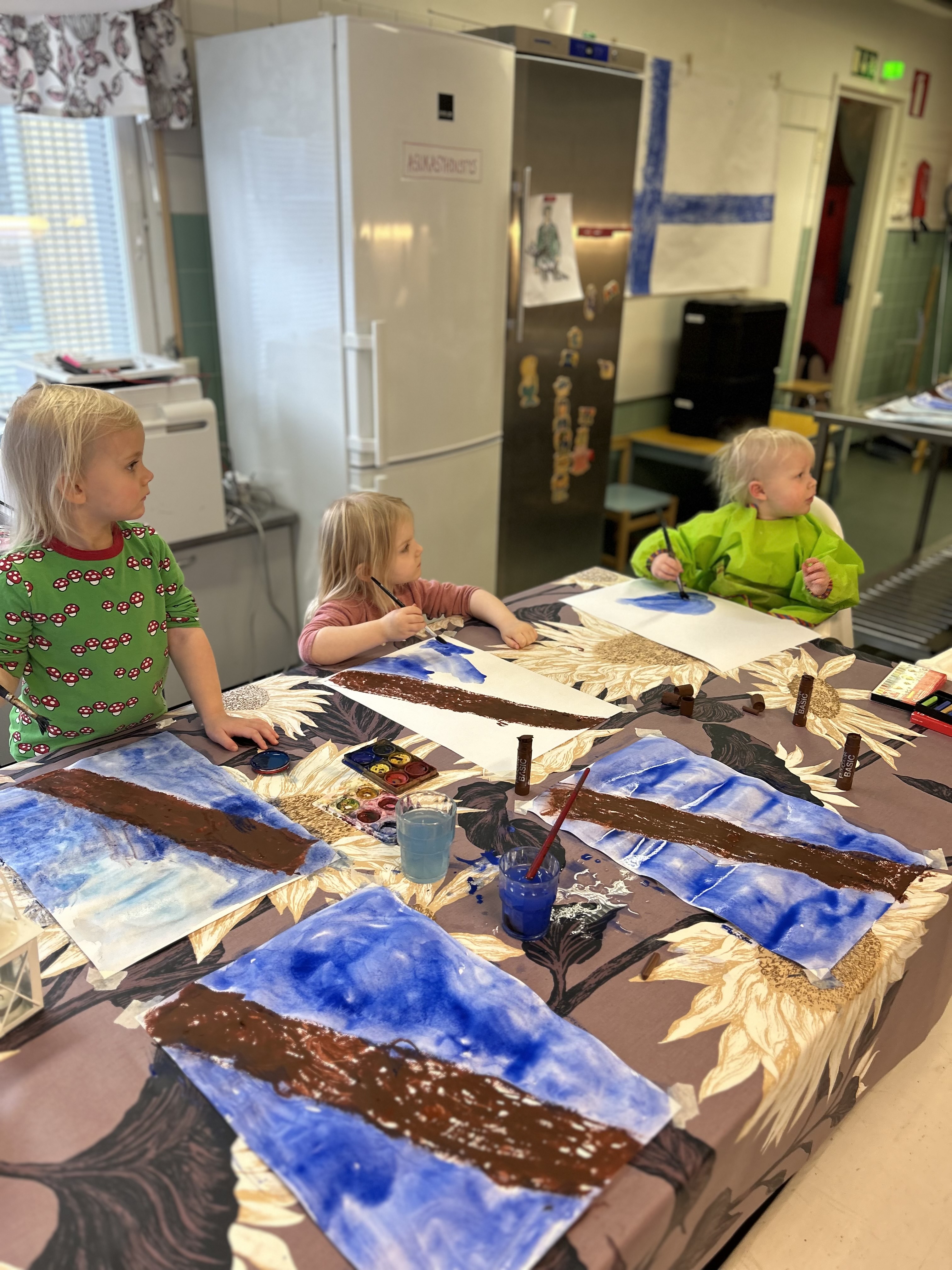 Kengurujen jälkeen teimme tuttavuutta koala karhujen kanssa ja aloitimme askartelun taustan laveeraamisella. Vesiväreillä tekeminen oli pitkästä aikaa oikein mieluista puuhaa ja lapset innostuivat maalaamaan todenteolla 🙂