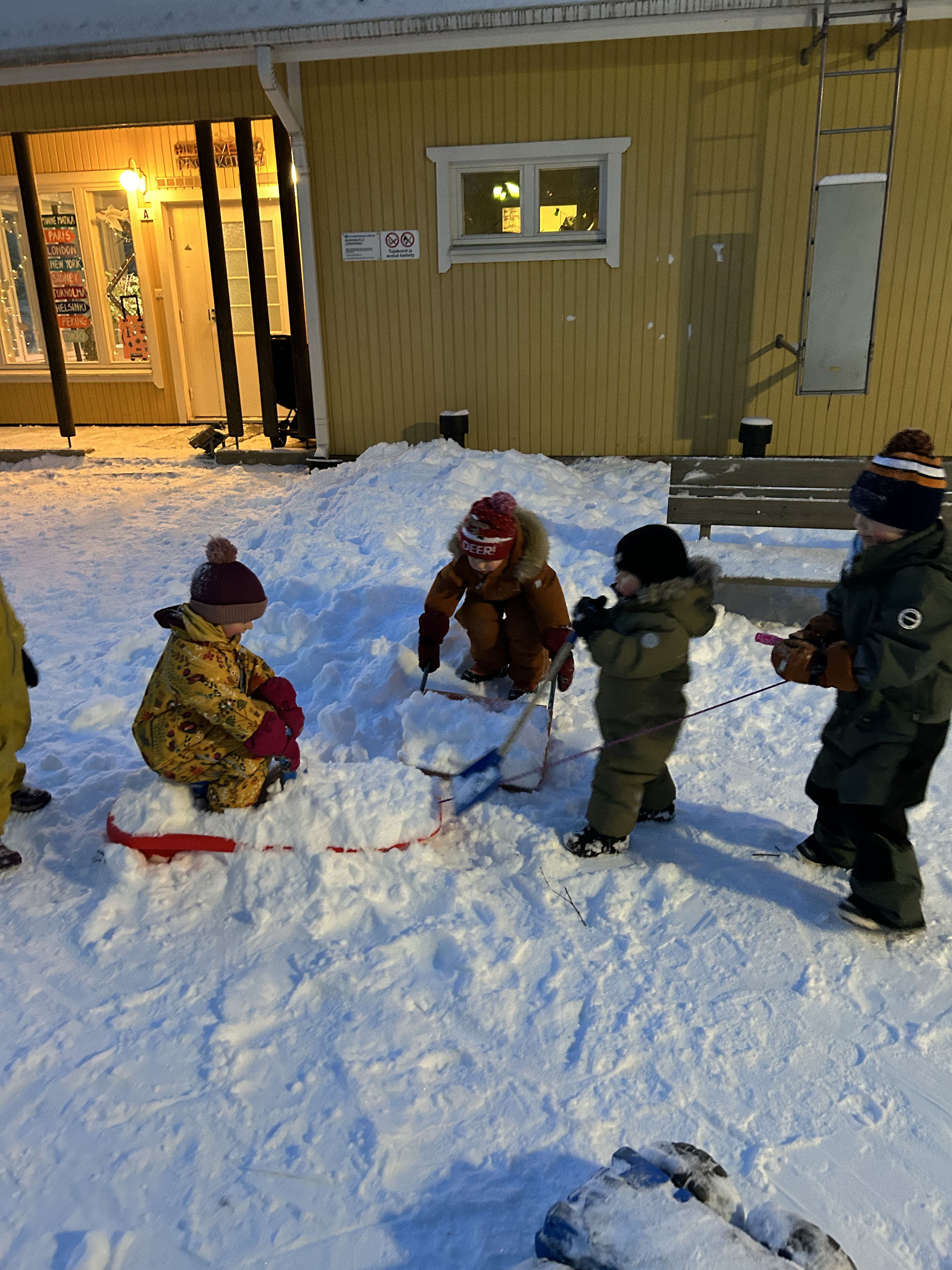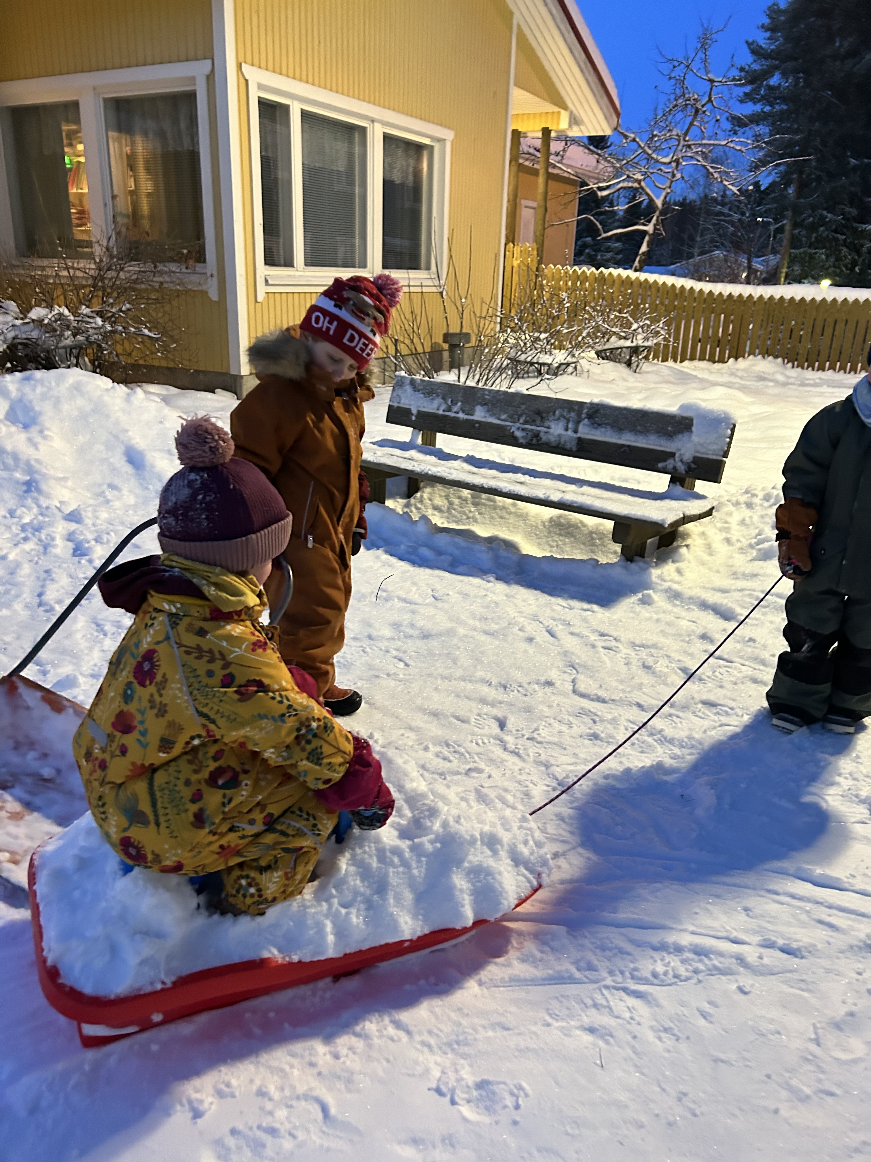 Lapset tekivät leikkeihinsä lumikelkan 🙂