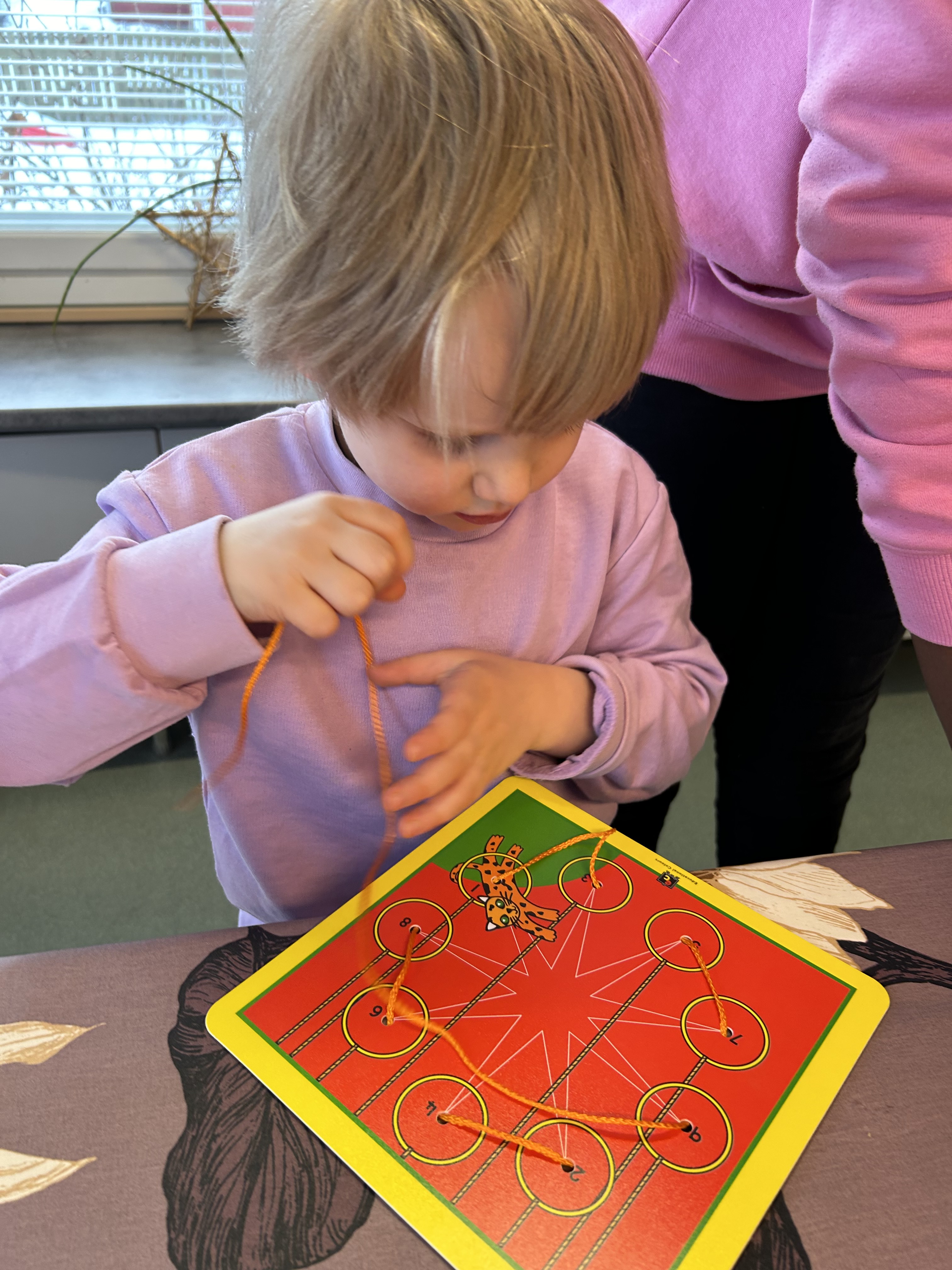 Viskarihommissa teimme tehtäväkortteja joihin pujoteltiin lankaa numeroiden mukaan, tässä vaadittiin hahmottamista ja hieman numeroiden tuntemista.
