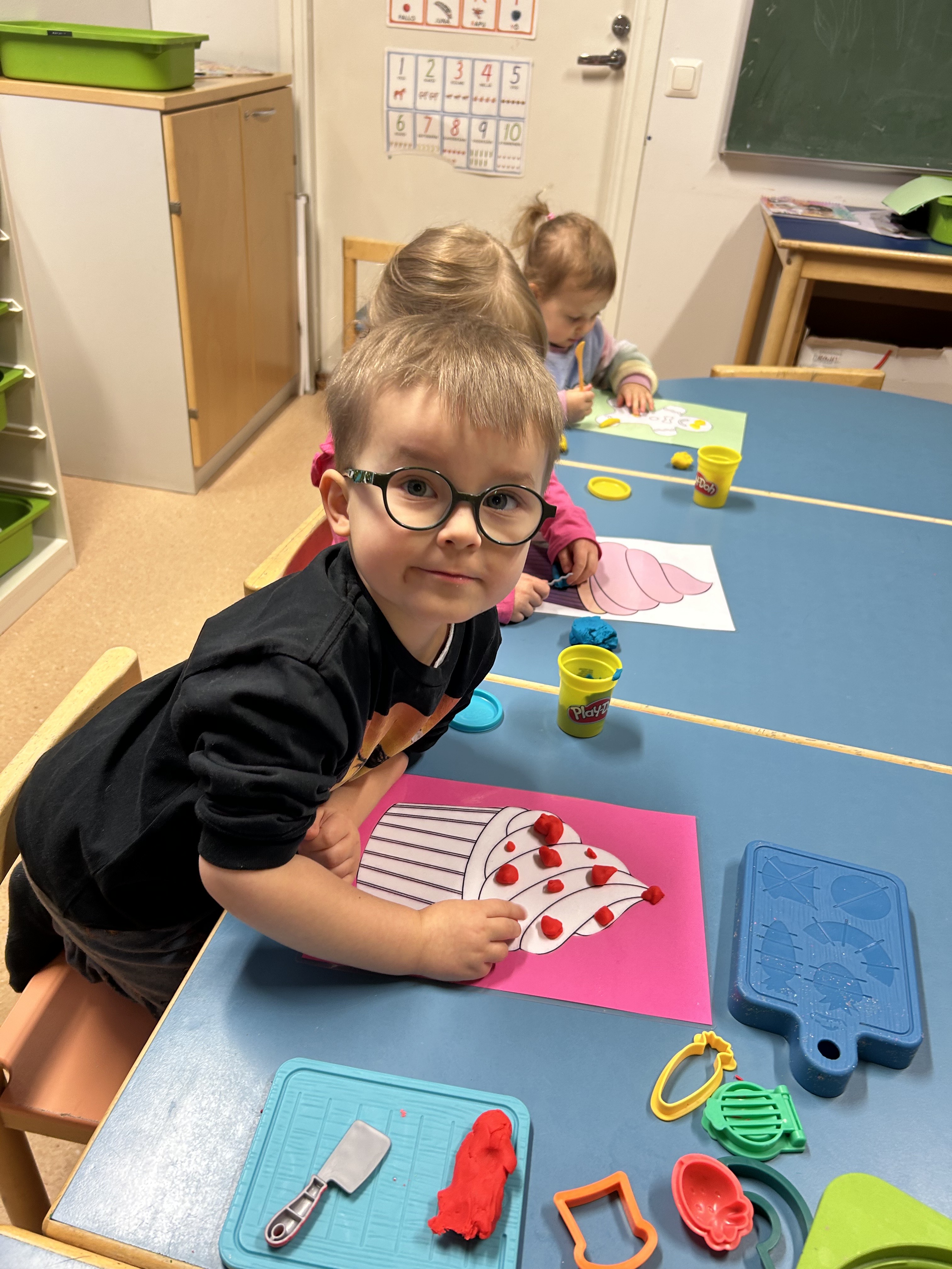 Lisäsimme mielenkiintoa muovailuun ja ideoimme lapsille erilaisia muovailualustoja, joita he voivat haluamallaan tavalla koristella. Alustoista löytyy mm. jätskejä ja leivonnaisia 🙂