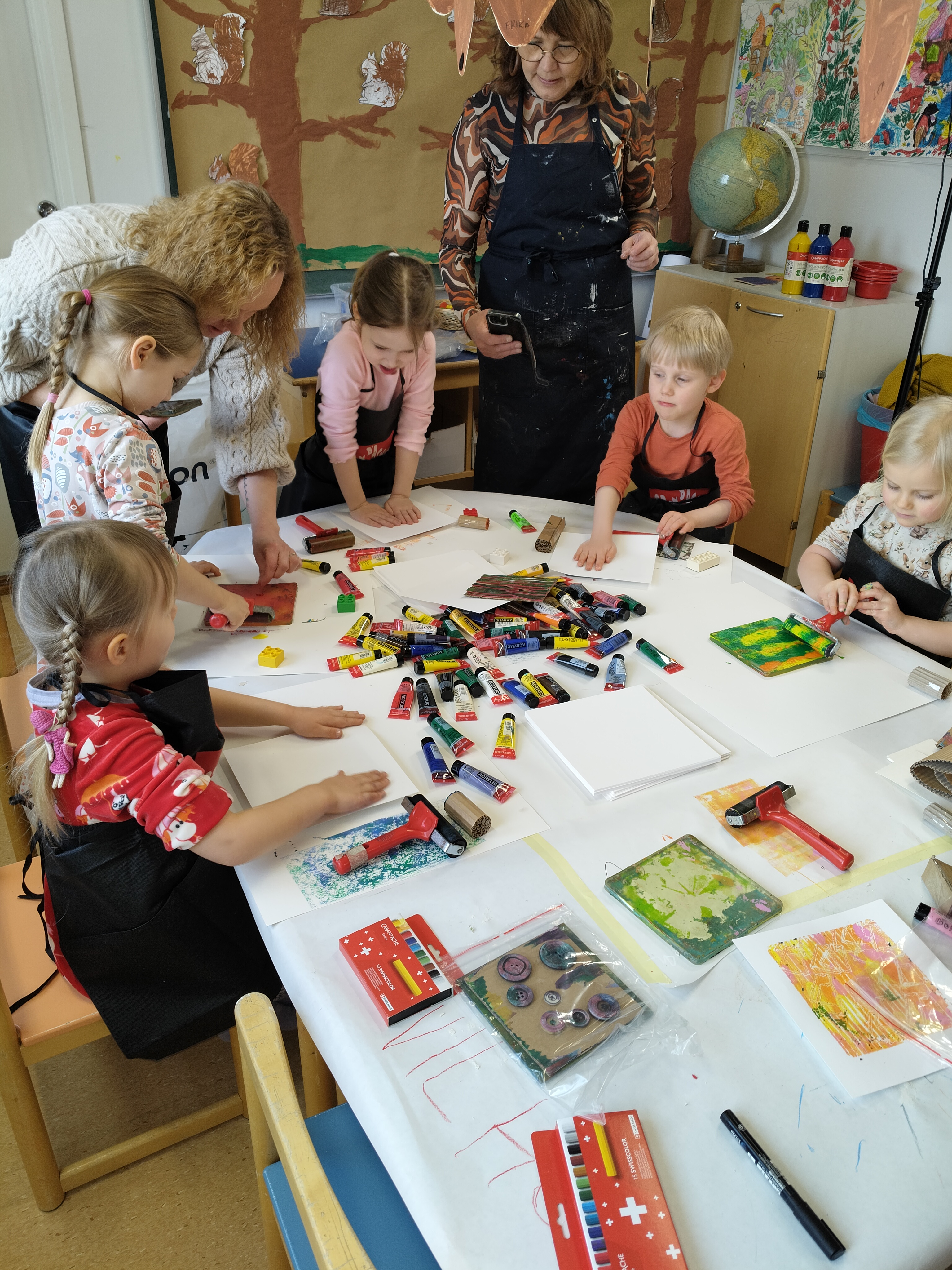 Manner Taidetarvikkeen väki kävi päiväkodillamme pitämässä lapsille työpajaa ja kuvaamassa lapsia askartelemassa. Lapset pääsivät kokeilemaan paperimassa-askartelua, monoprinttien painantaa gellilevyillä sekä lapset saivat värittää vahaliiduilla puputaulut ja viedä ne kotiin. Tämä oli hieno tilaisuus tutustua erilaisiin materiaaleihin ja askartelutekniikoihin, joita aiomme käyttää jatkossakin. Lapset tykkäsivät kovasti 🙂 Kiitos Manner Taidetarvikkeet!