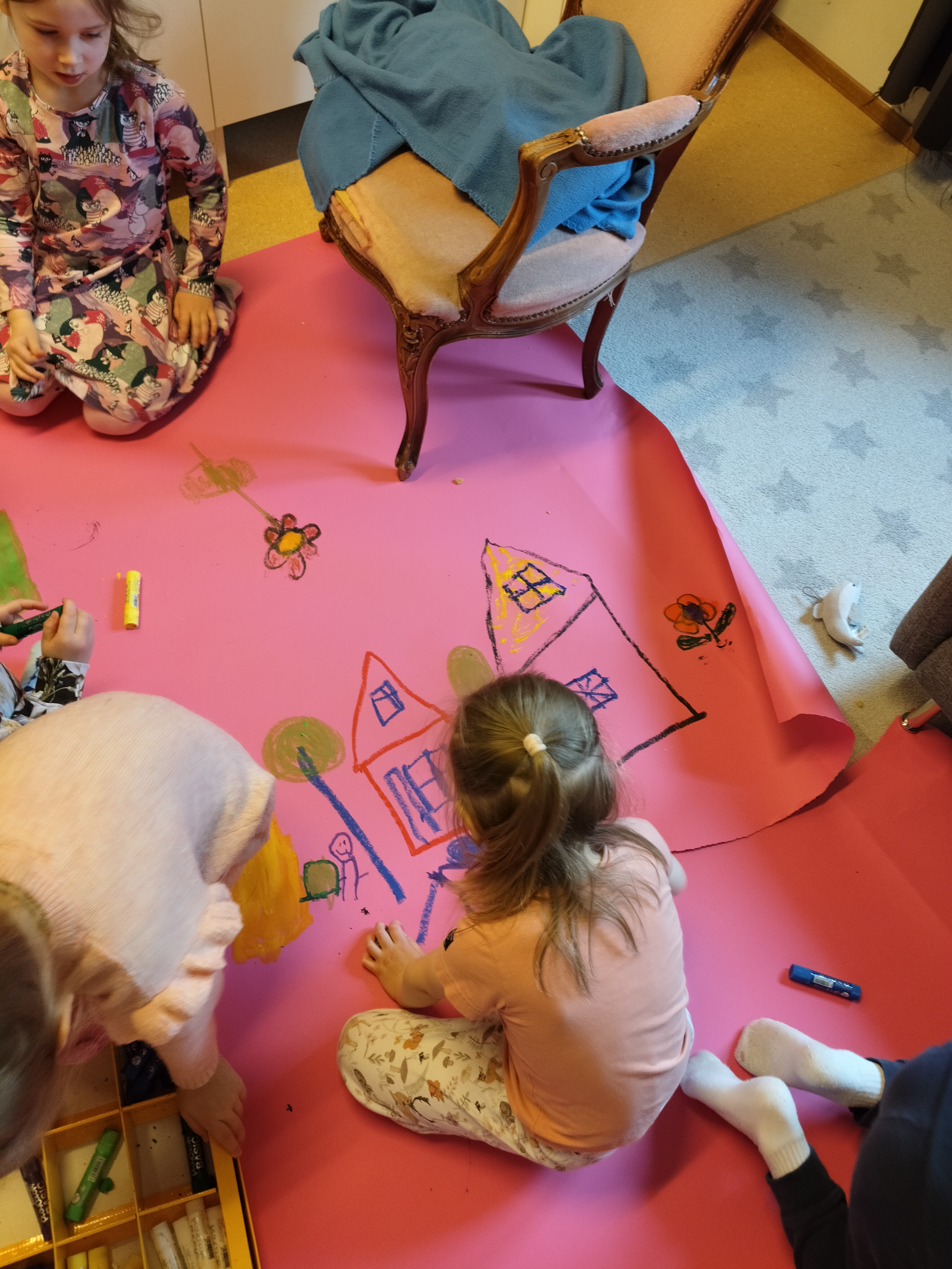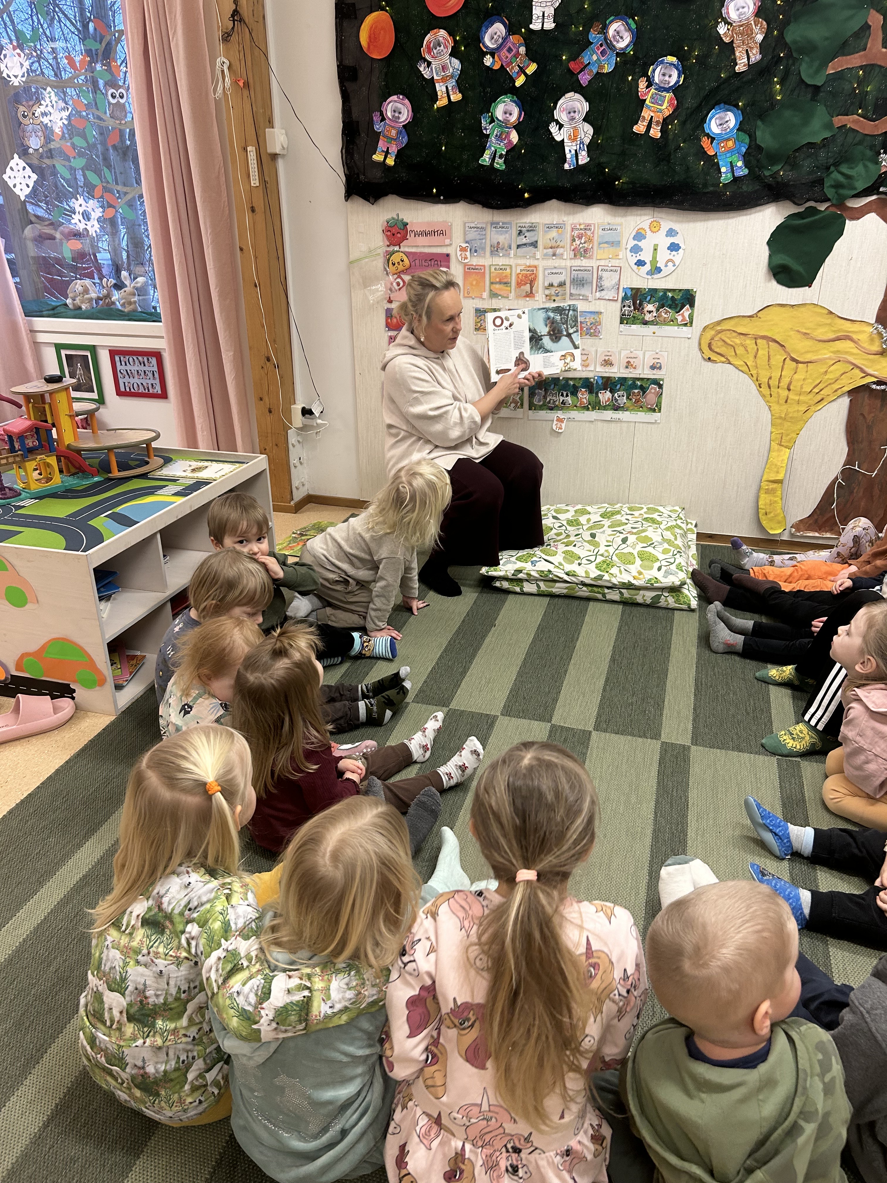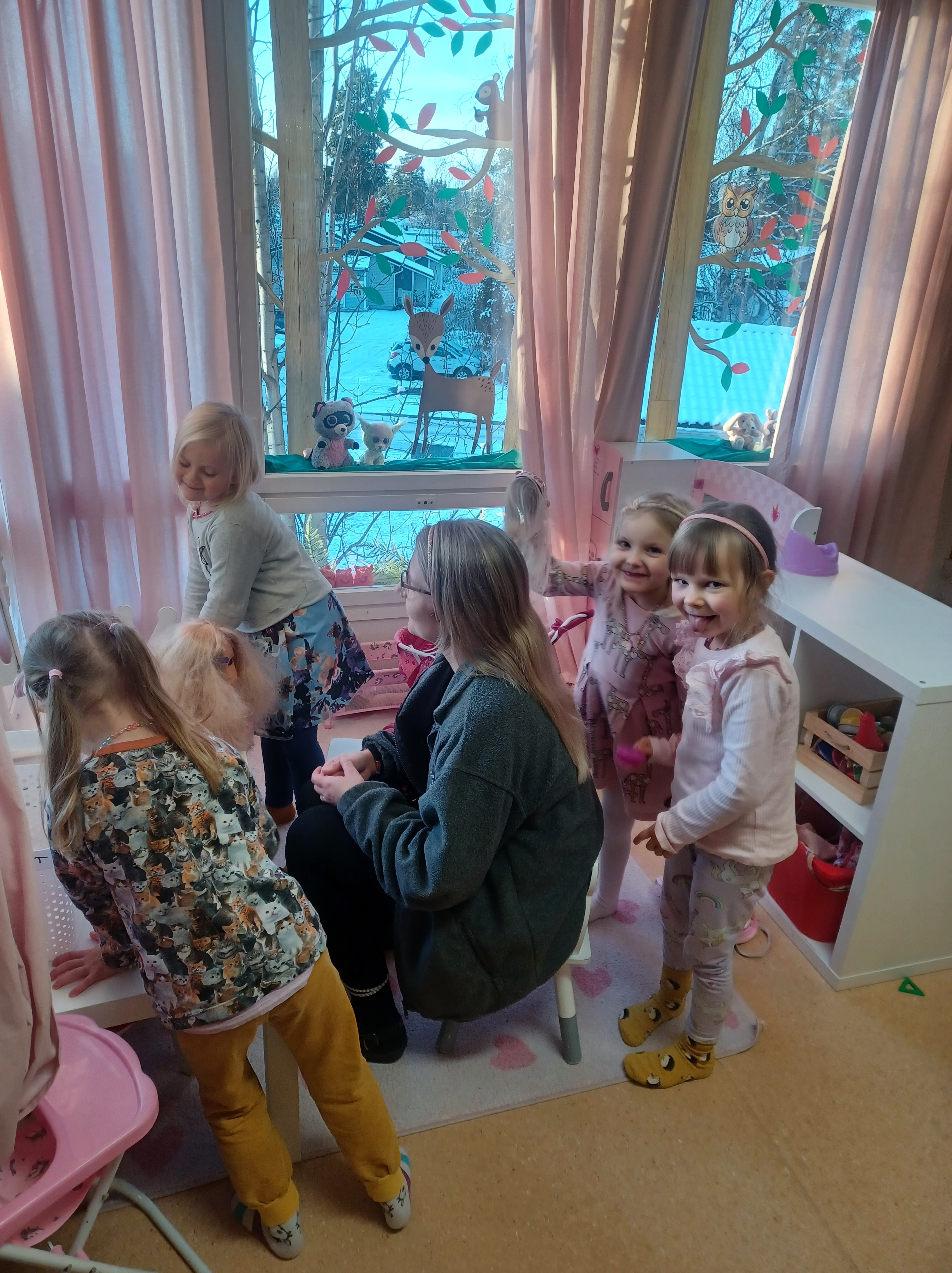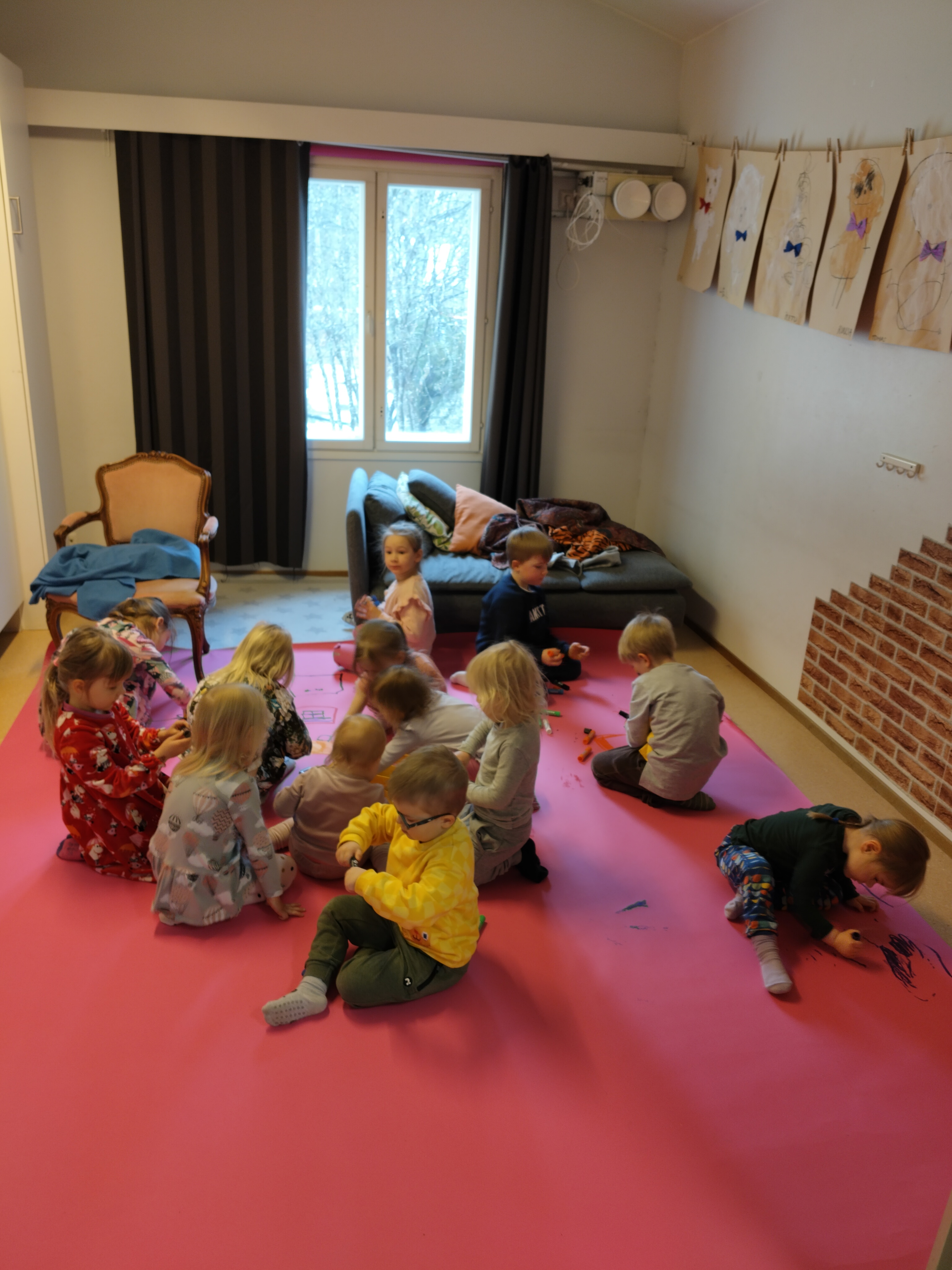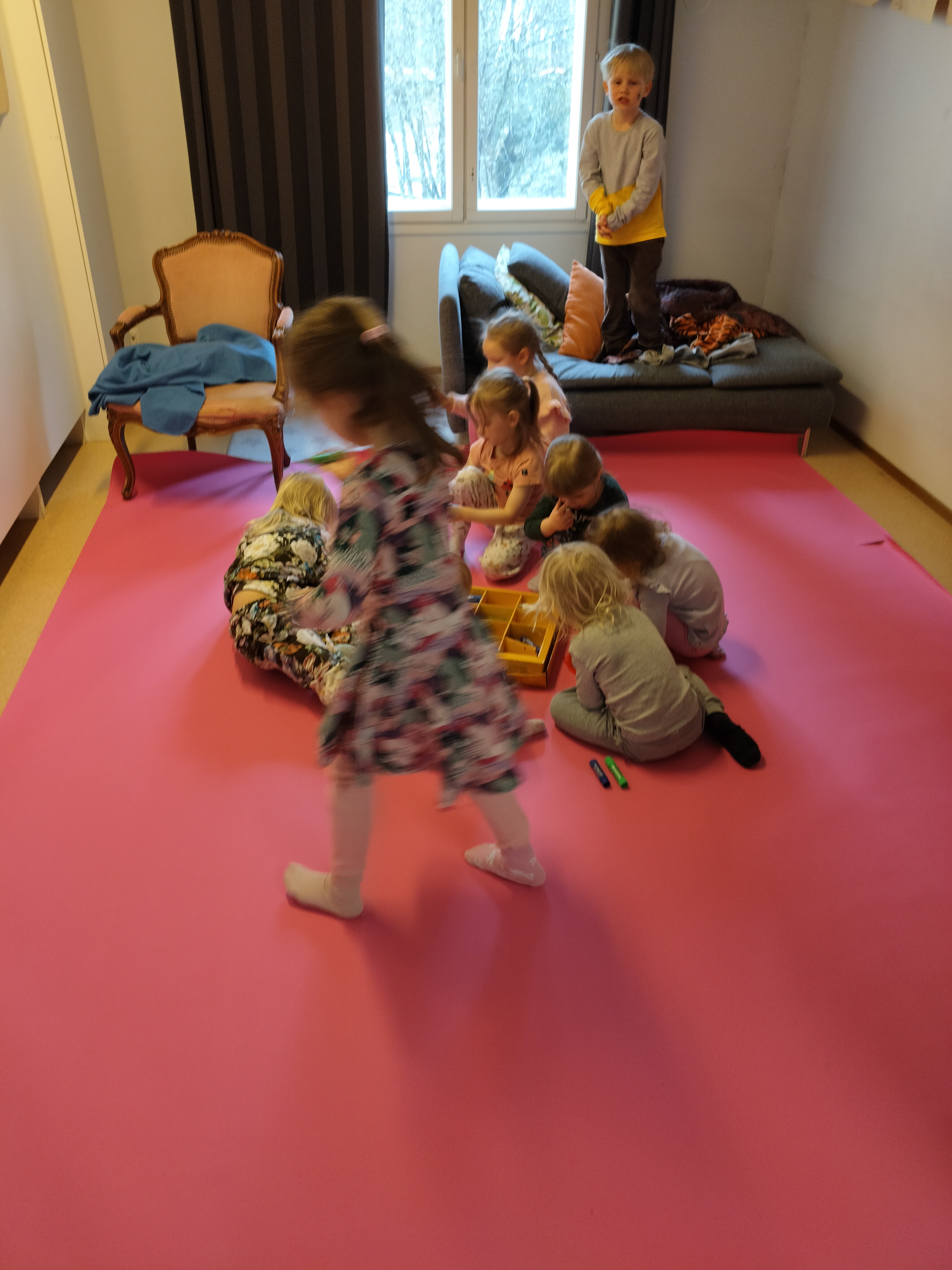 Lapset välillä innostuvat yhdessä leikkimään päiväkotia ja tässä on meneillä aamupiiri. Uudet värityskirjat ovat myös olleet jatkuvassa käytössä