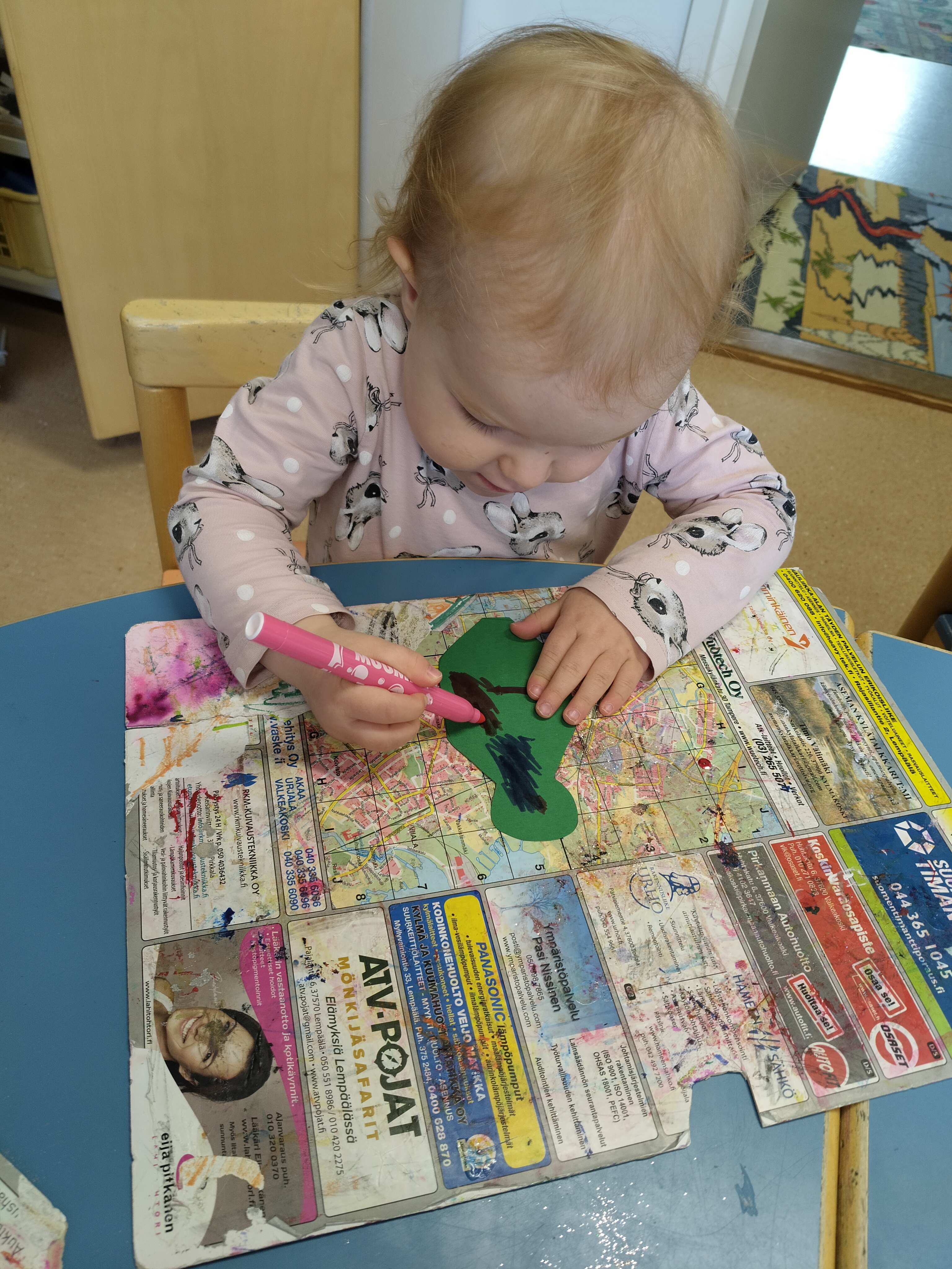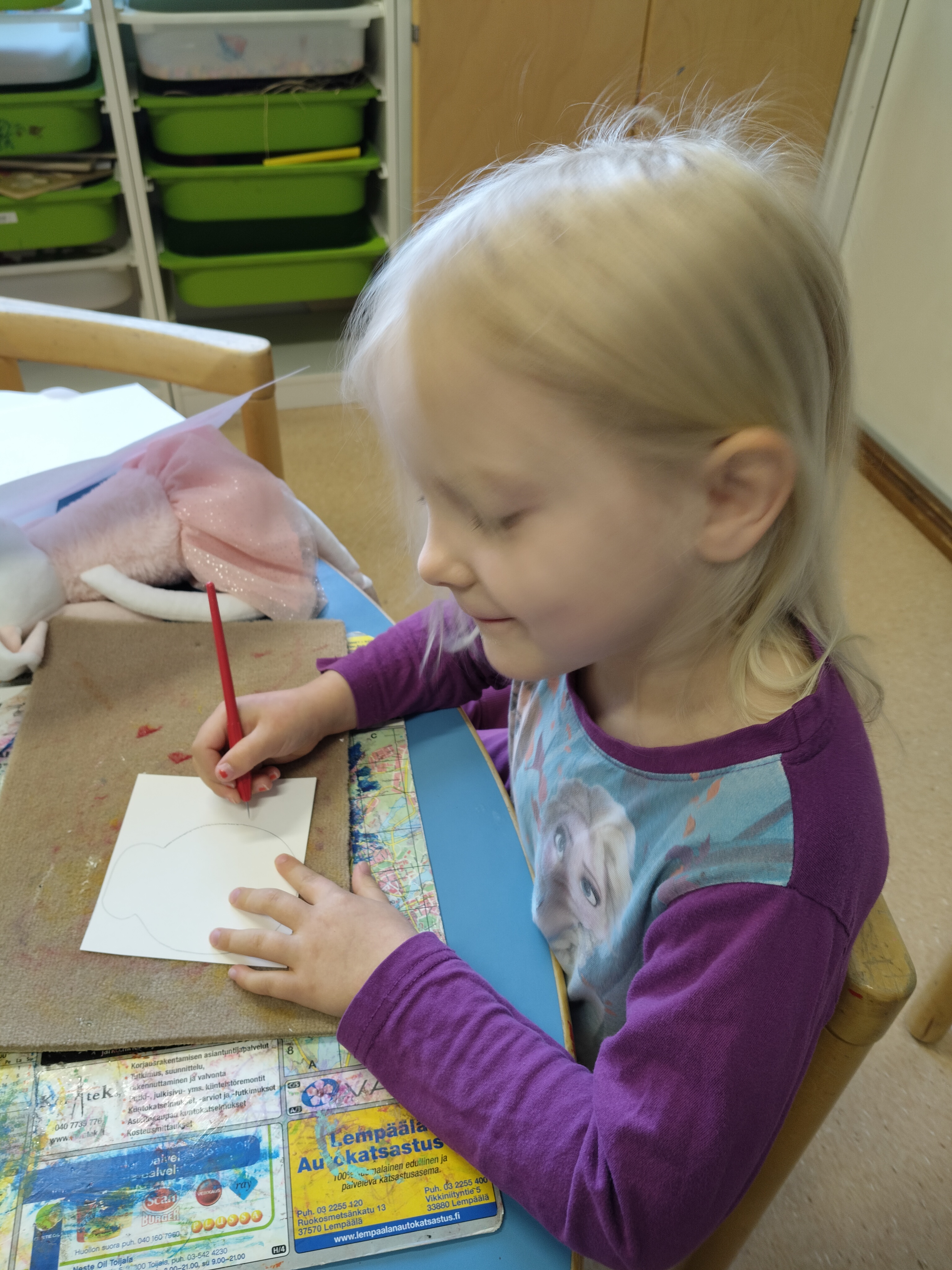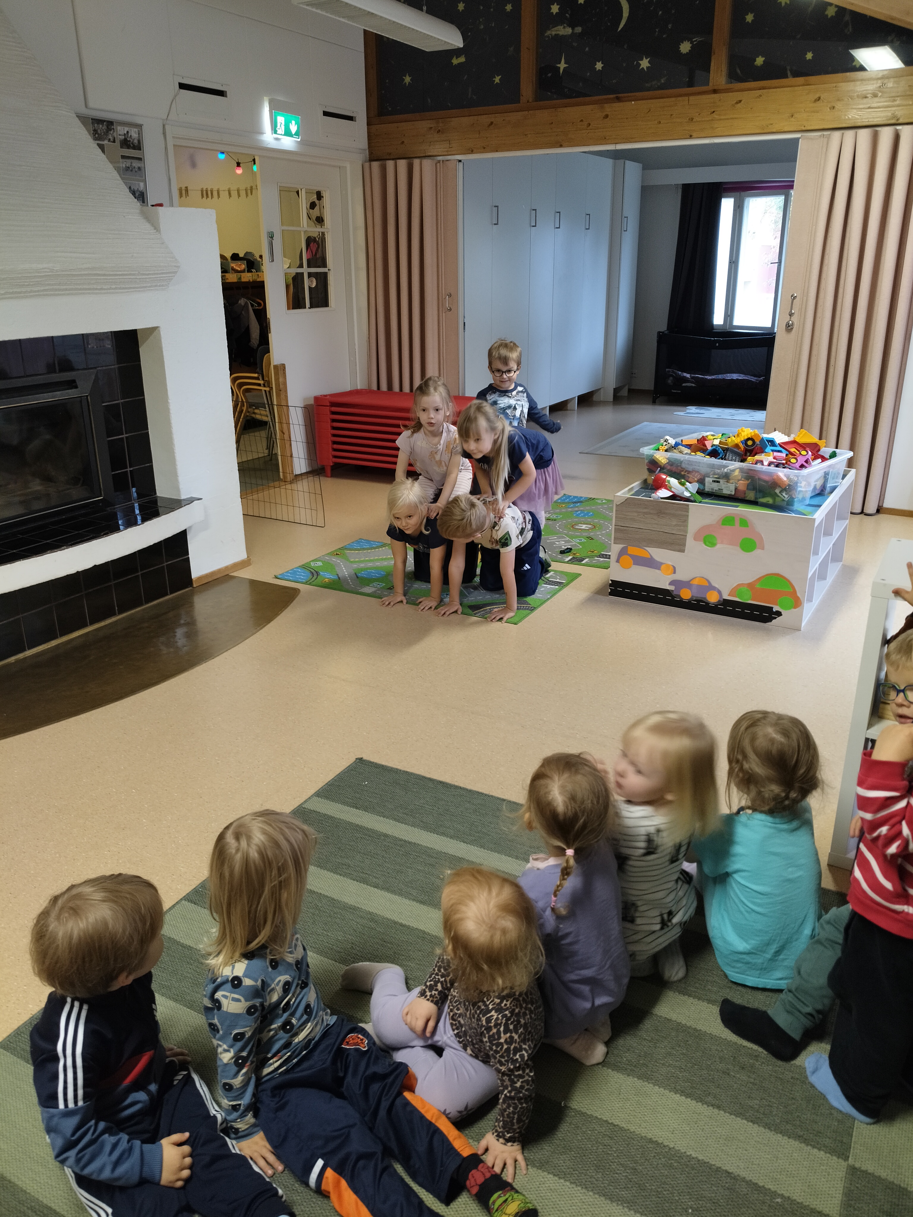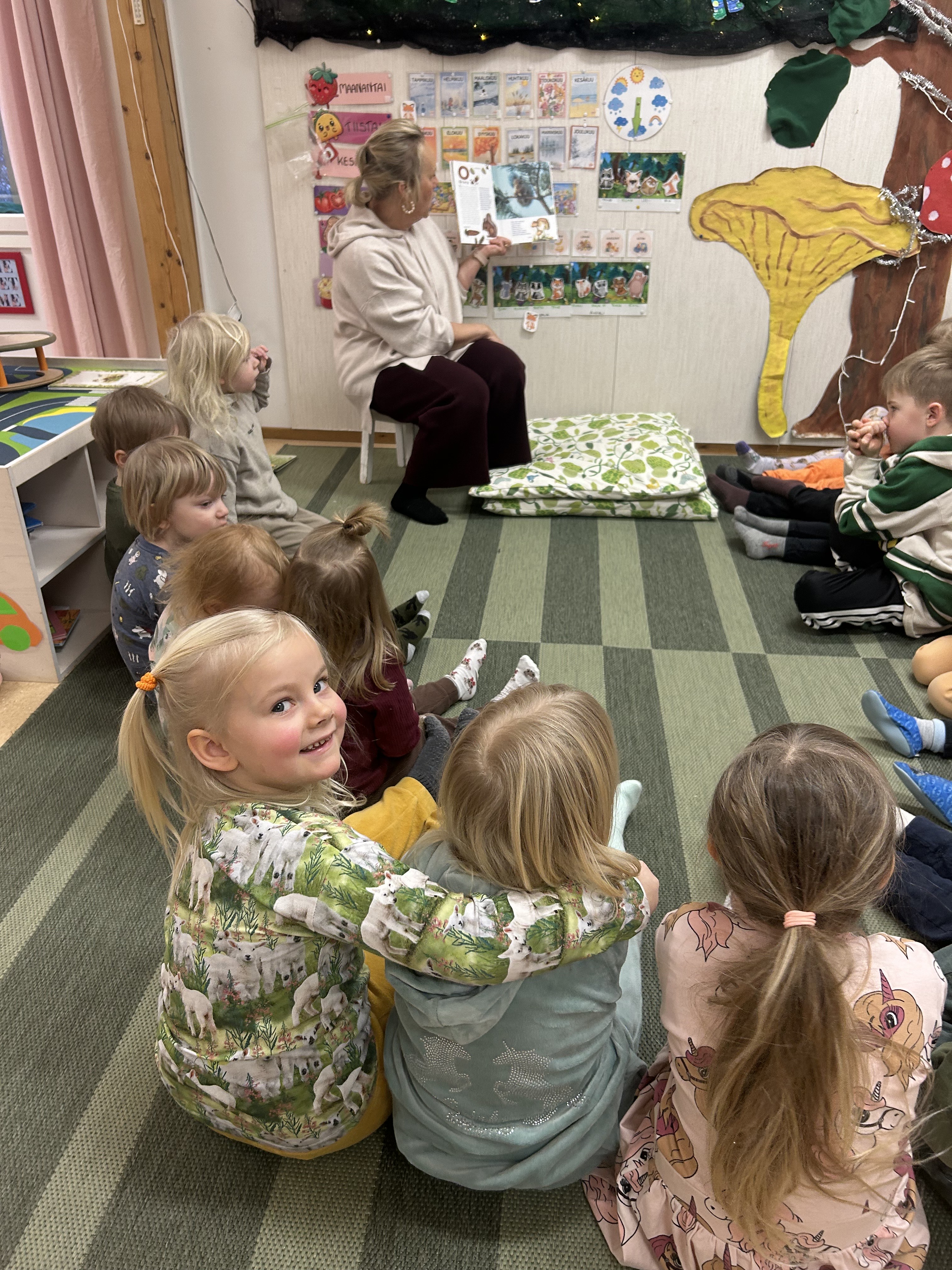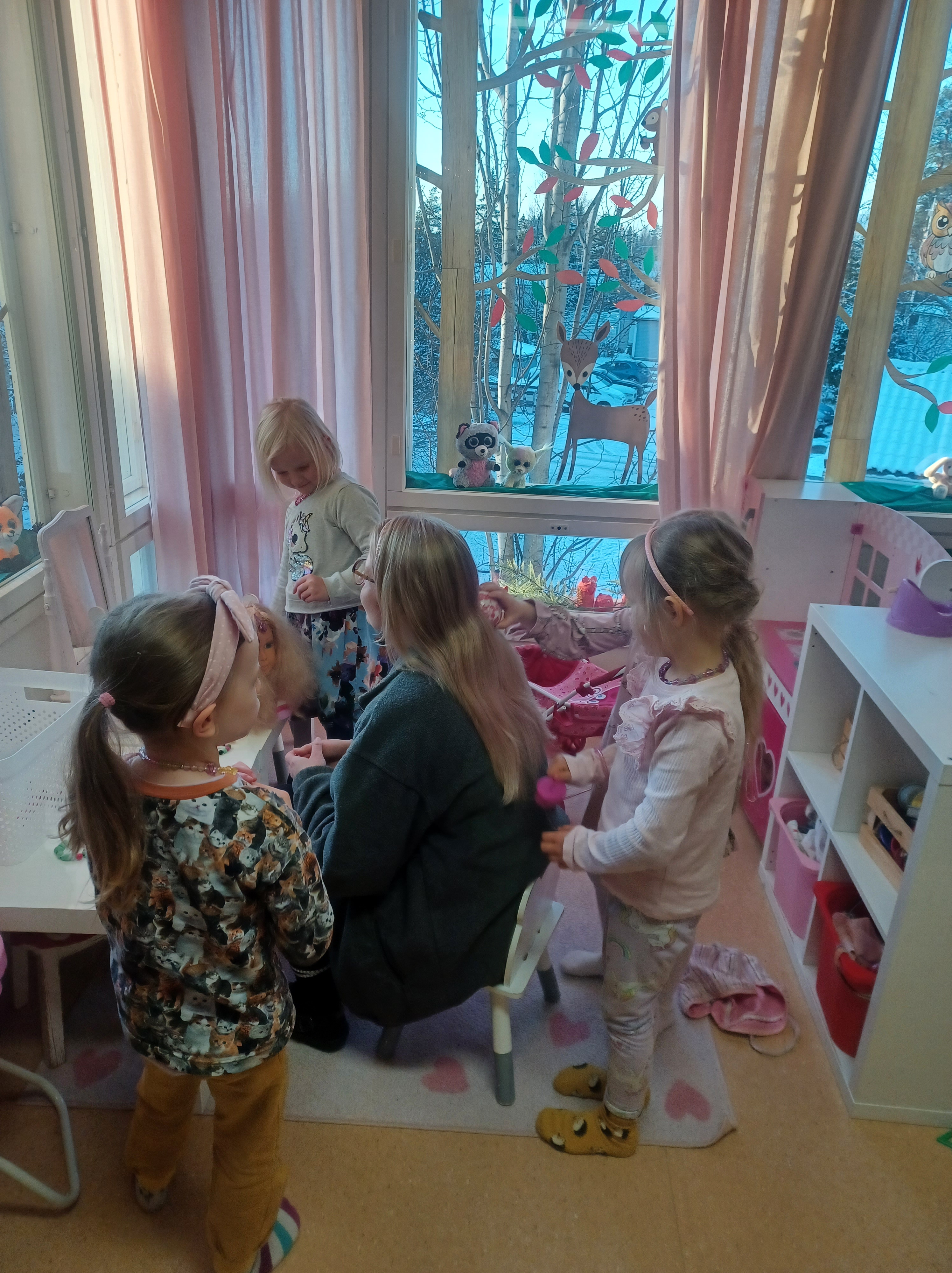 Lapset välillä innostuvat yhdessä leikkimään päiväkotia ja tässä on meneillä aamupiiri. Uudet värityskirjat ovat myös olleet jatkuvassa käytössä