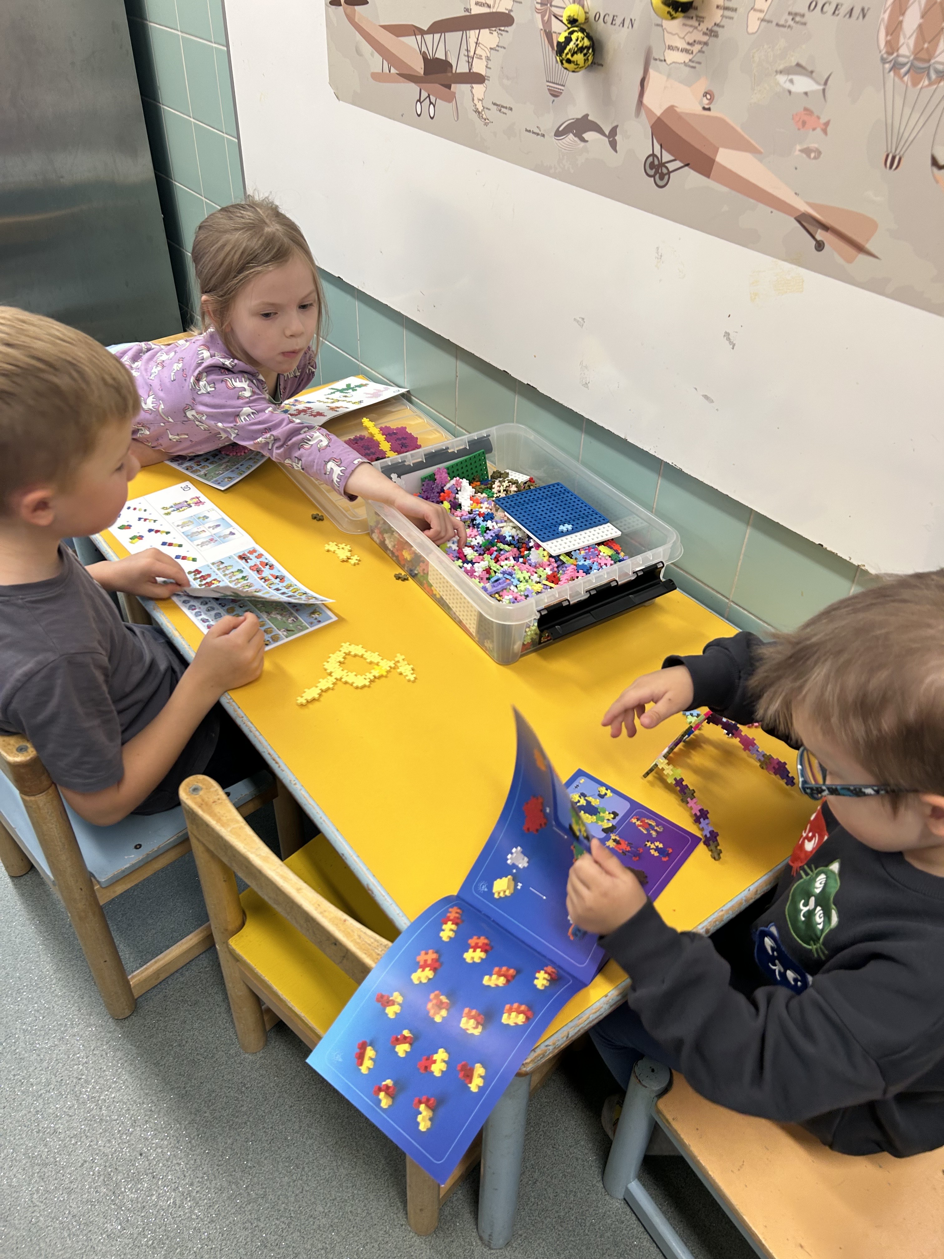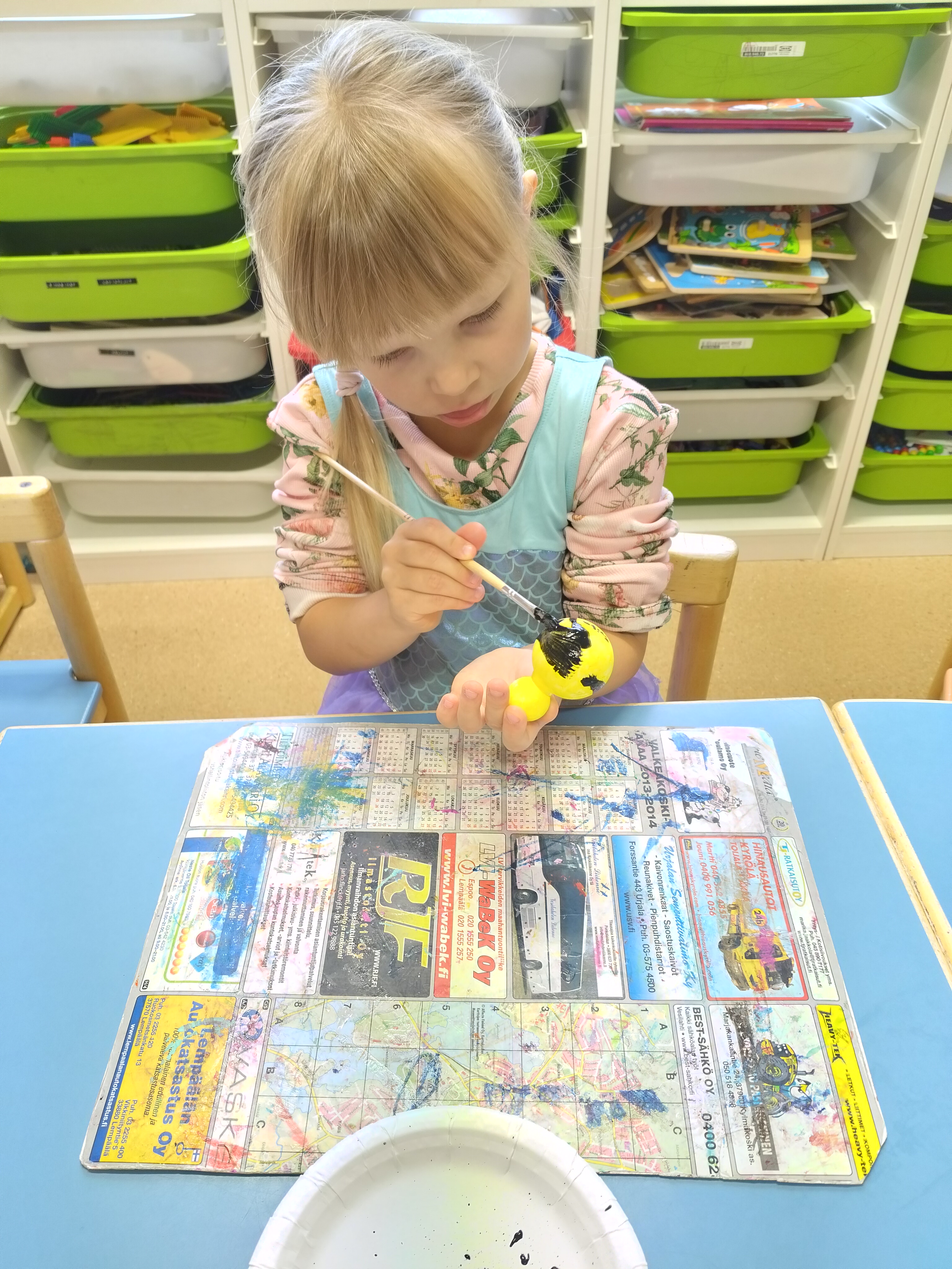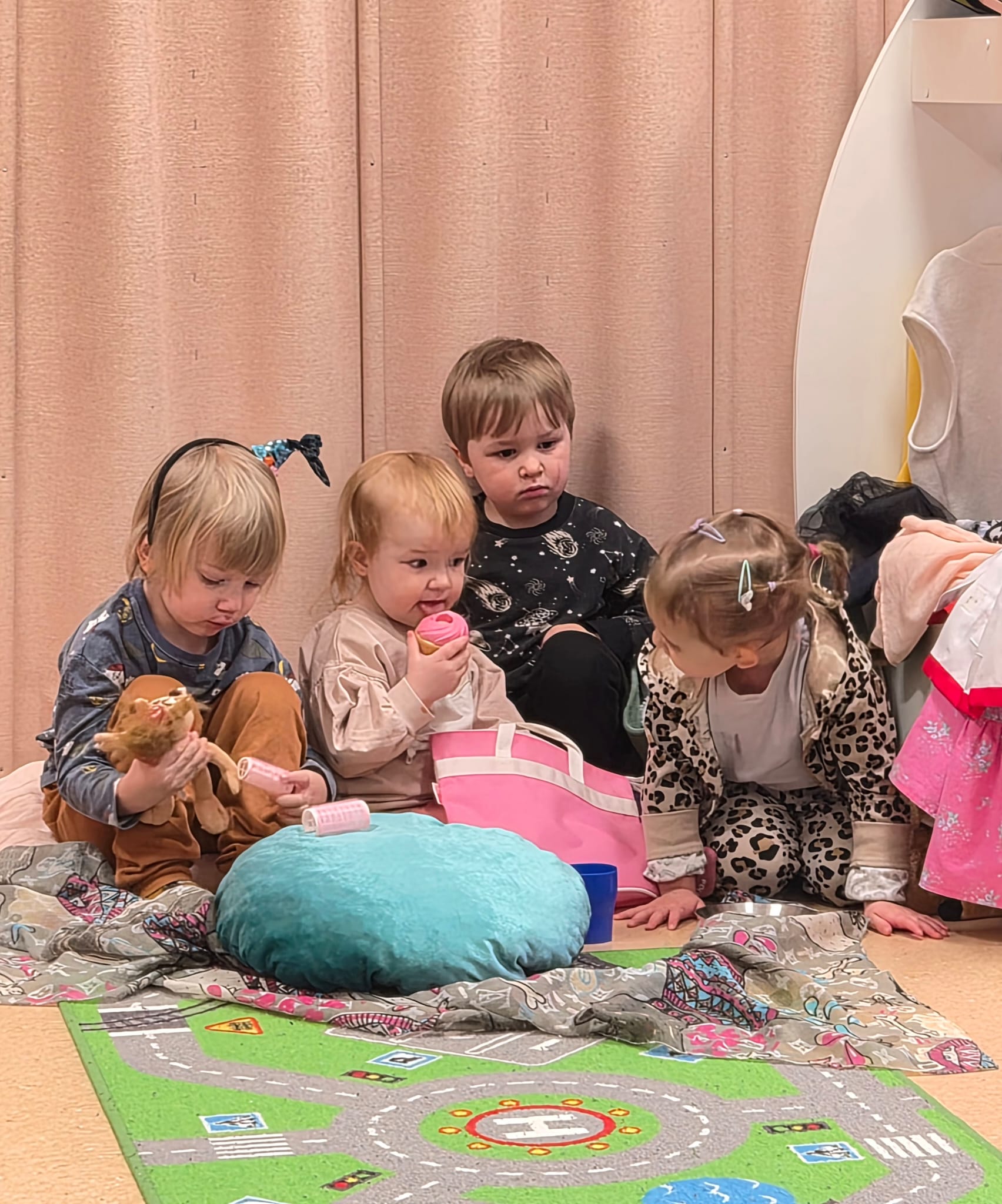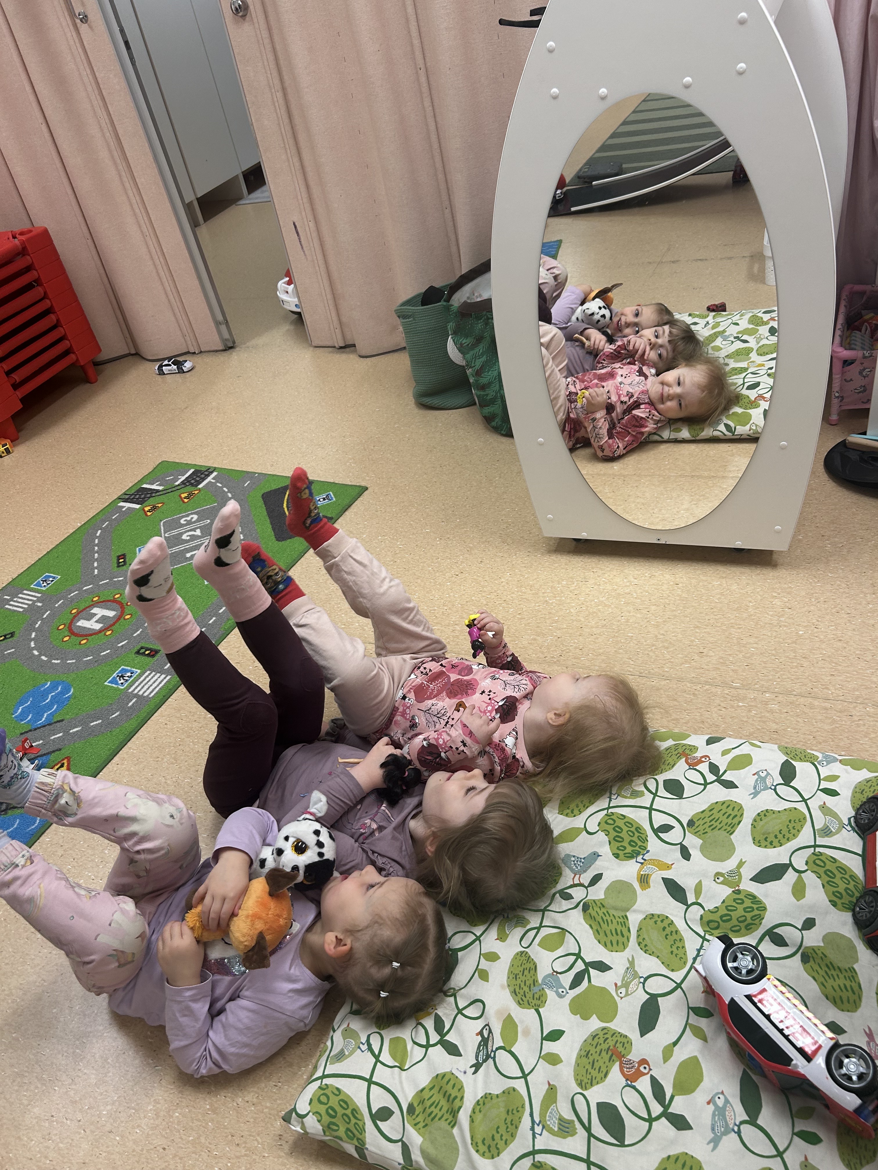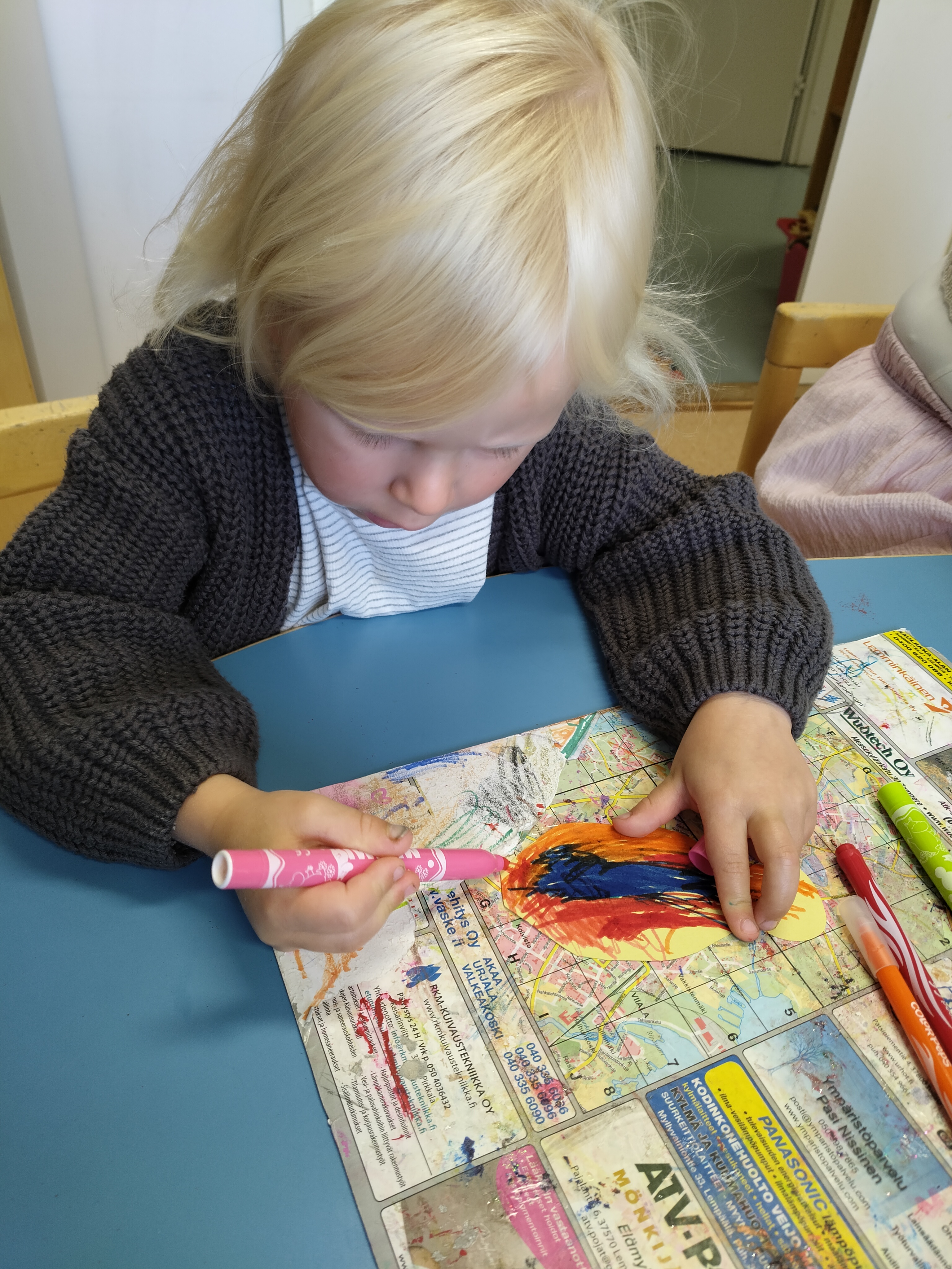 Lapset välillä innostuvat yhdessä leikkimään päiväkotia ja tässä on meneillä aamupiiri. Uudet värityskirjat ovat myös olleet jatkuvassa käytössä