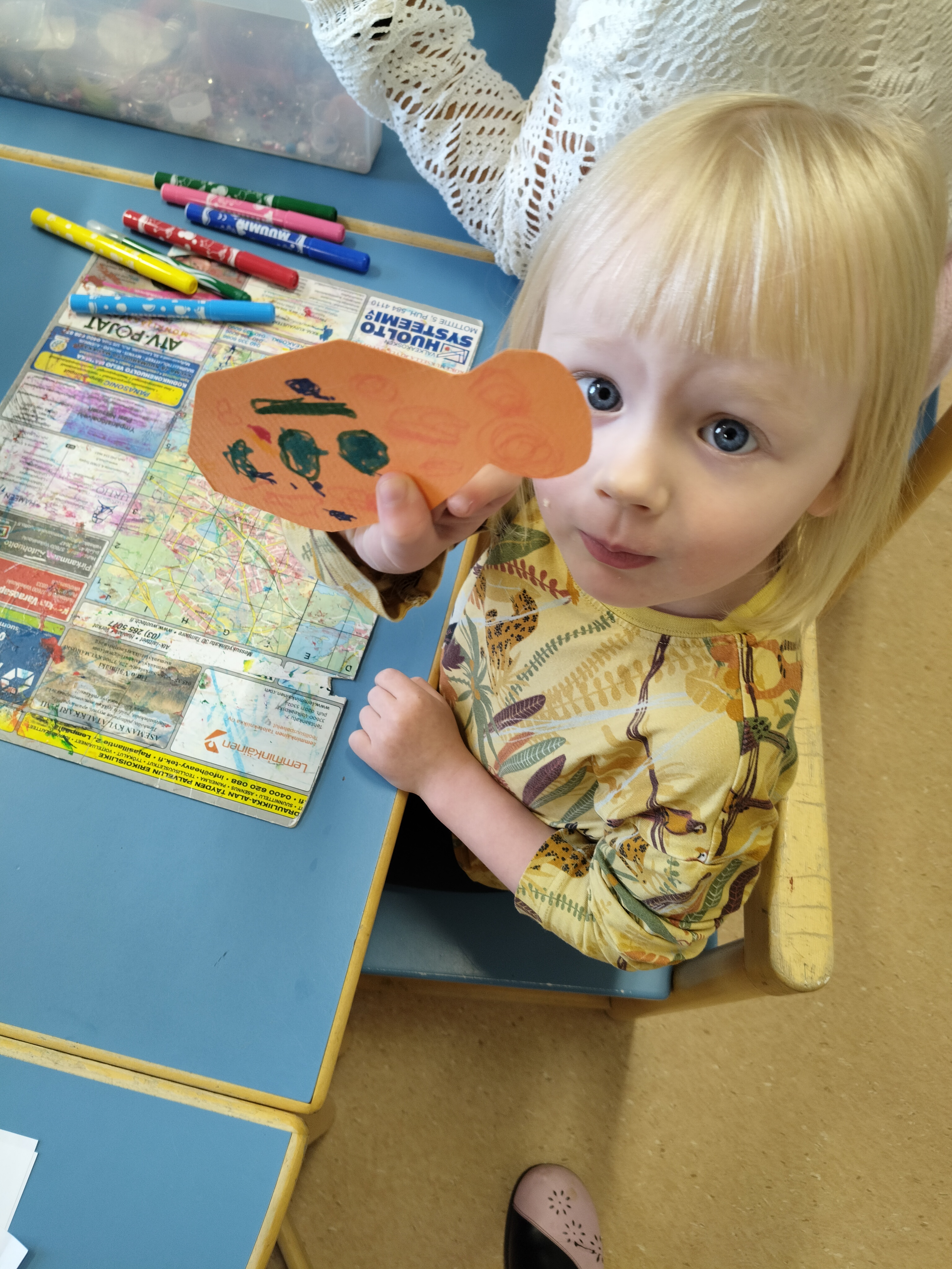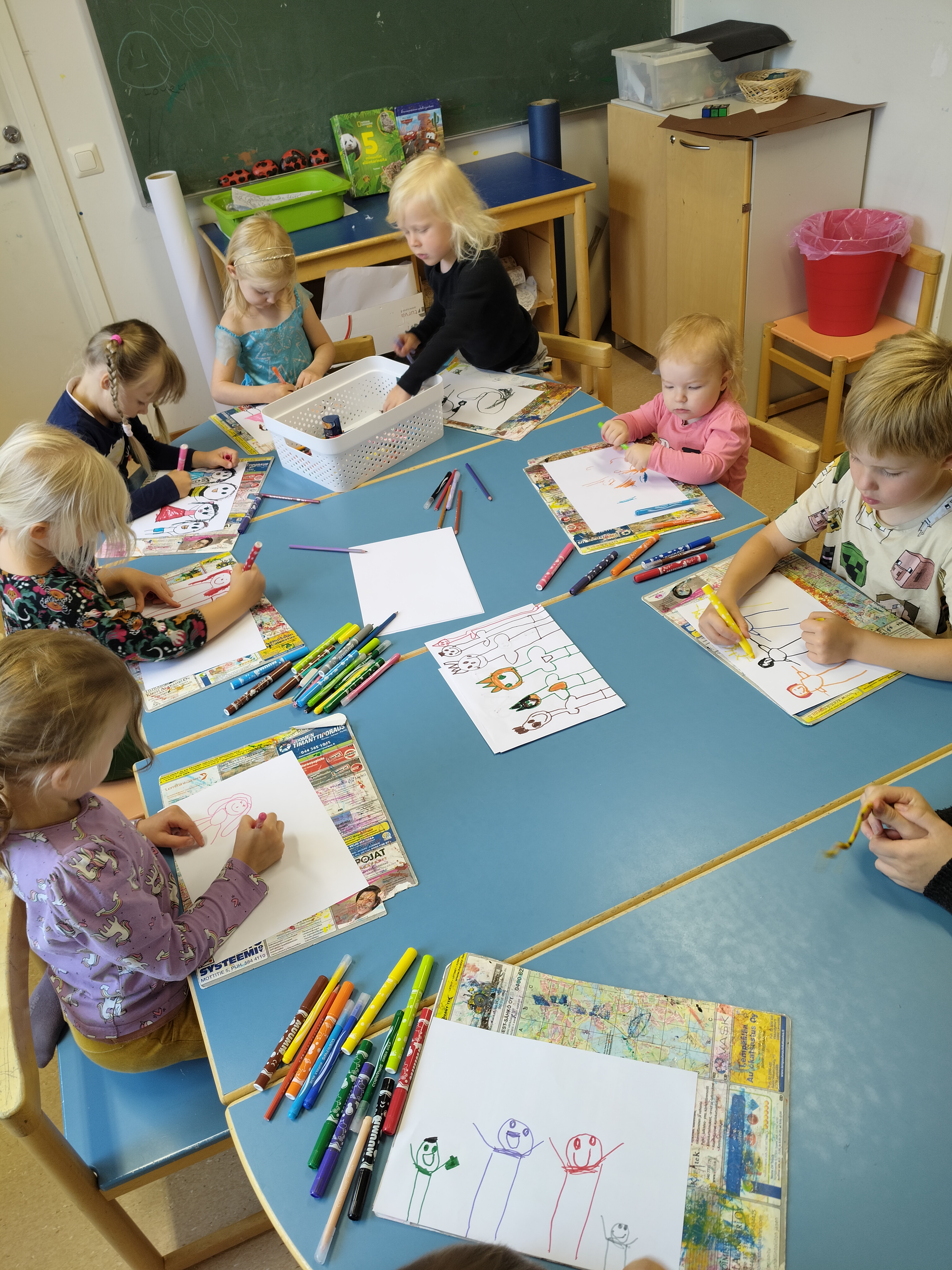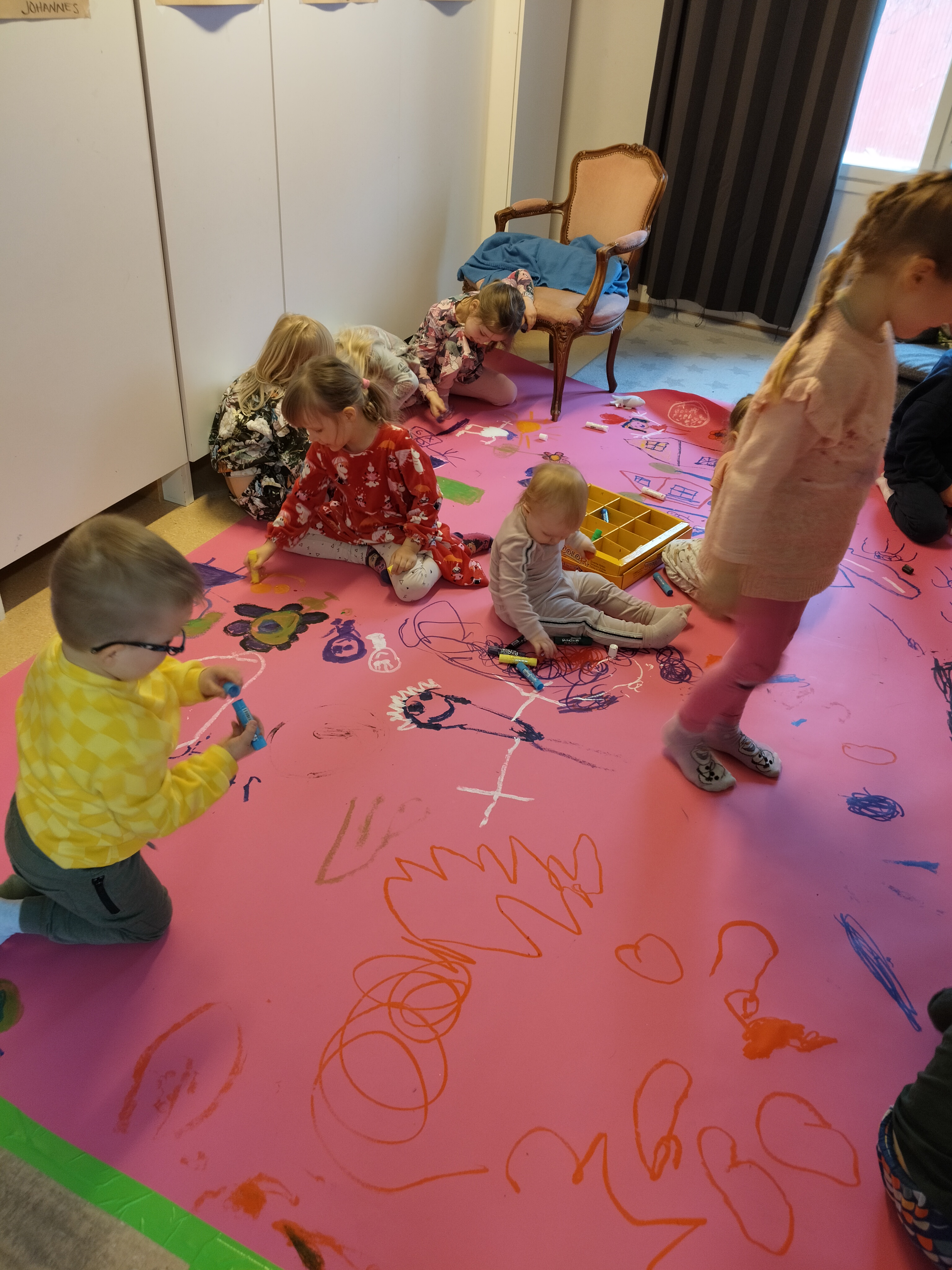 Kevätriehan jäljiltä nukkariin jätettiin valokuvaustausta ja lapset saivat keskiviikkona improvisoida ja piirtää paperin täyteen mielikuvituksensa tuotosta 🙂 lopputulos oli mestariteos!