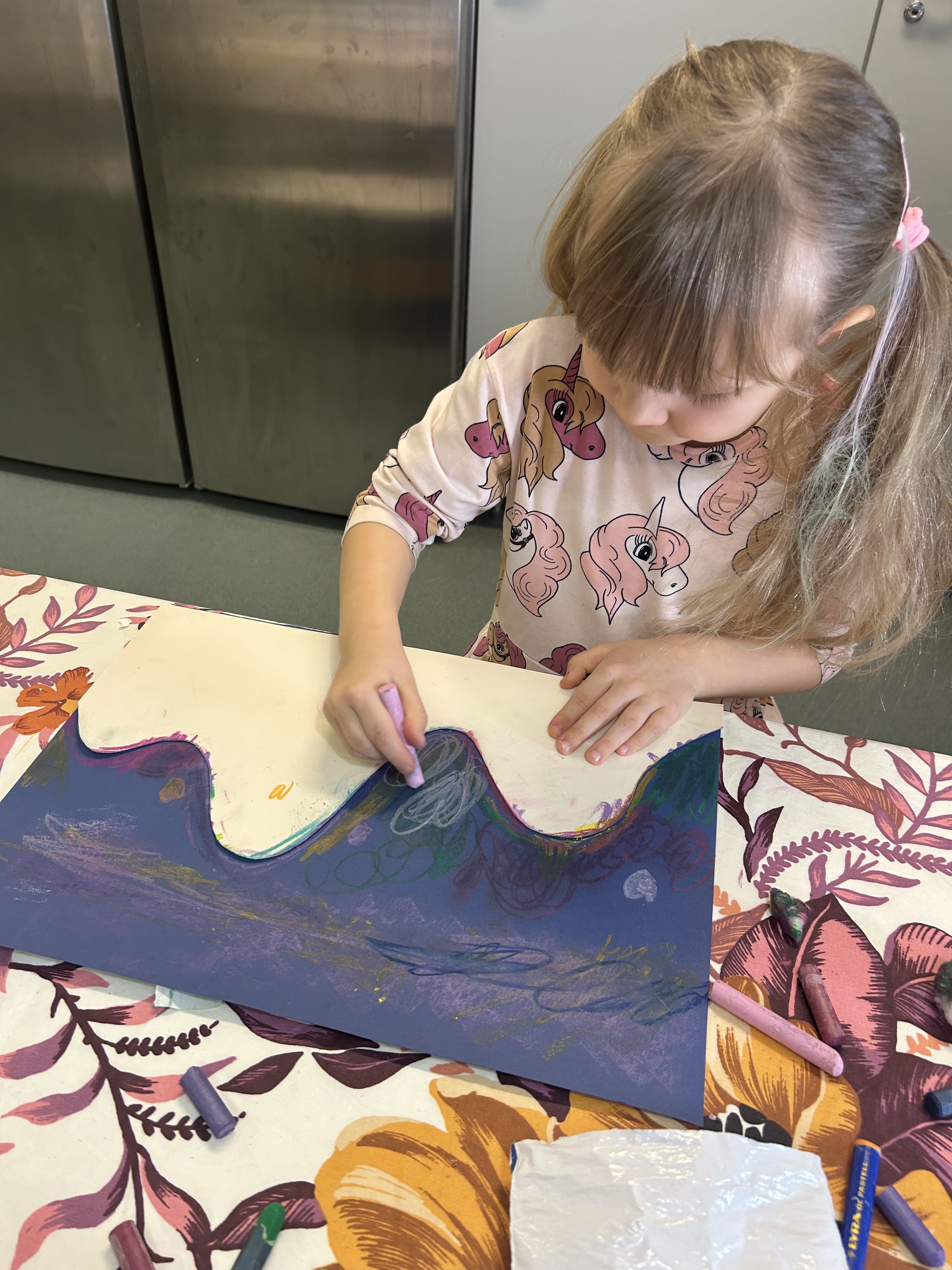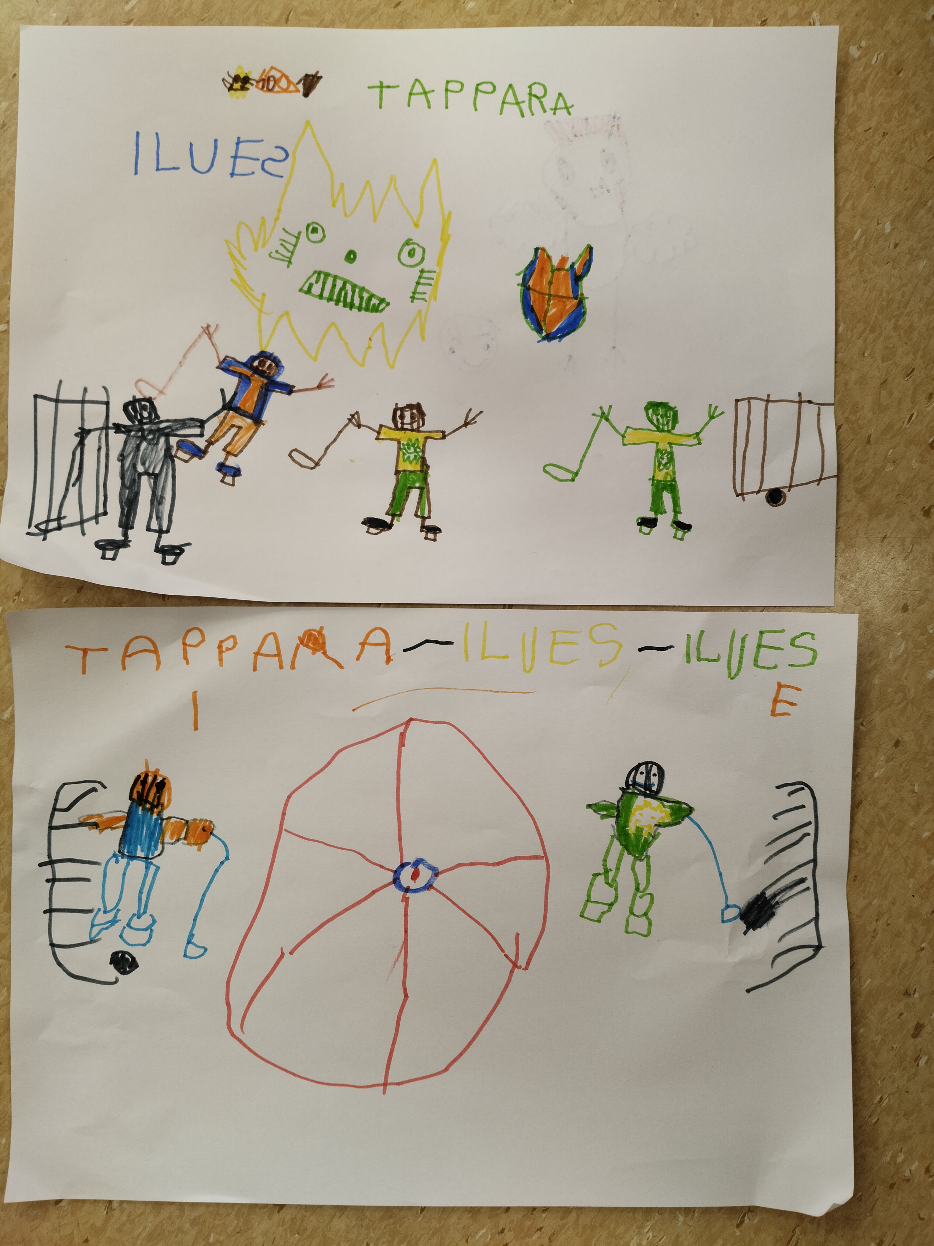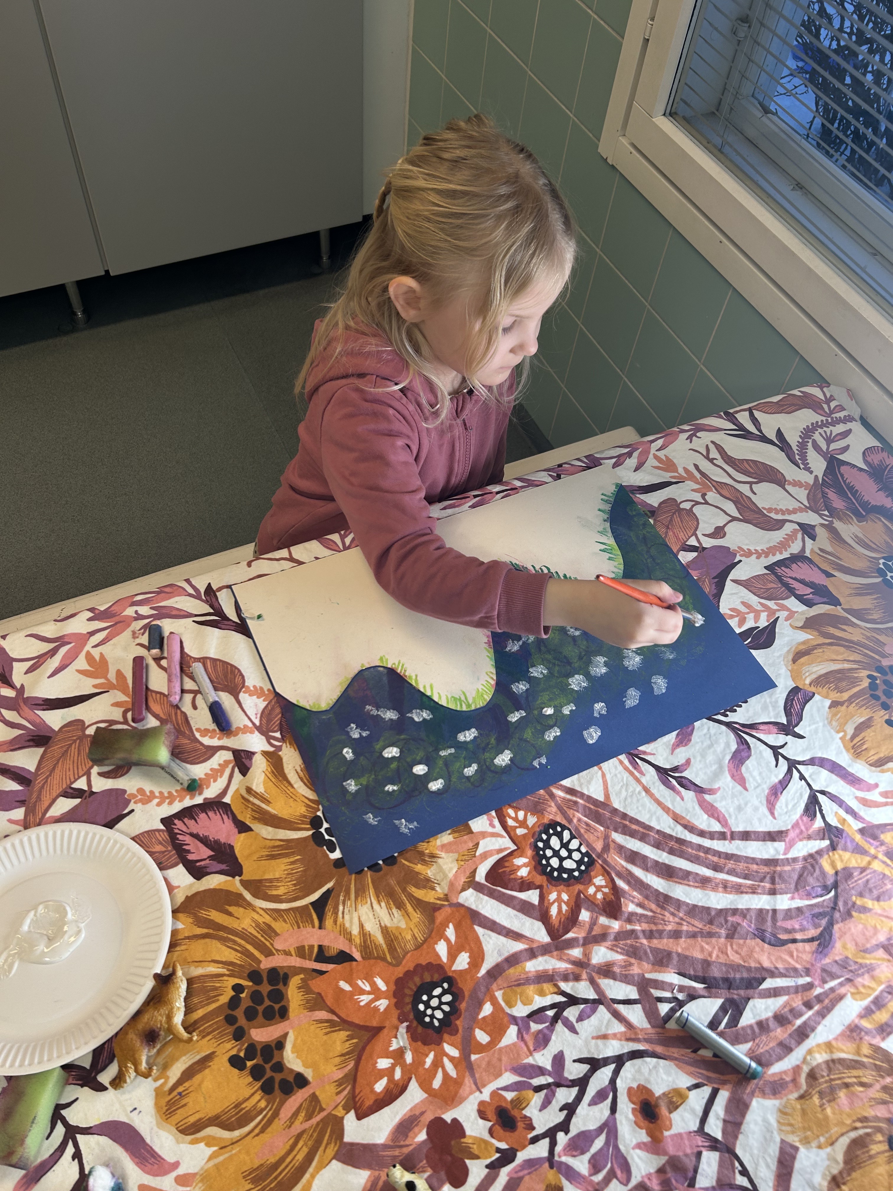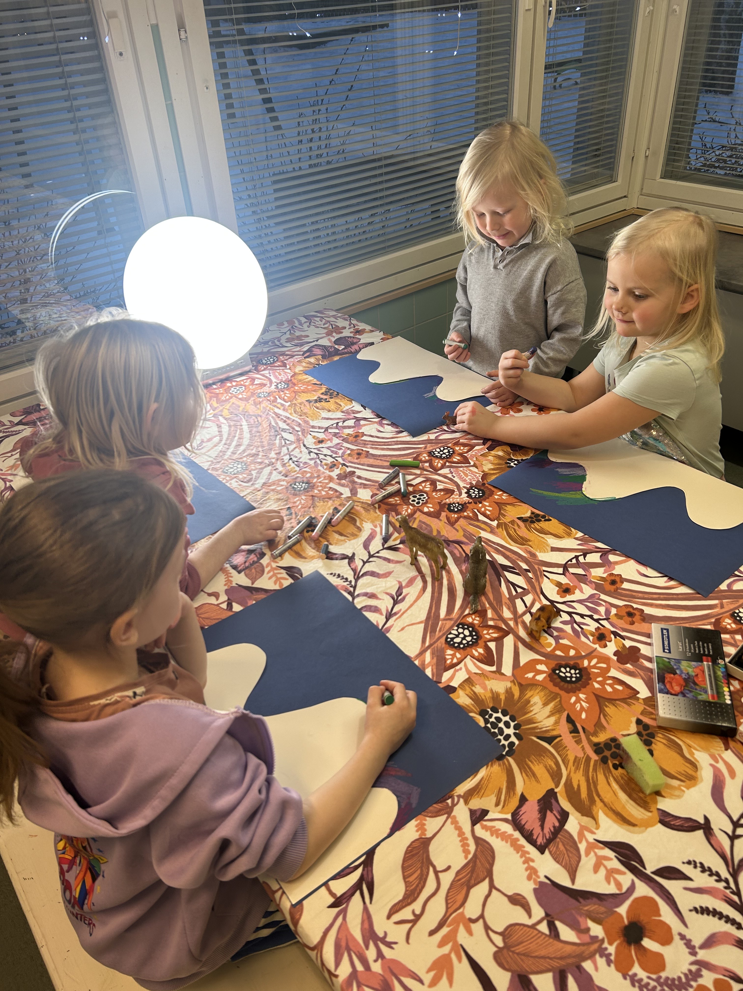 Kevätriehan jäljiltä nukkariin jätettiin valokuvaustausta ja lapset saivat keskiviikkona improvisoida ja piirtää paperin täyteen mielikuvituksensa tuotosta 🙂 lopputulos oli mestariteos!