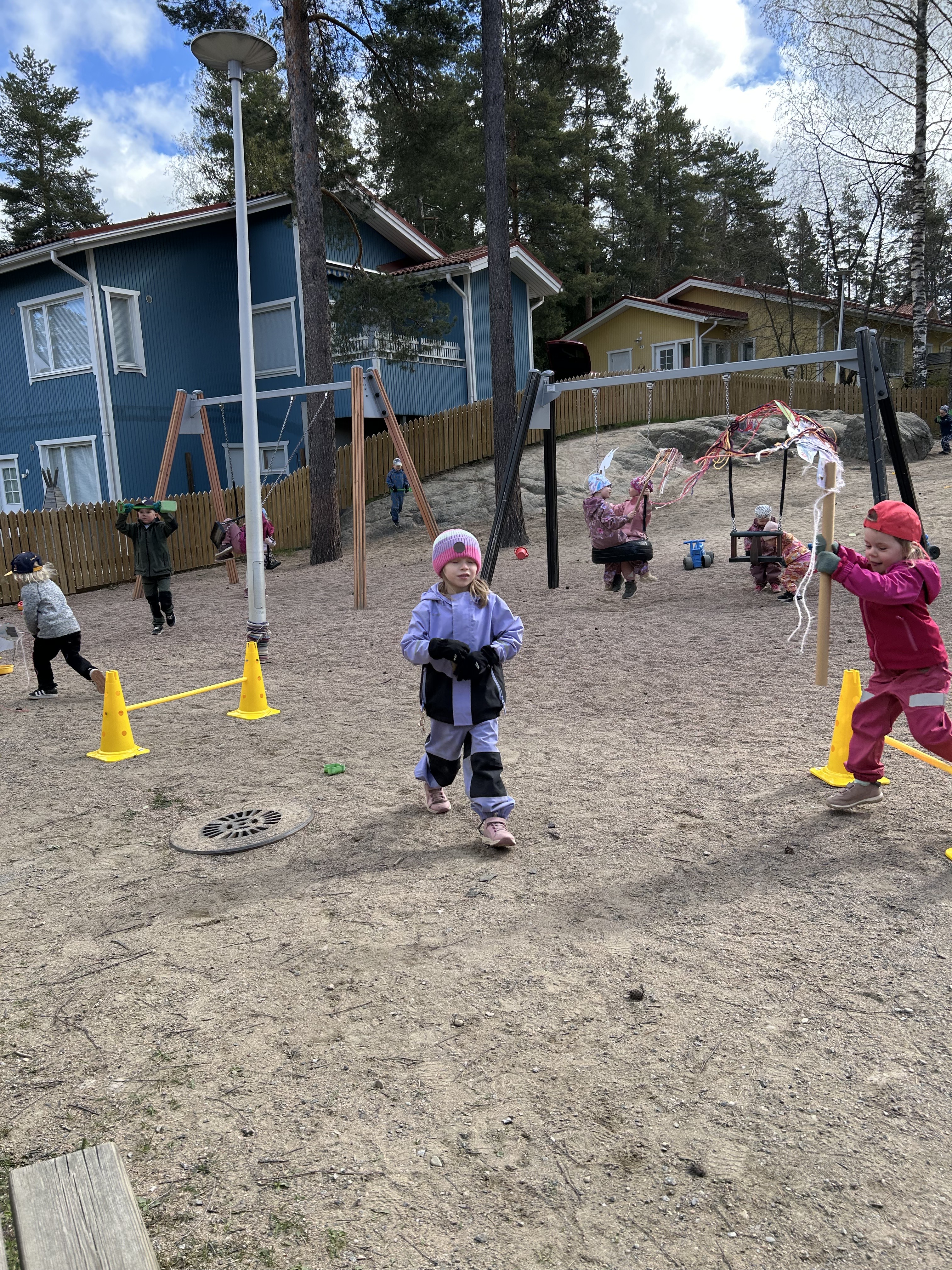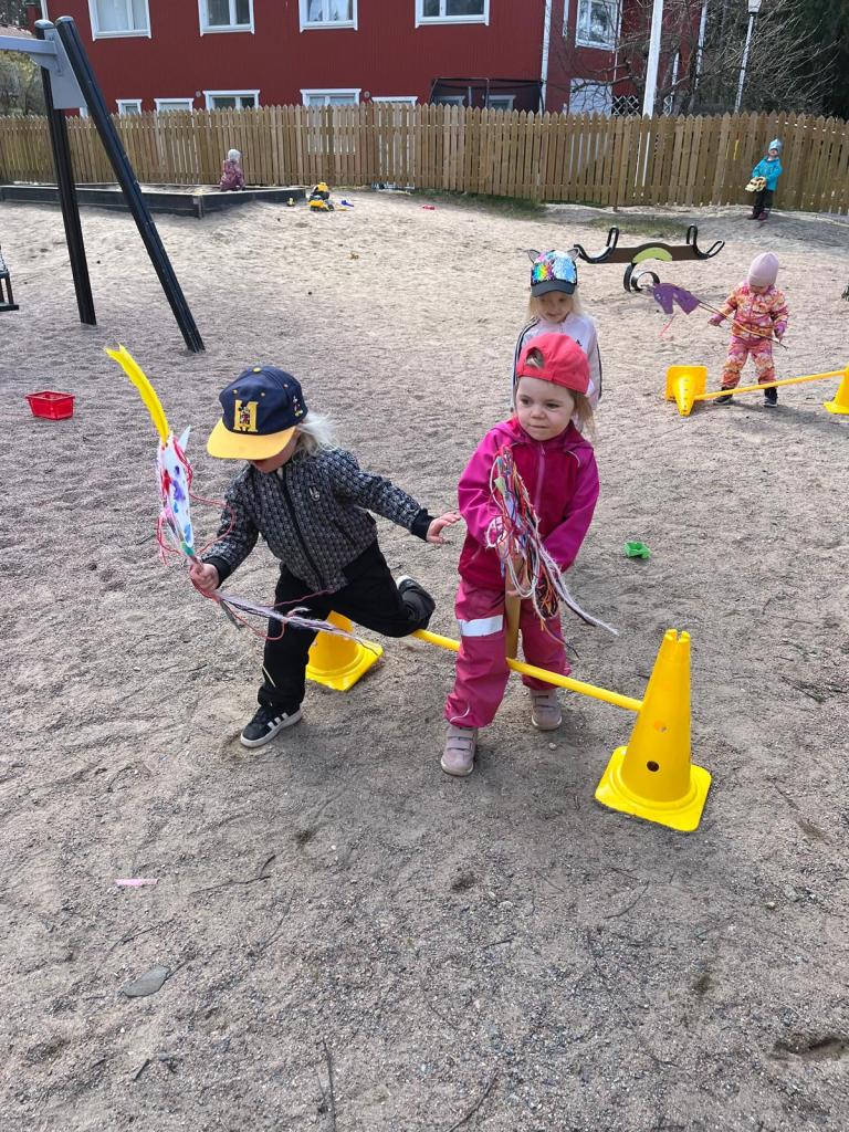 Lasten toiveesta askartelemamme yksisarviskeppihevoset pääsivät vihdoin ulos. Lapset saivat mm. hyppiä esteiden yli keppihevosillaan.