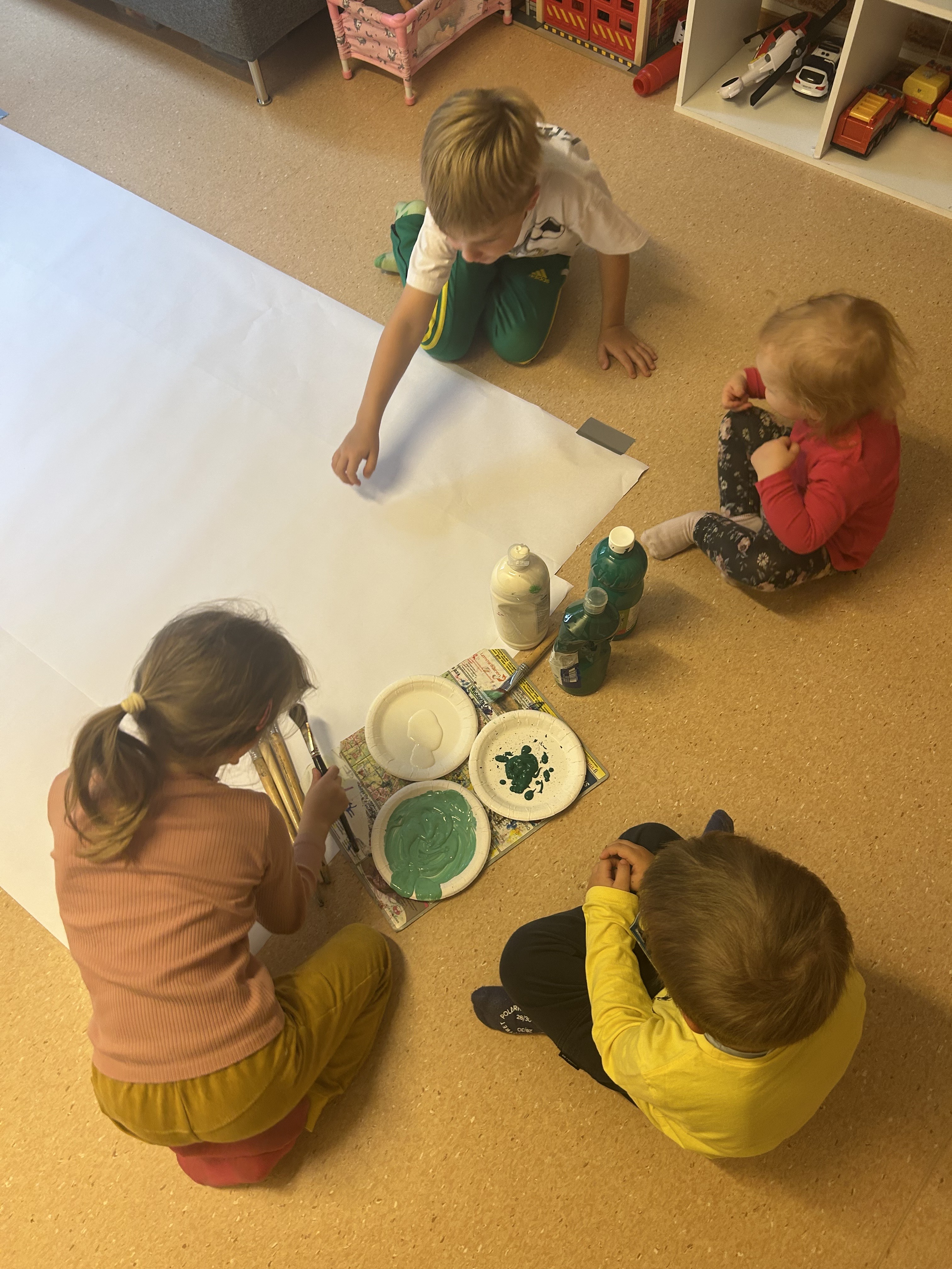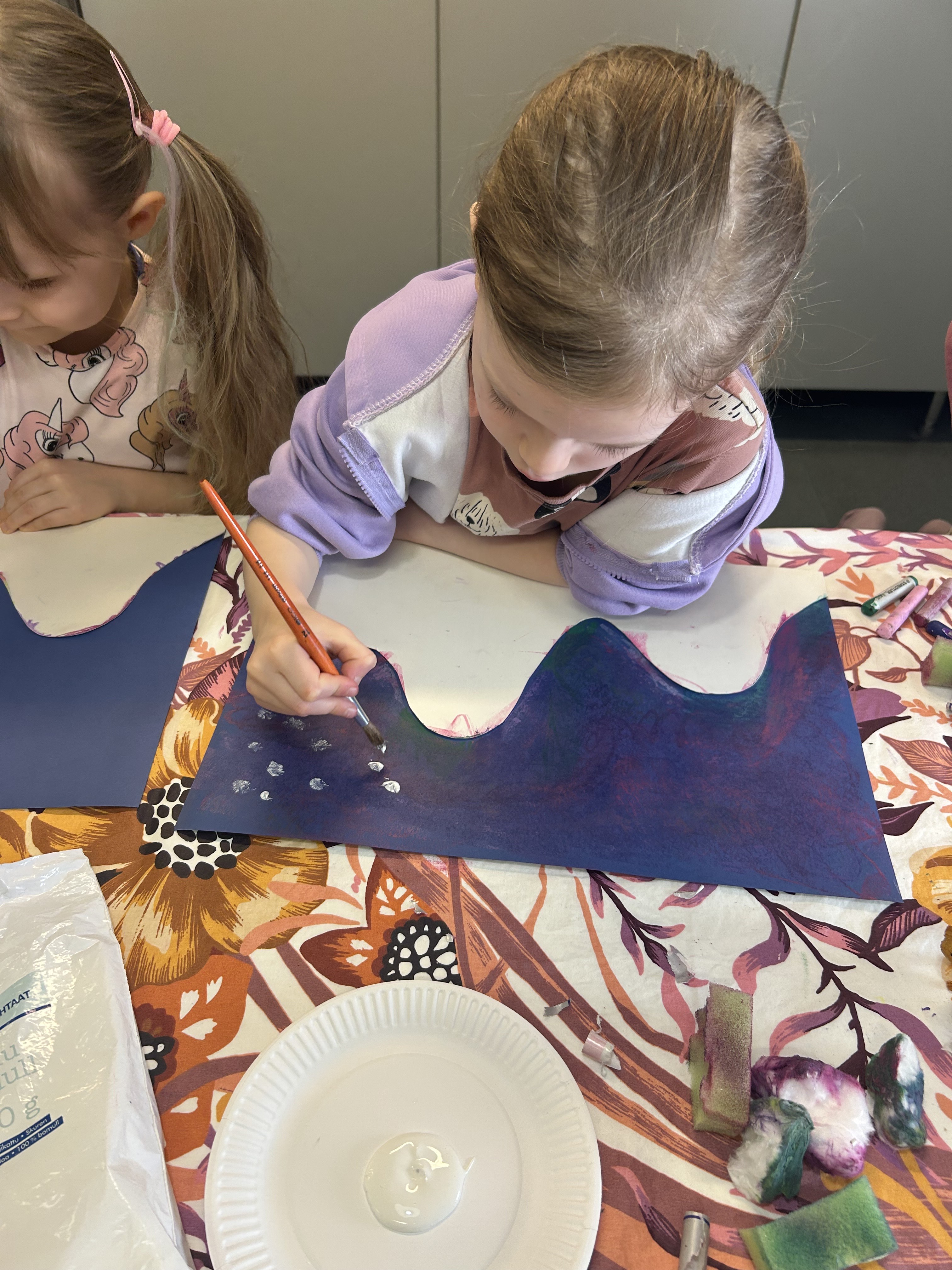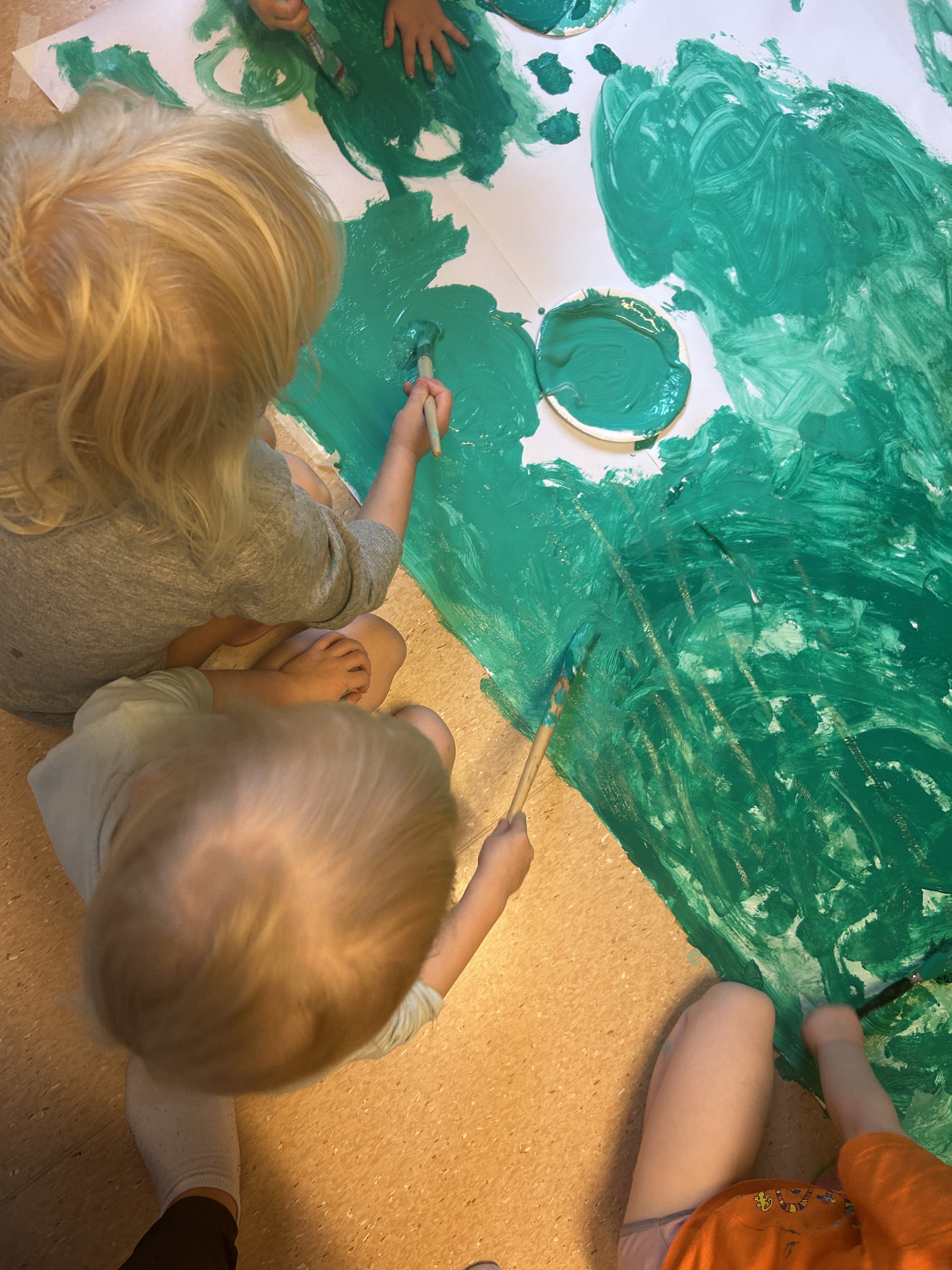 Aloitimme lasten kanssa akvaarioaskartelut ja näissä olemmekin päässeet hyödyntämään paljon erilaisia materiaaleja ja tekniikoita… Lapset aloittivat maalaamalla. Taaperot tekevät tämän yhteistyönä sormivärejä käyttäen.