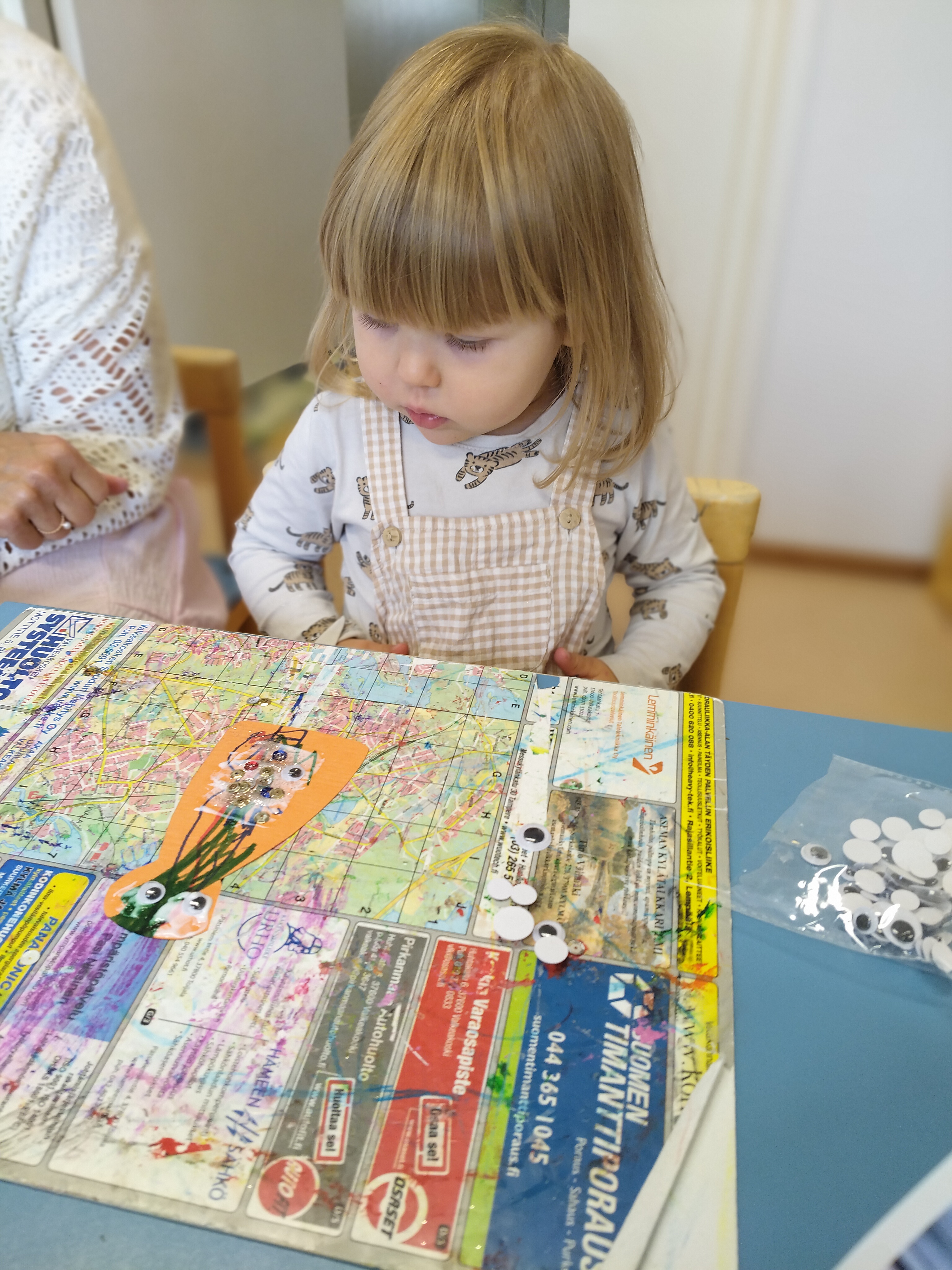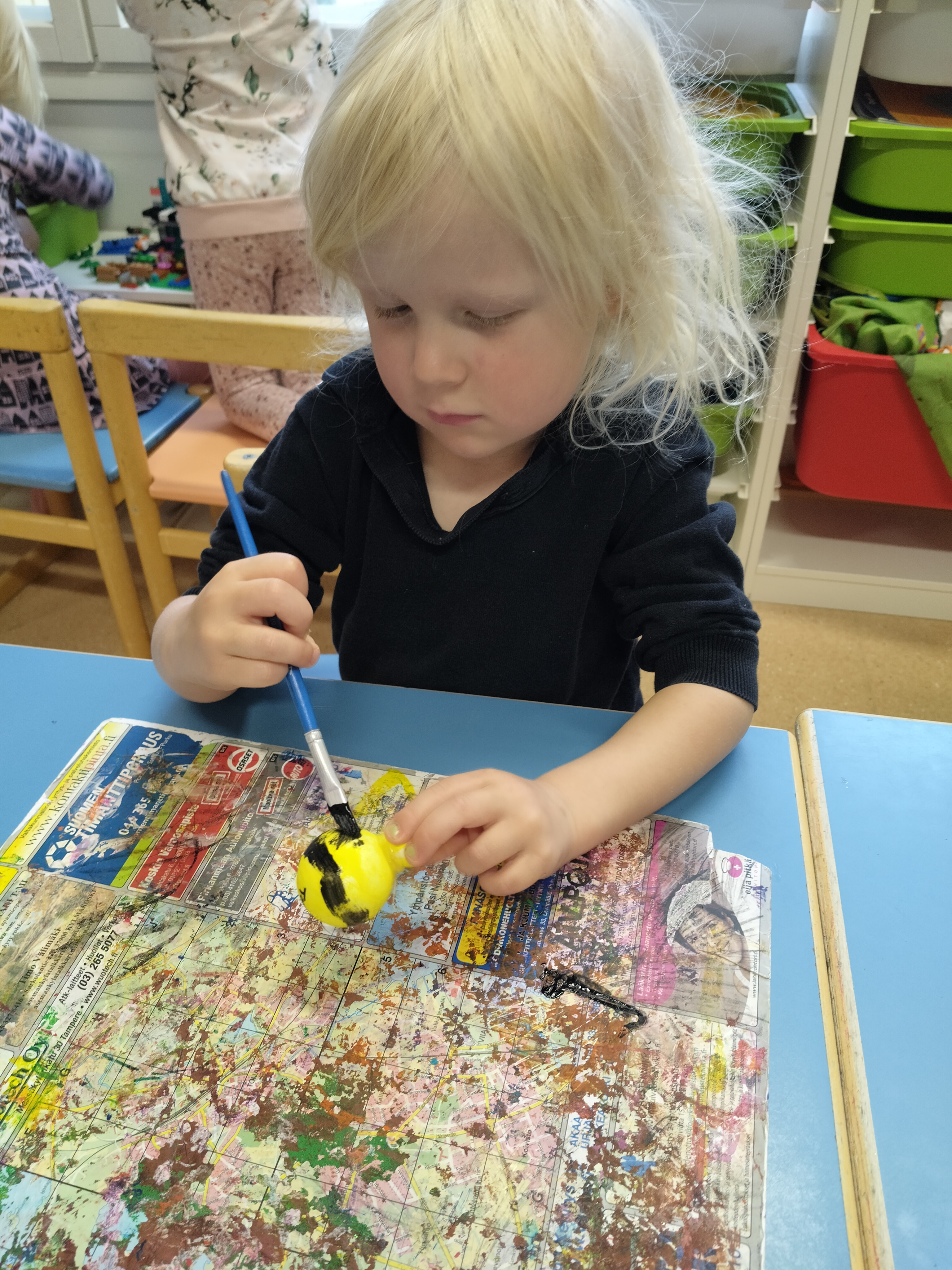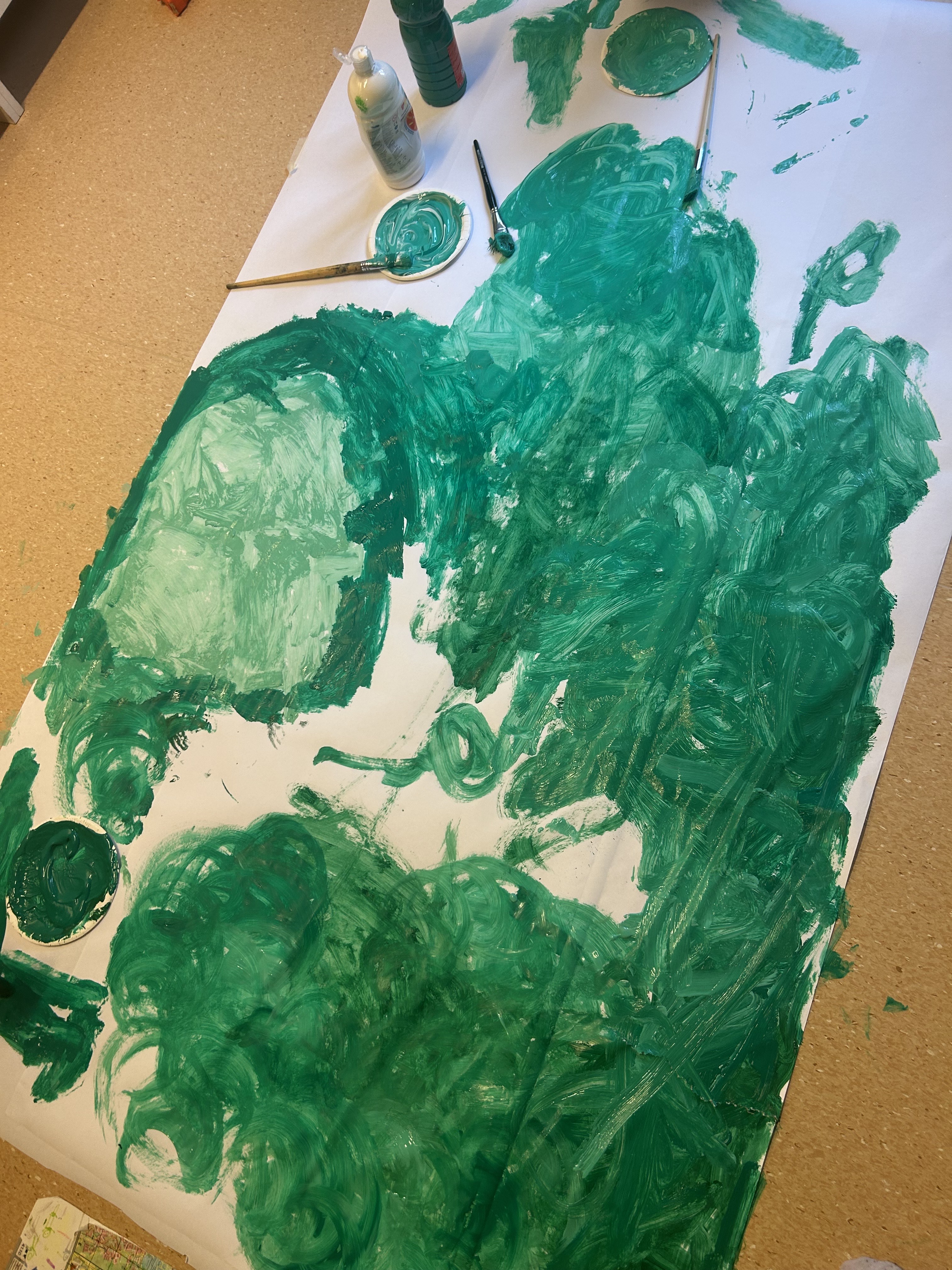 Aloitimme lasten kanssa akvaarioaskartelut ja näissä olemmekin päässeet hyödyntämään paljon erilaisia materiaaleja ja tekniikoita… Lapset aloittivat maalaamalla. Taaperot tekevät tämän yhteistyönä sormivärejä käyttäen.