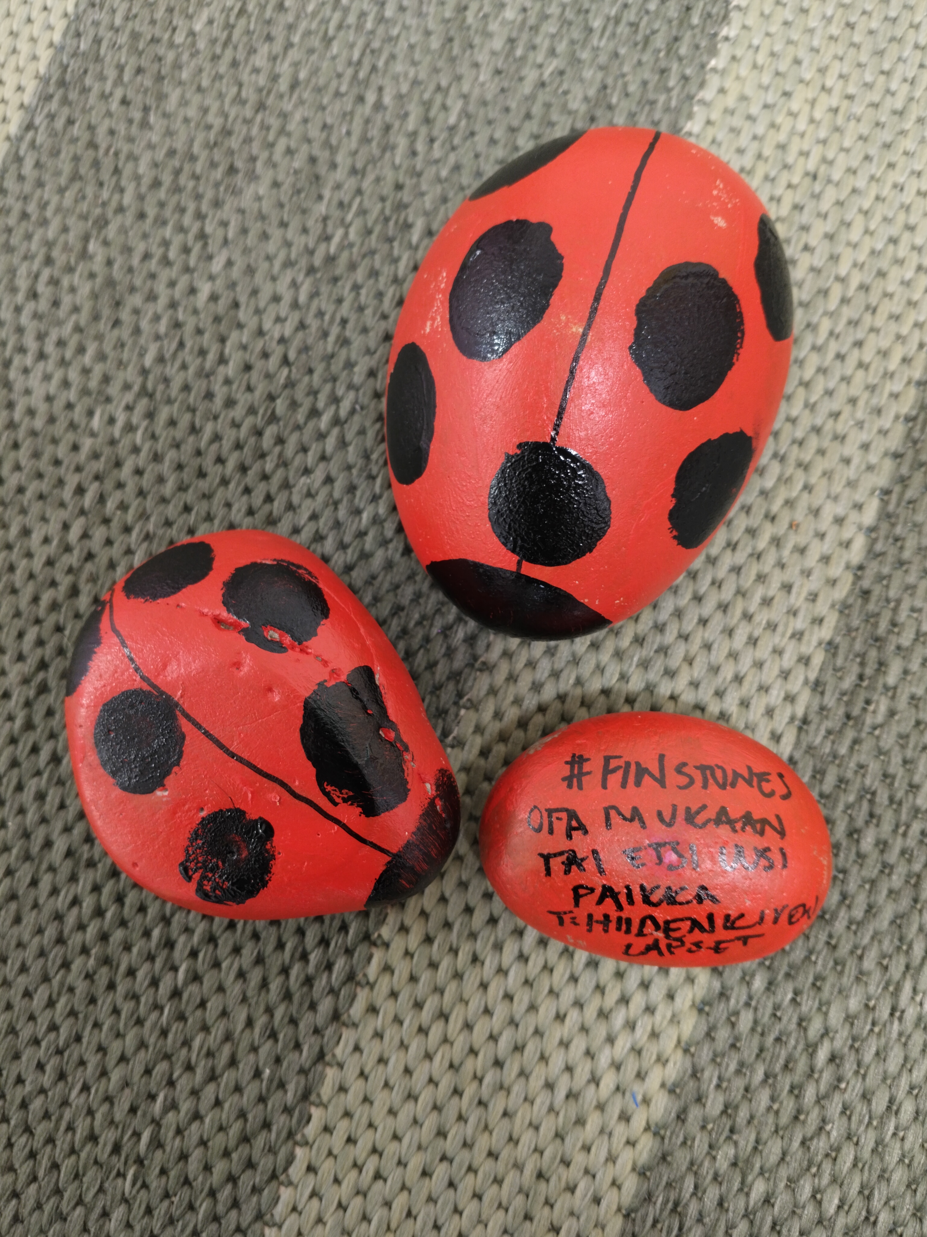Ötökkäteeman ja leppäkerttujen inspiroimana innostuimme taiteilemaan oman FinStones kivemme 🙂 Piilotimme näitä kolme kappaletta olkahisen ympäristöön tuomaan iloa muille… ideanahan on siis koristella kivi ja piilottaa se jollekulle löydettäväksi. Löytäjä saa joko pitää kiven, jättää sen paikalleen tai siirtää jonnekin muualle.