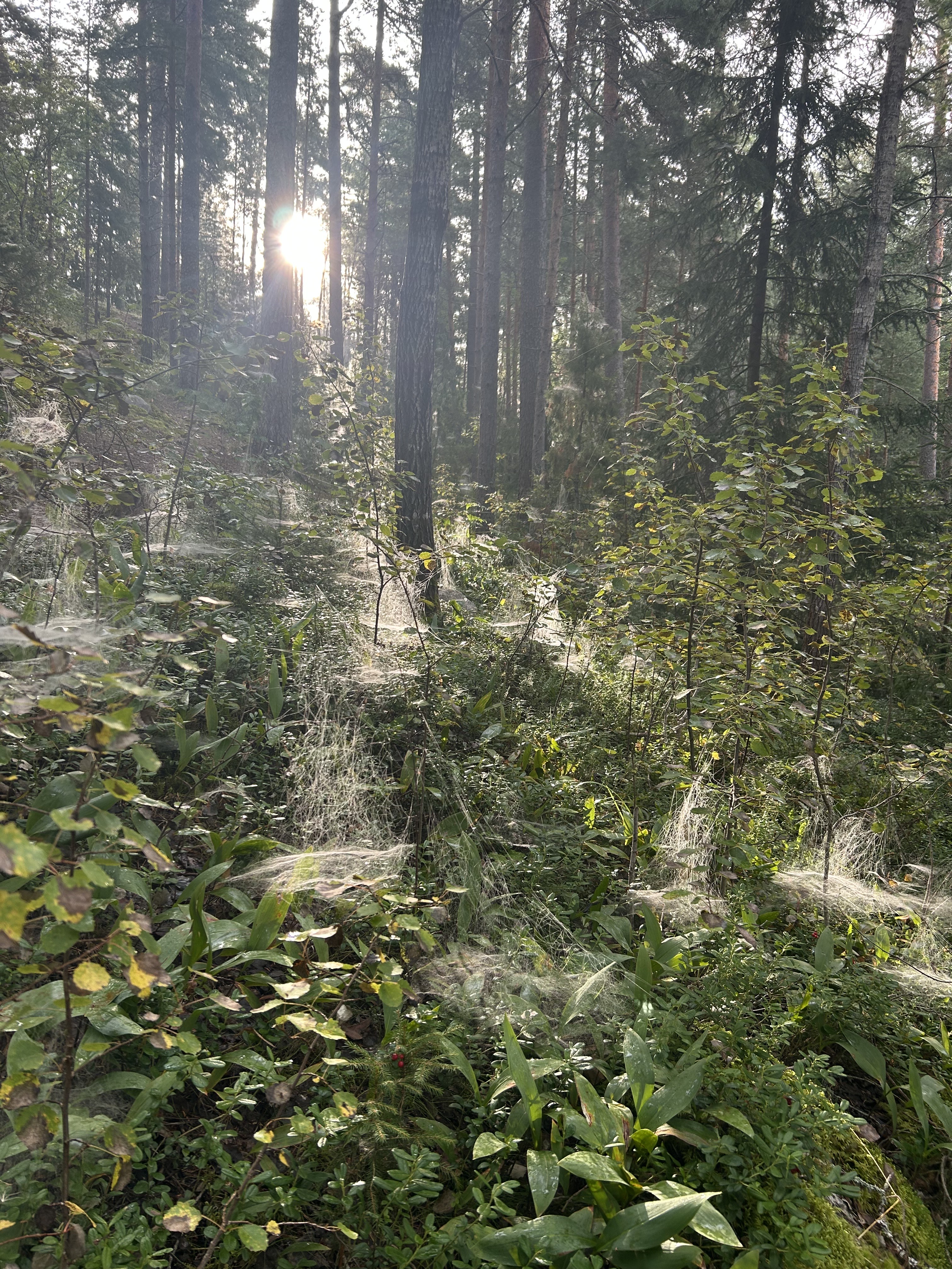 Ihastelimme myös hämähäkinseittejä kun ne kostean aamun jälkeen erottuivat hienosti metsämaisemassa. Kun tarkkaan katsoi, niin seitin keskellä saattoi näkyä hämähäkki…
