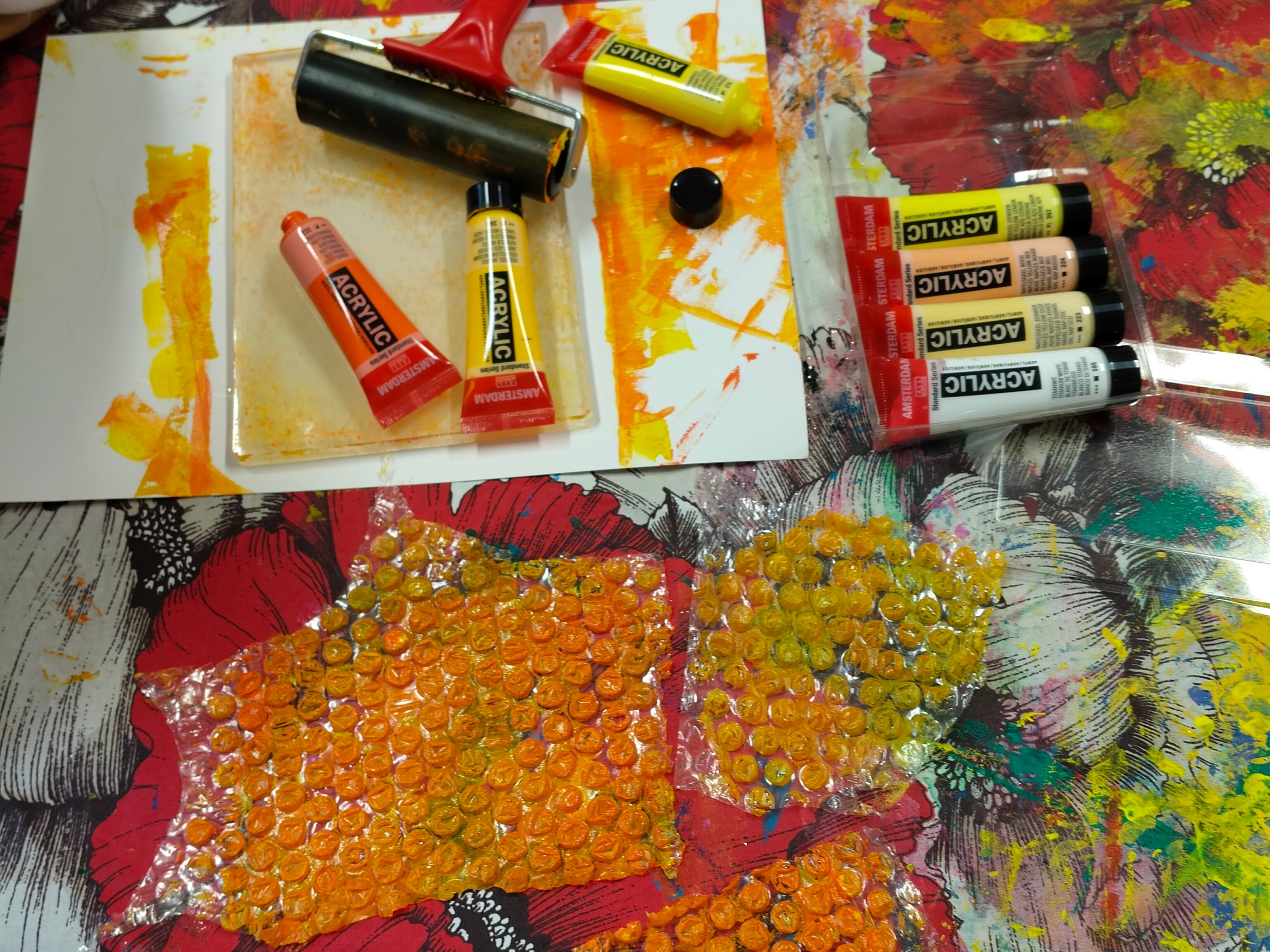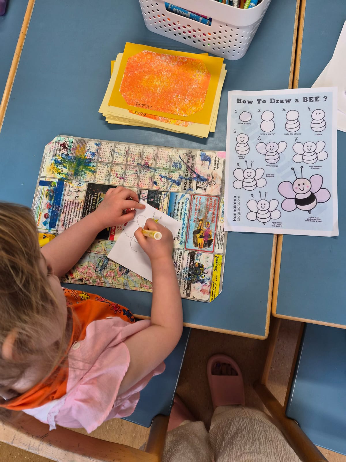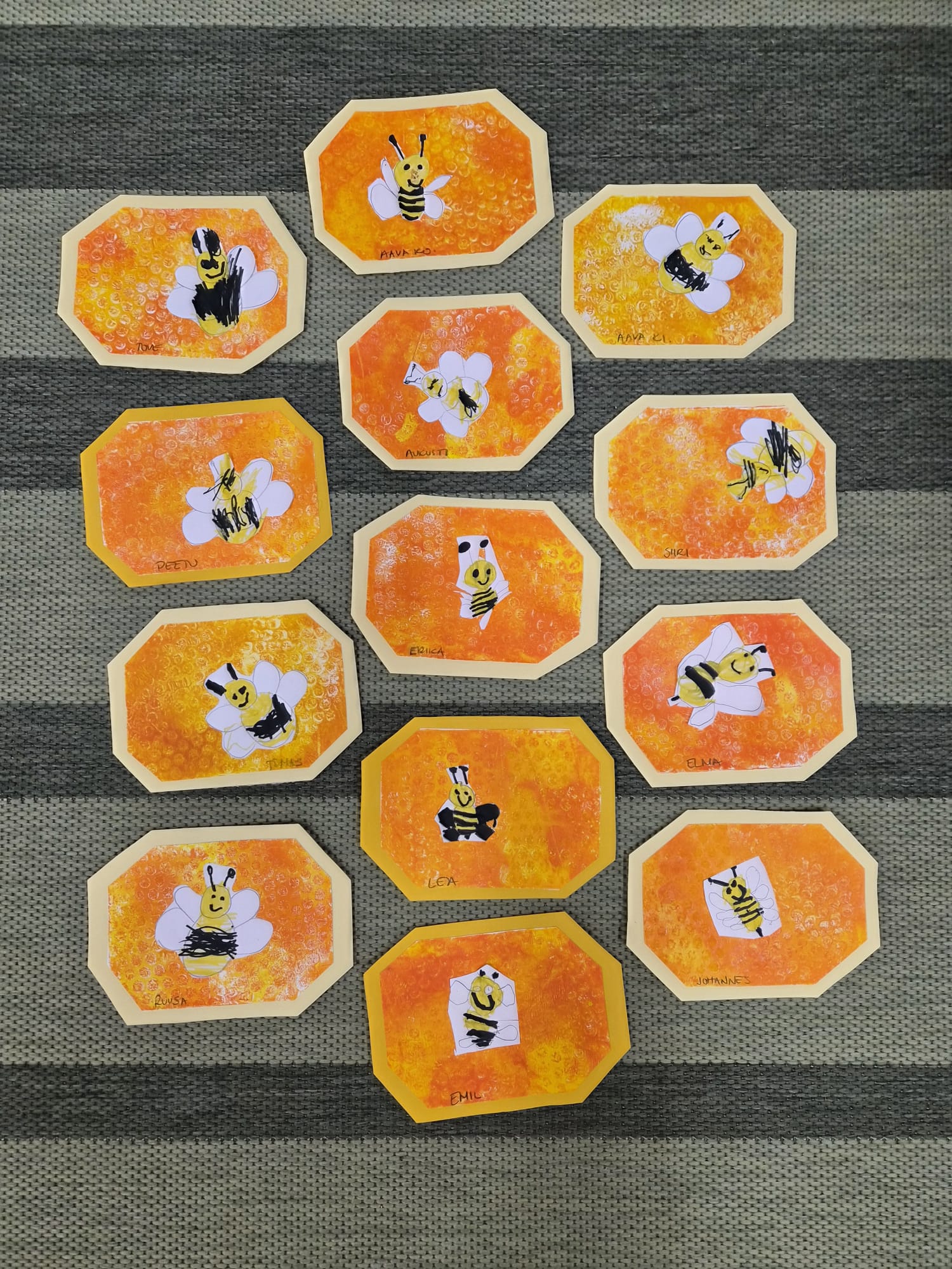 Kokeilimme myös hunajakennojen taitelua gelli-levyjä ja kuplamuovia apuna käyttäen. Gelli-levylle telataan väriä, väriin painetaan kuvia ja kuvio siirretään paperille. Tämä on kiva tekniikka ja näistä tuli hauskan näköisiä. Näitä askarteluja jatkamme vielä ensi viikolla.