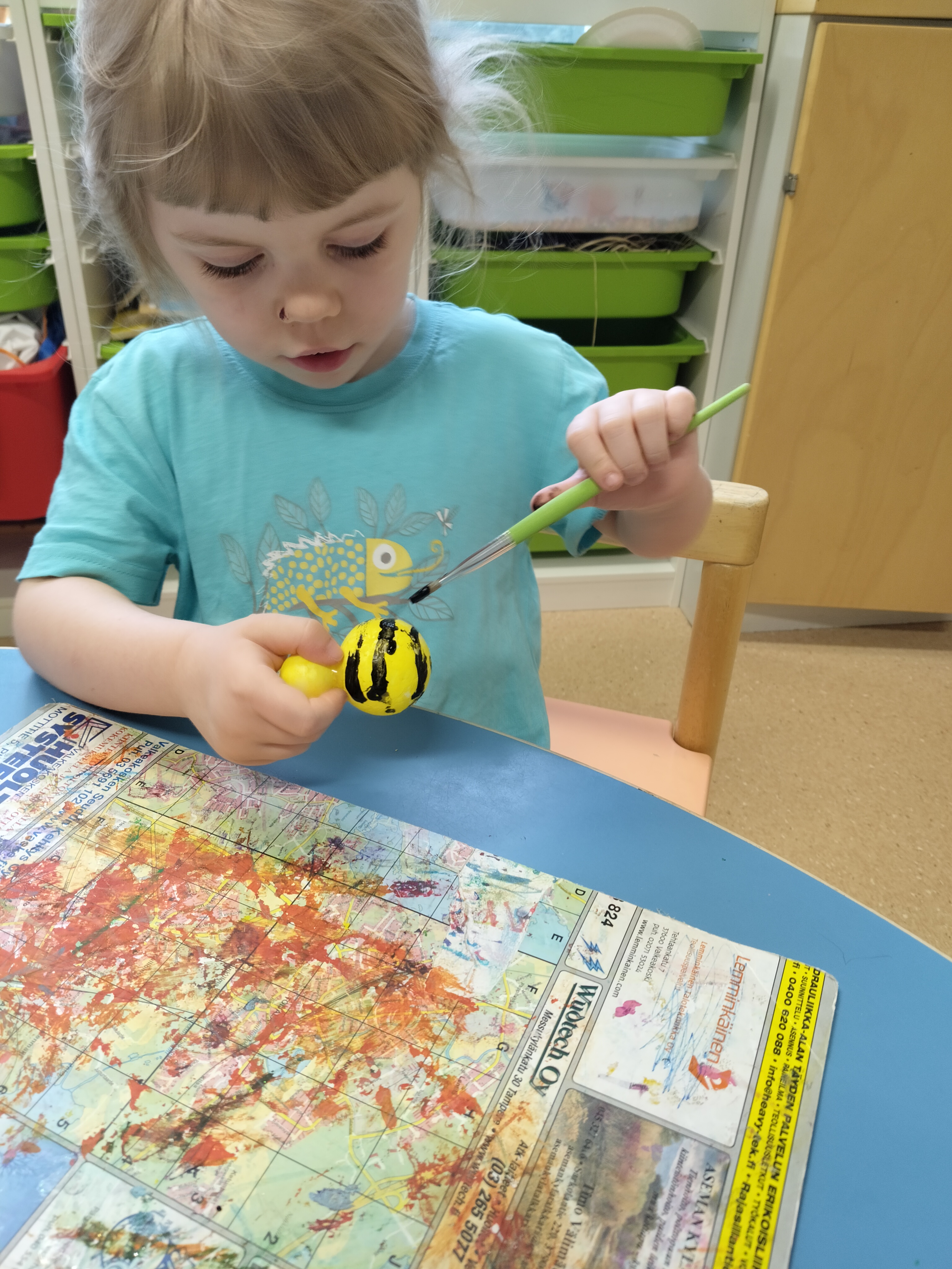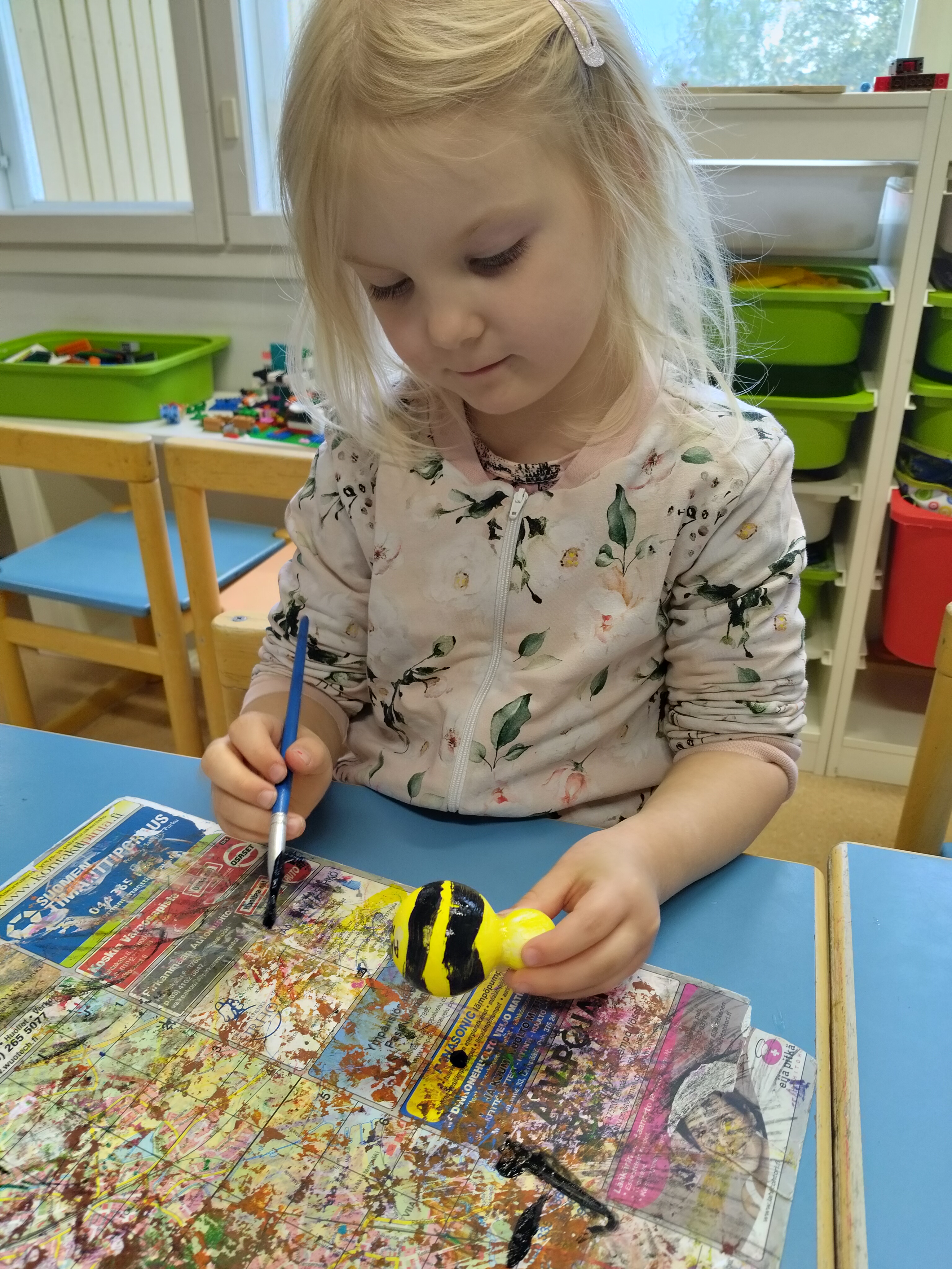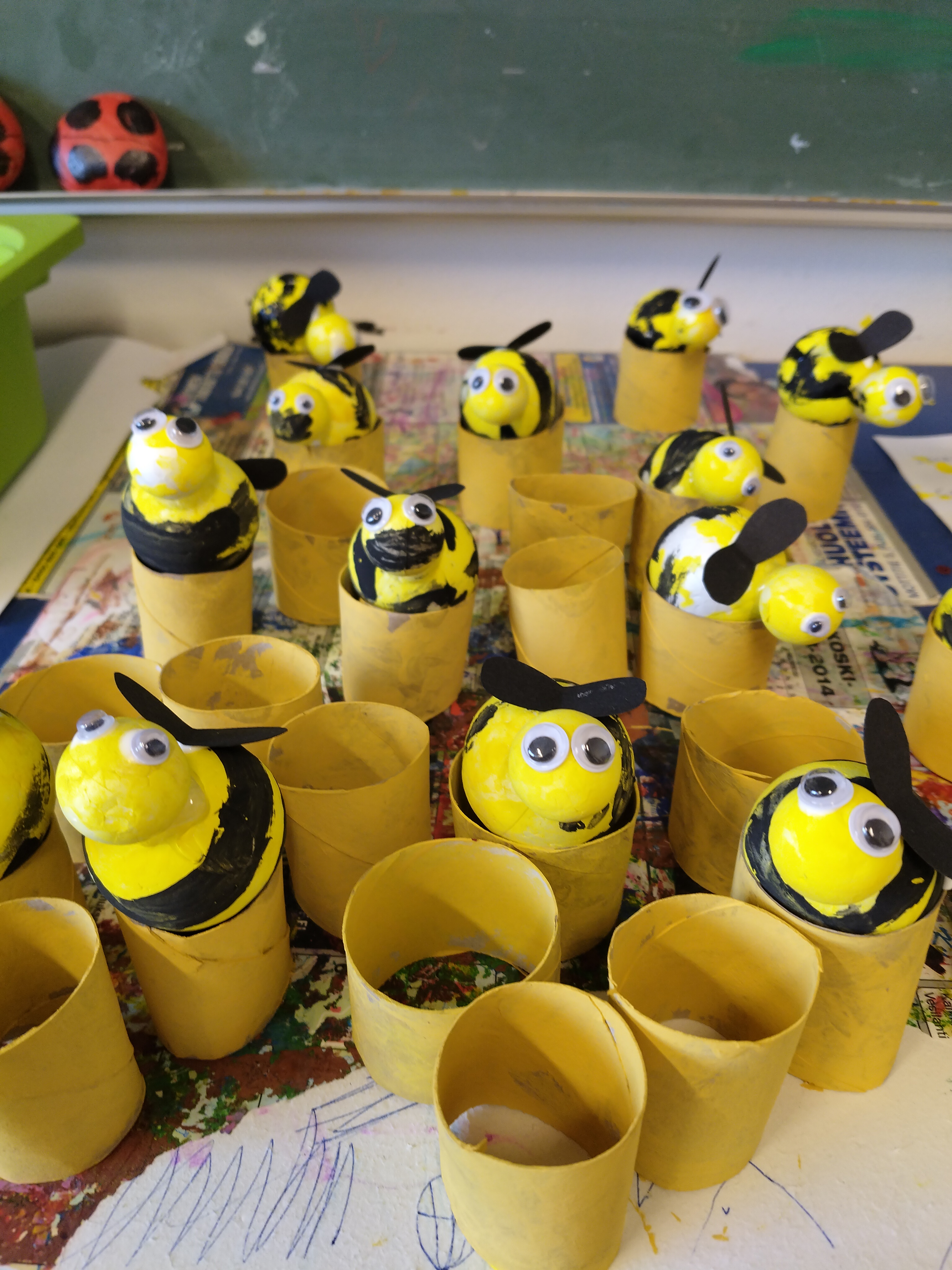 Aloimme askartelemaan mehiläiskennoja ja ampiaisia. Kennot tehtiin vessapaperirullia maalaamalla ja ampiaiset styroksipalloista 🙂