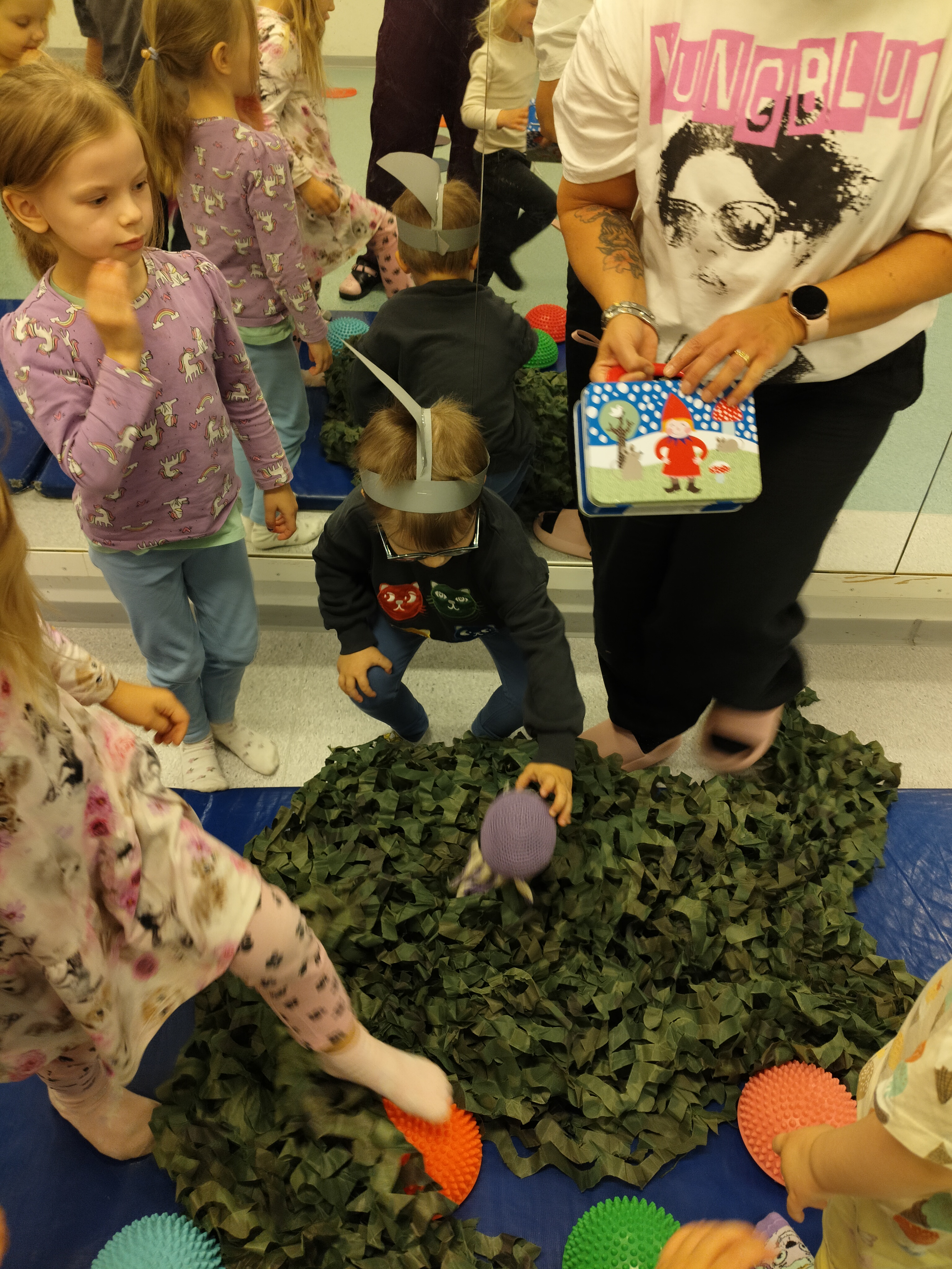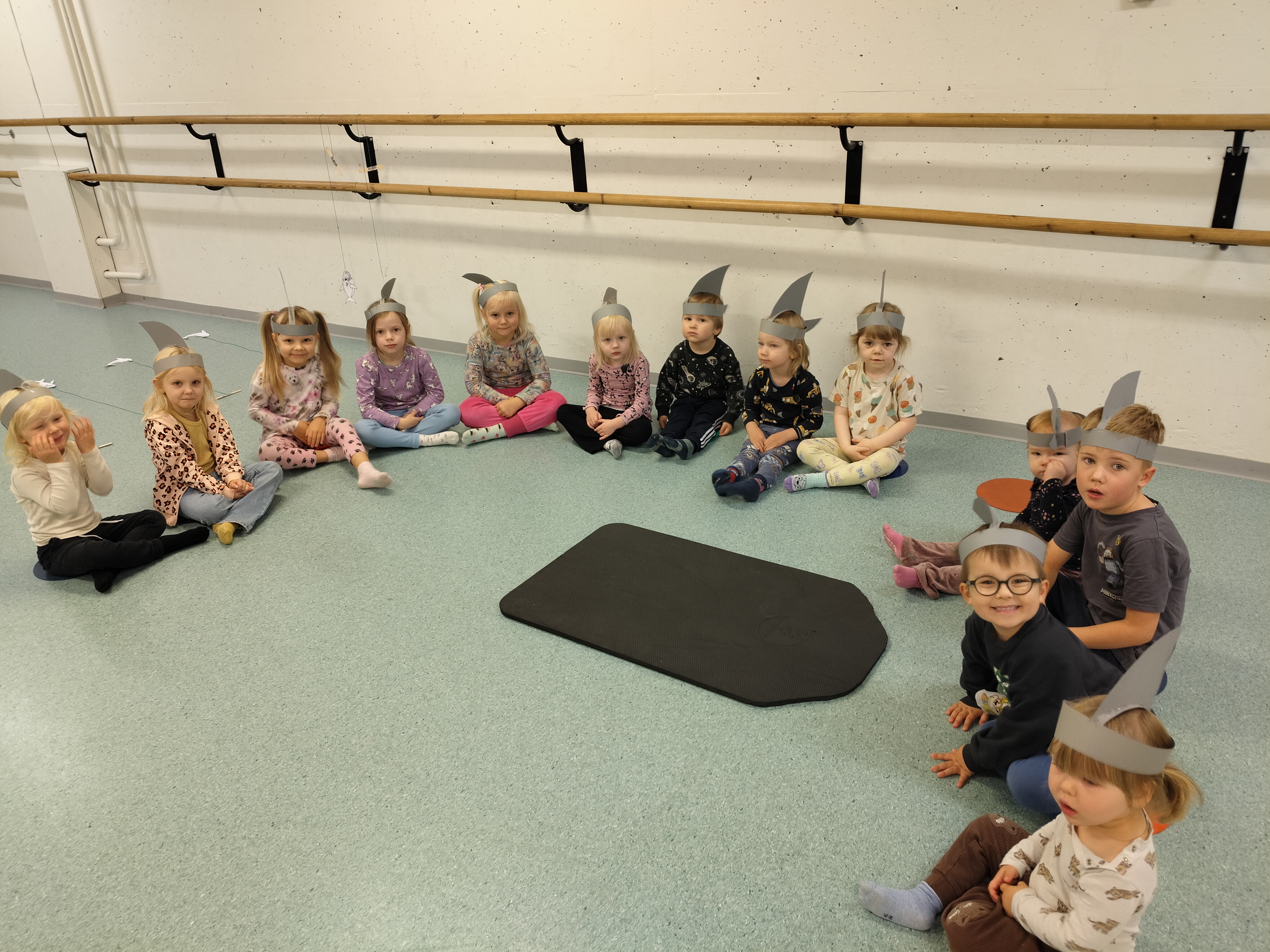 Musahetkellä lauloimme projektimme innoittamina lauluja kuten suuret ja pienet aallot ja kaksi on paatissa soutajaa sekä leikimme kalojen pyydystysleikkiä ja merenneitoleikkiä 🙂