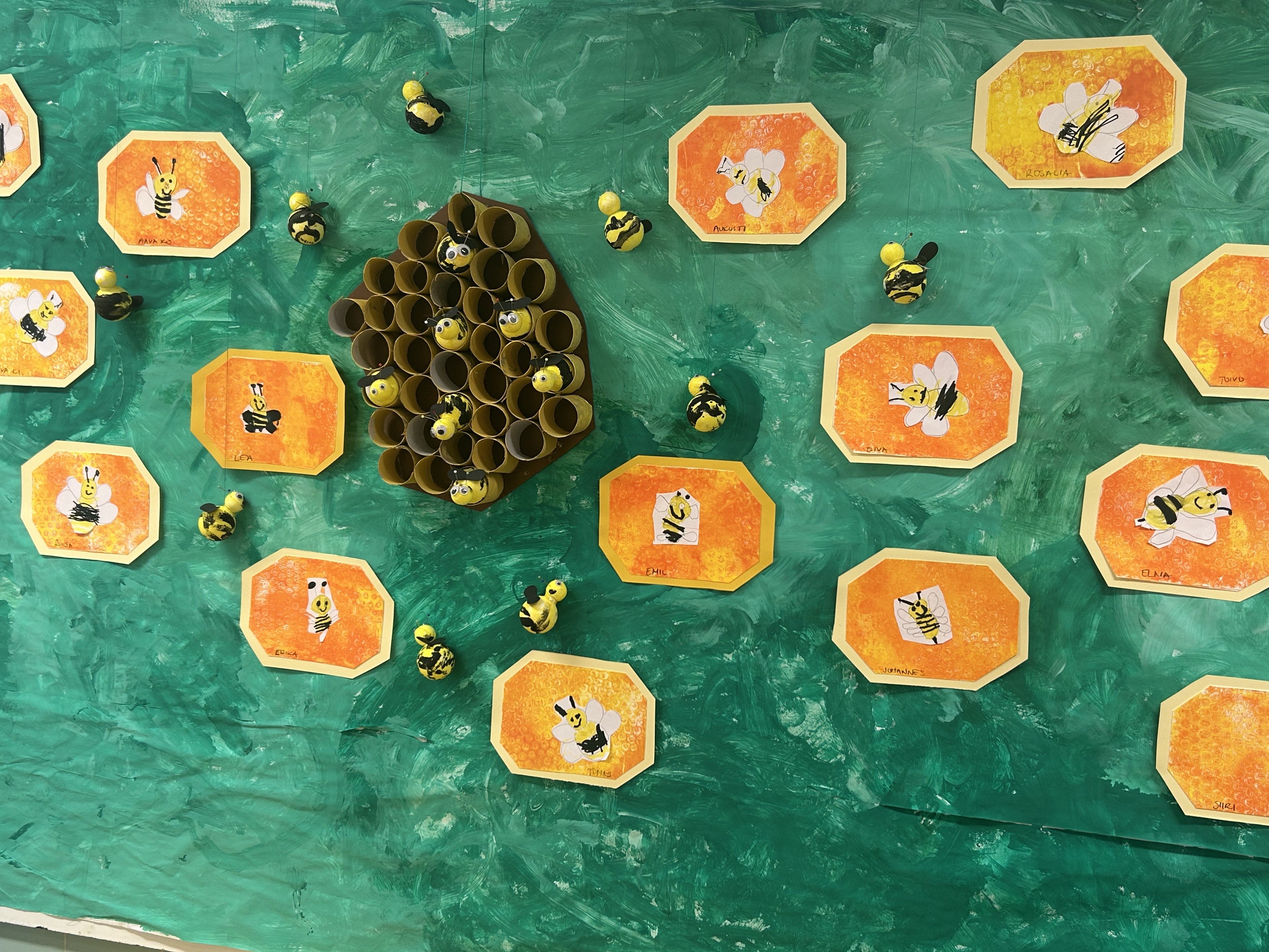 Gellilevy-askartelut ja styroksi ampiaiset saimme myös viimeisteltyä. Isommat piirsivät itse ampiaiset ja pienemmät saivat värittää ja leikata kuvat kennoihin. Nämäkin ovat näytillä keittiön seinällä…