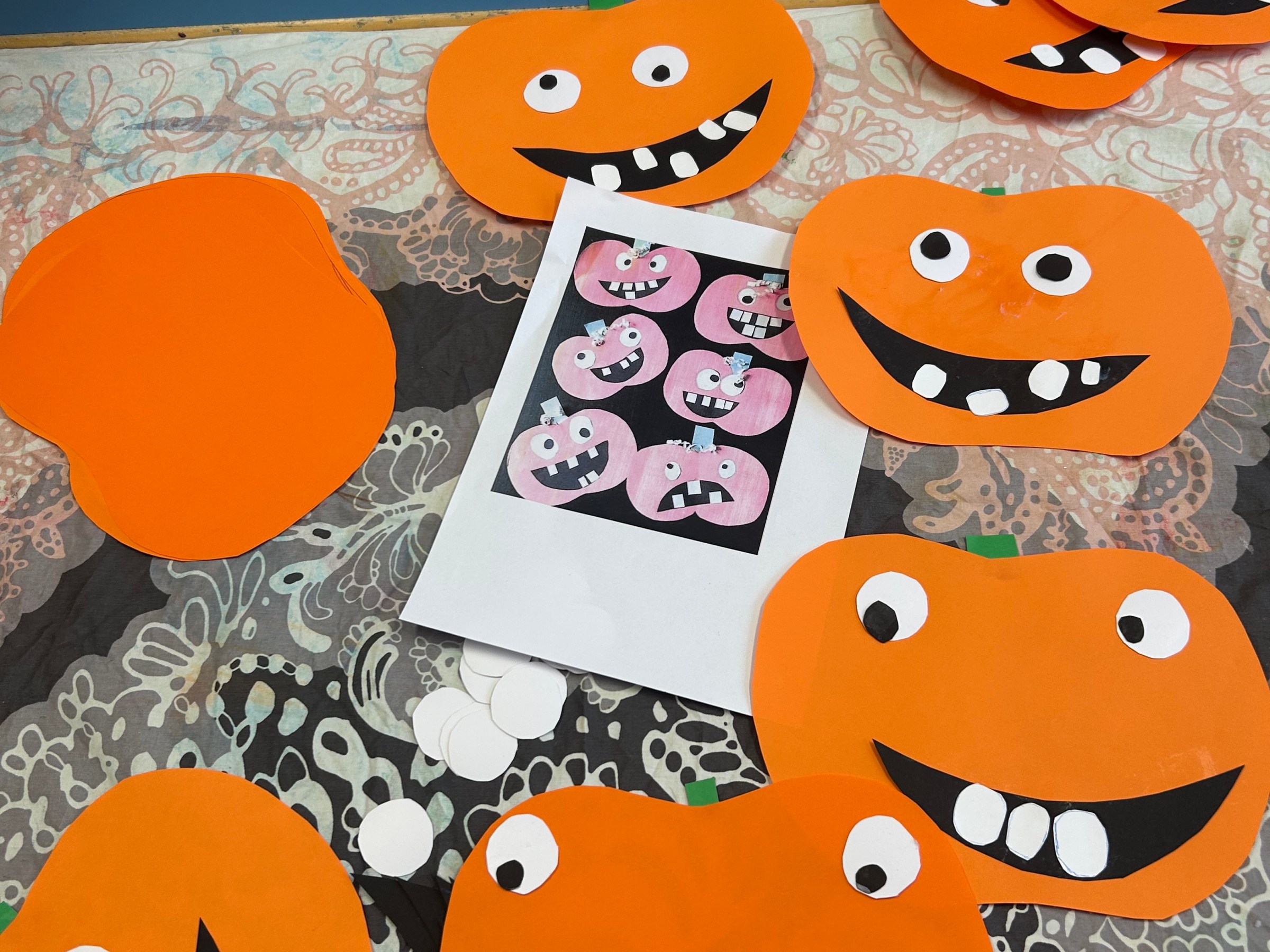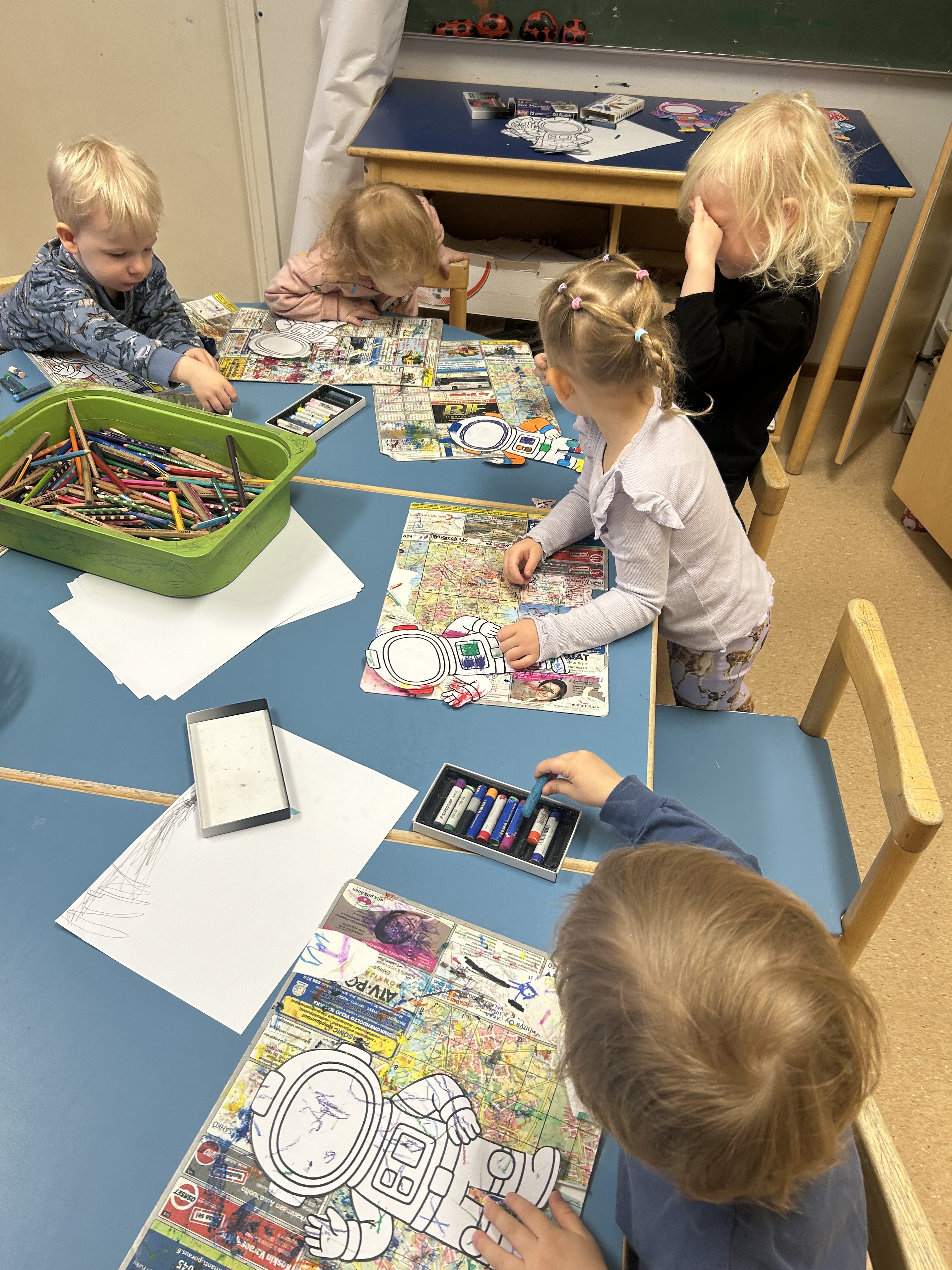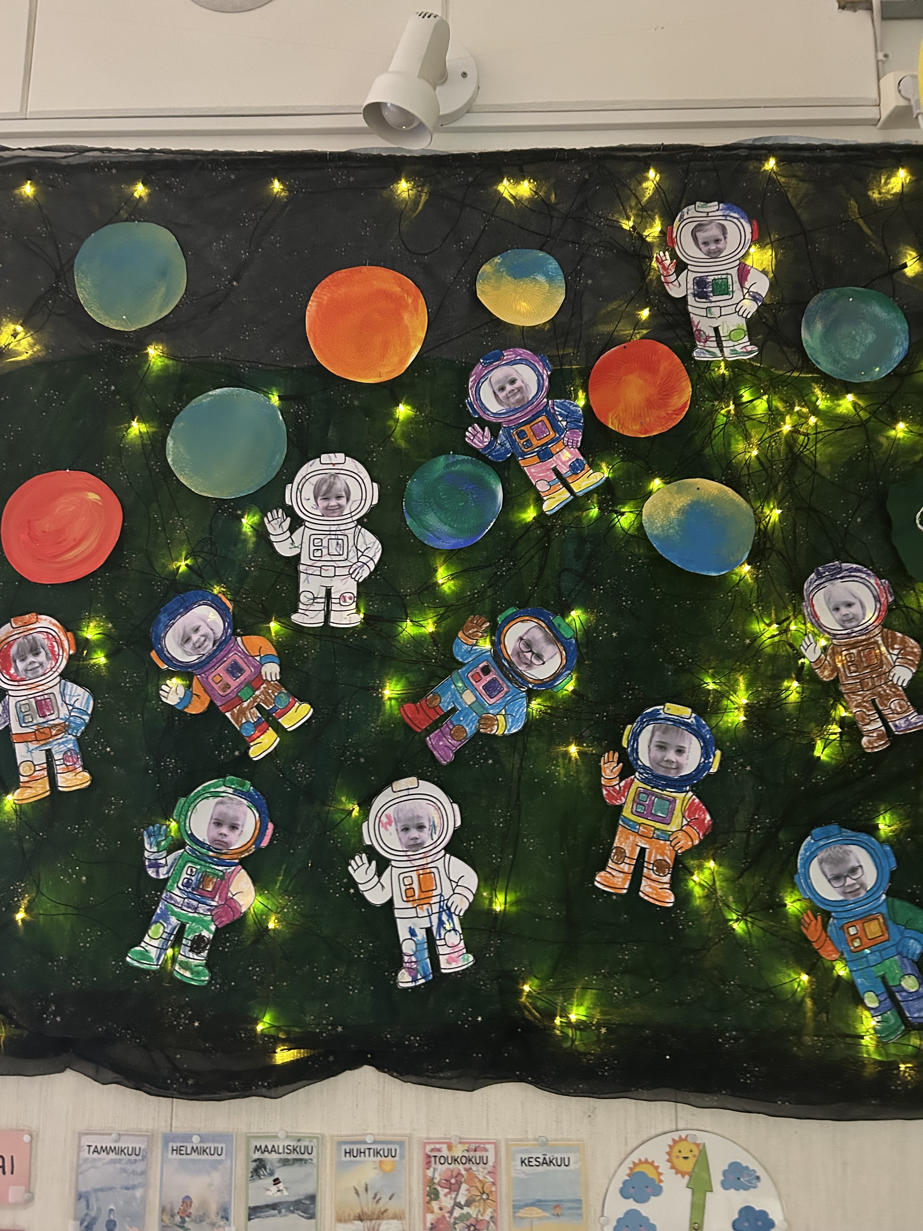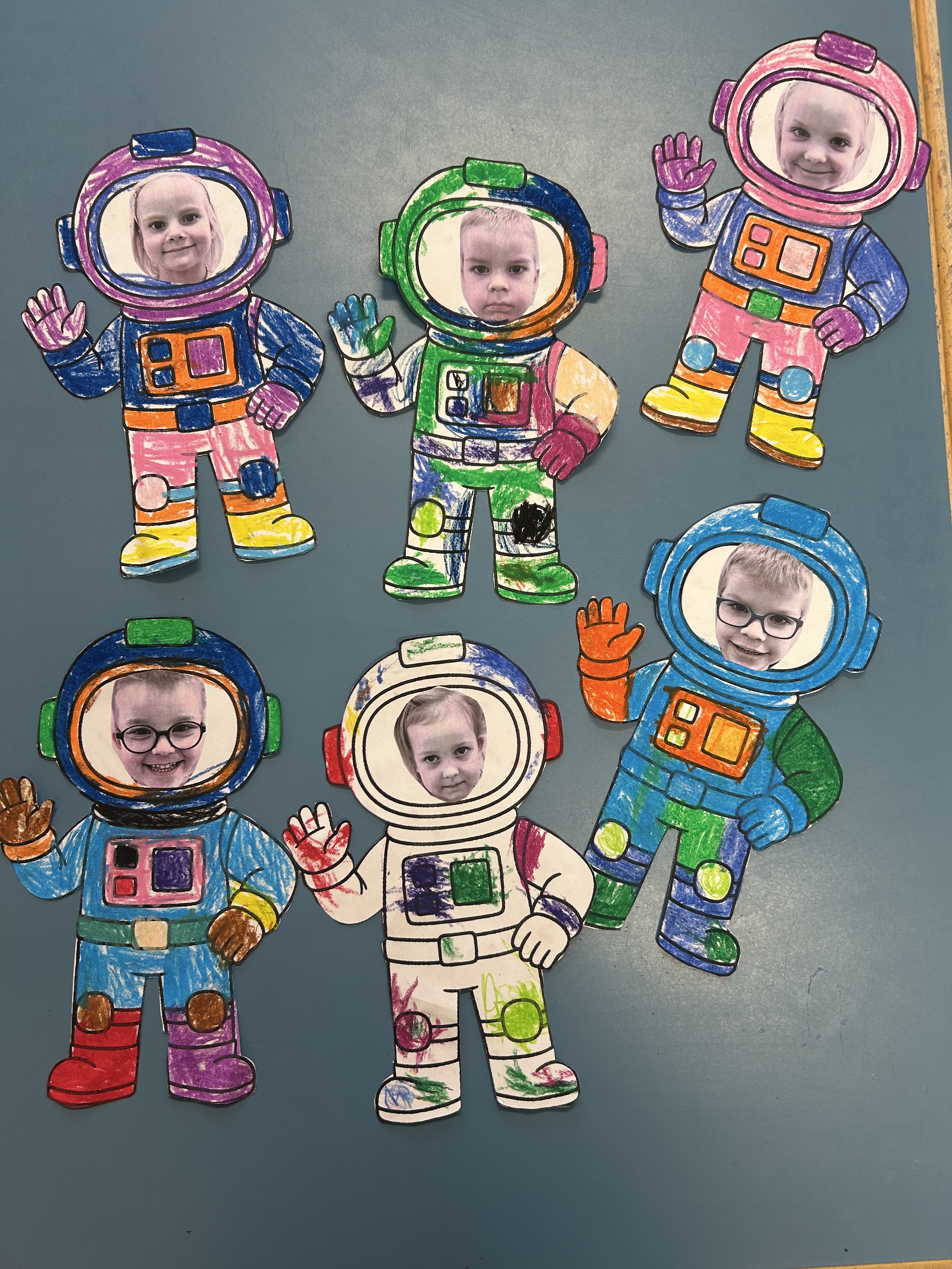 Aloitimme askartelemaan astronautteja lasten kanssa. Näistä tuli oikein hauskat omakuvat salin seinälle 🙂