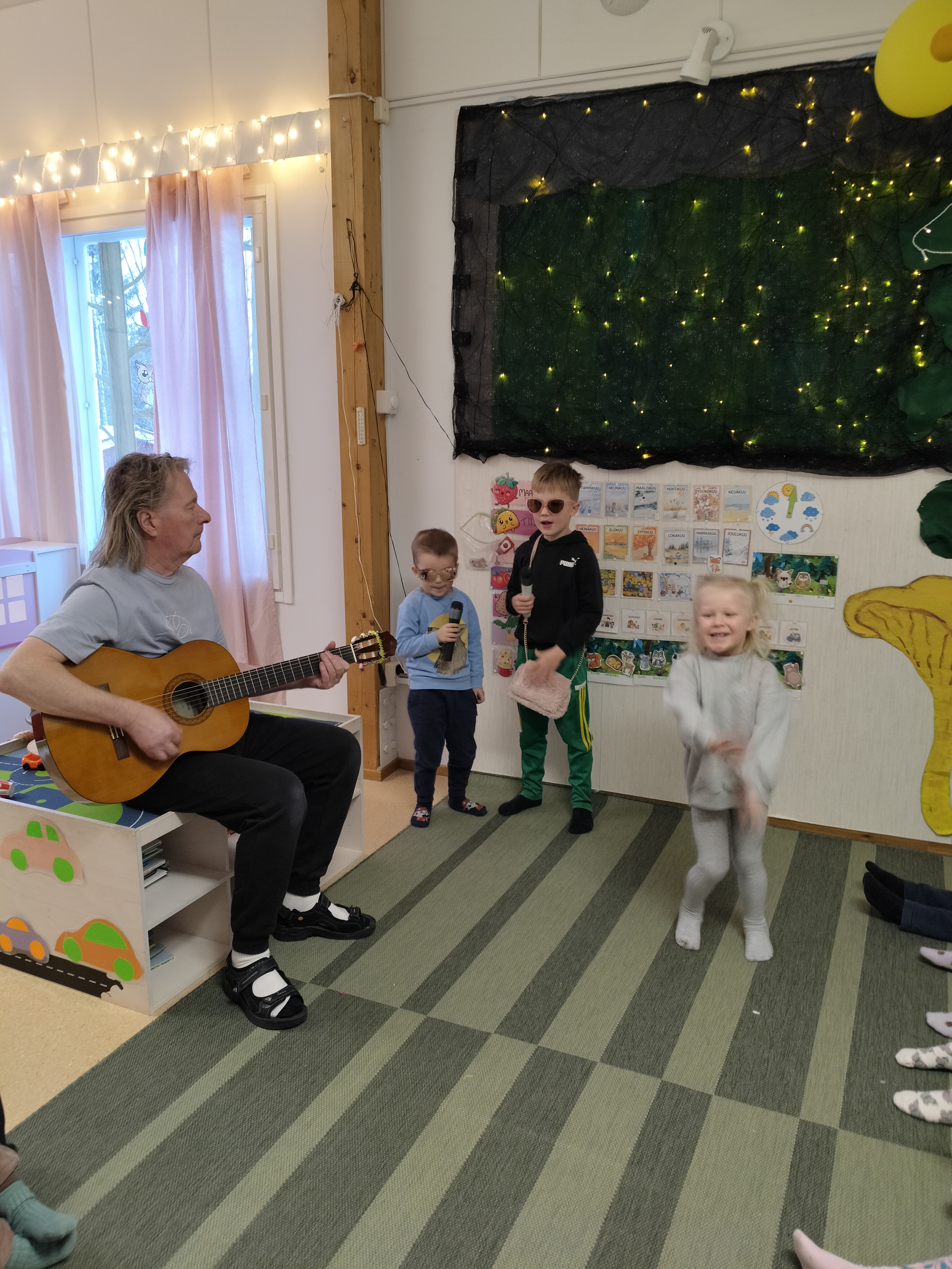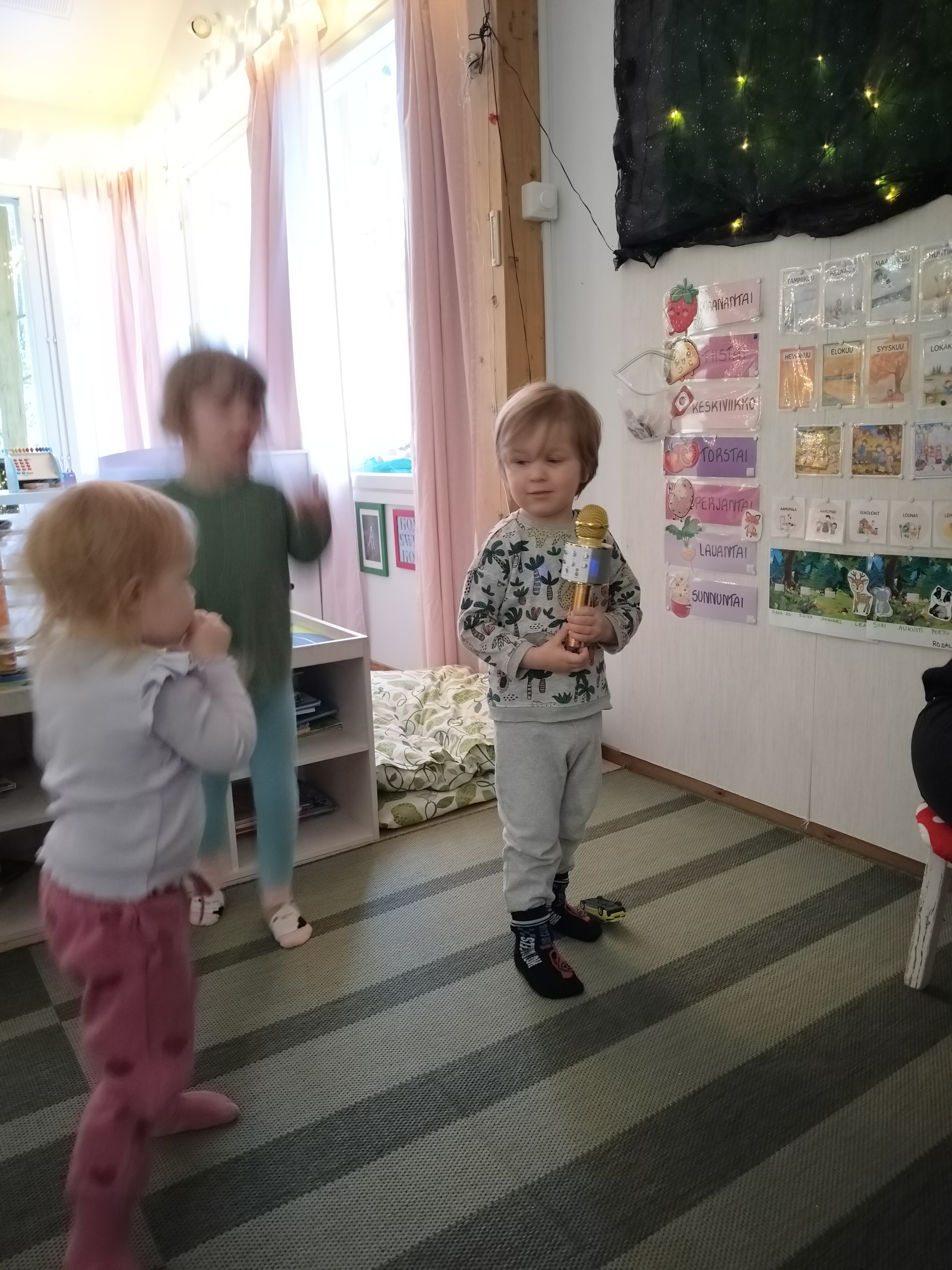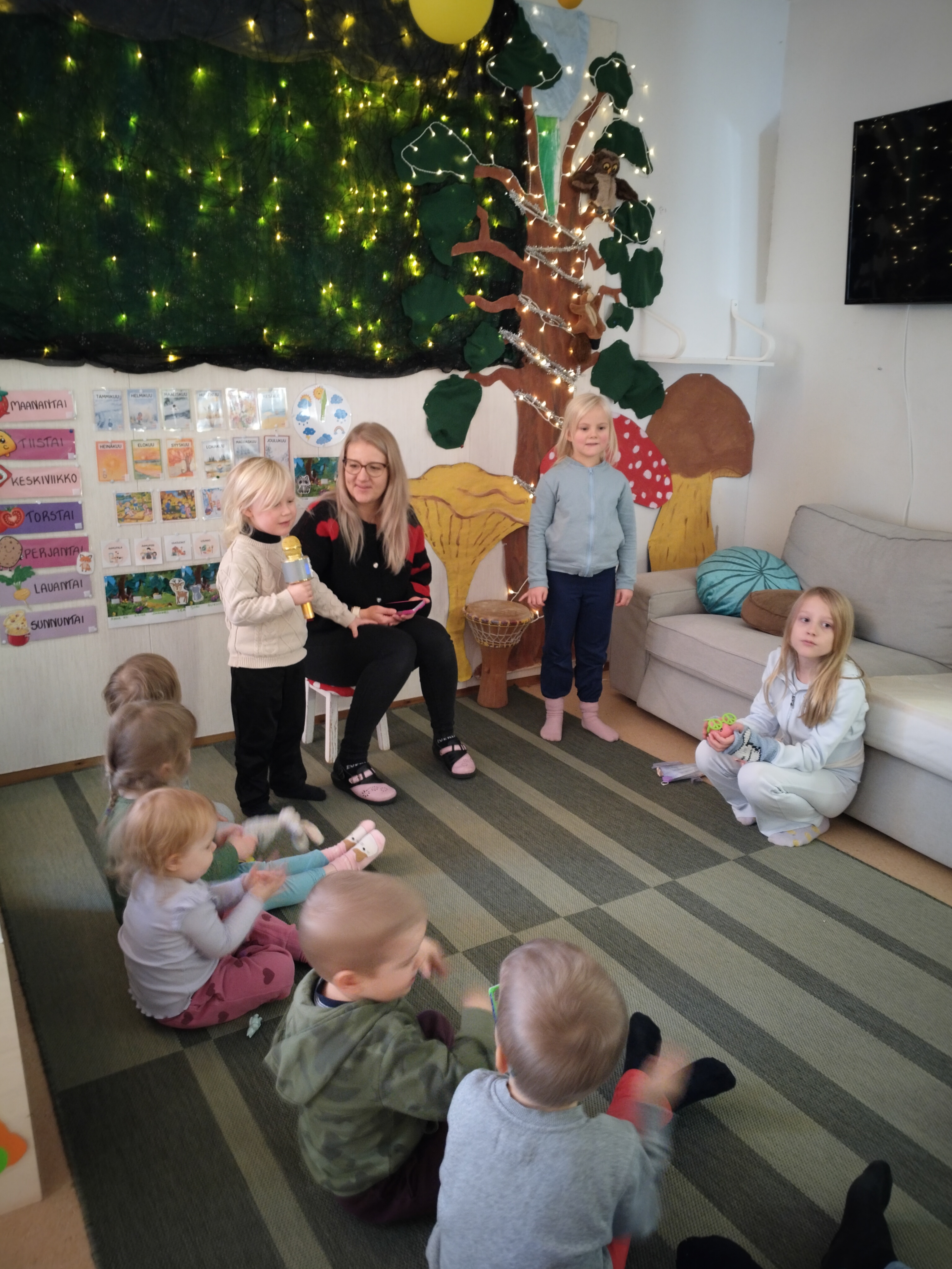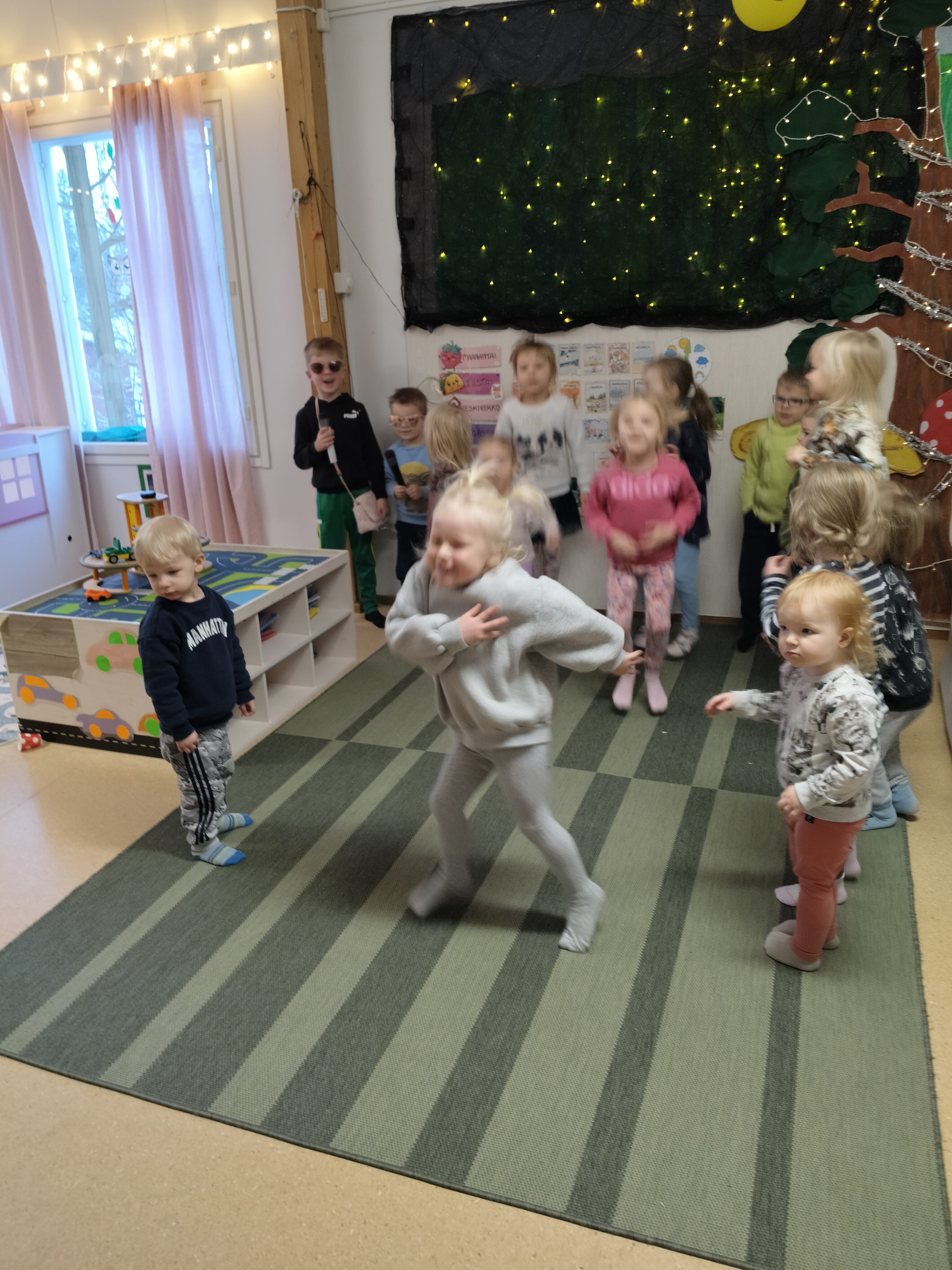 Lapset ovat olleet viimeaikoina todella innokkaita esiintymään ja aamupiirillä olemmekin saaneet nauttia hienoista esityksistä 🙂 Lapset harjoittelivat myös mikrofoniin laulamista