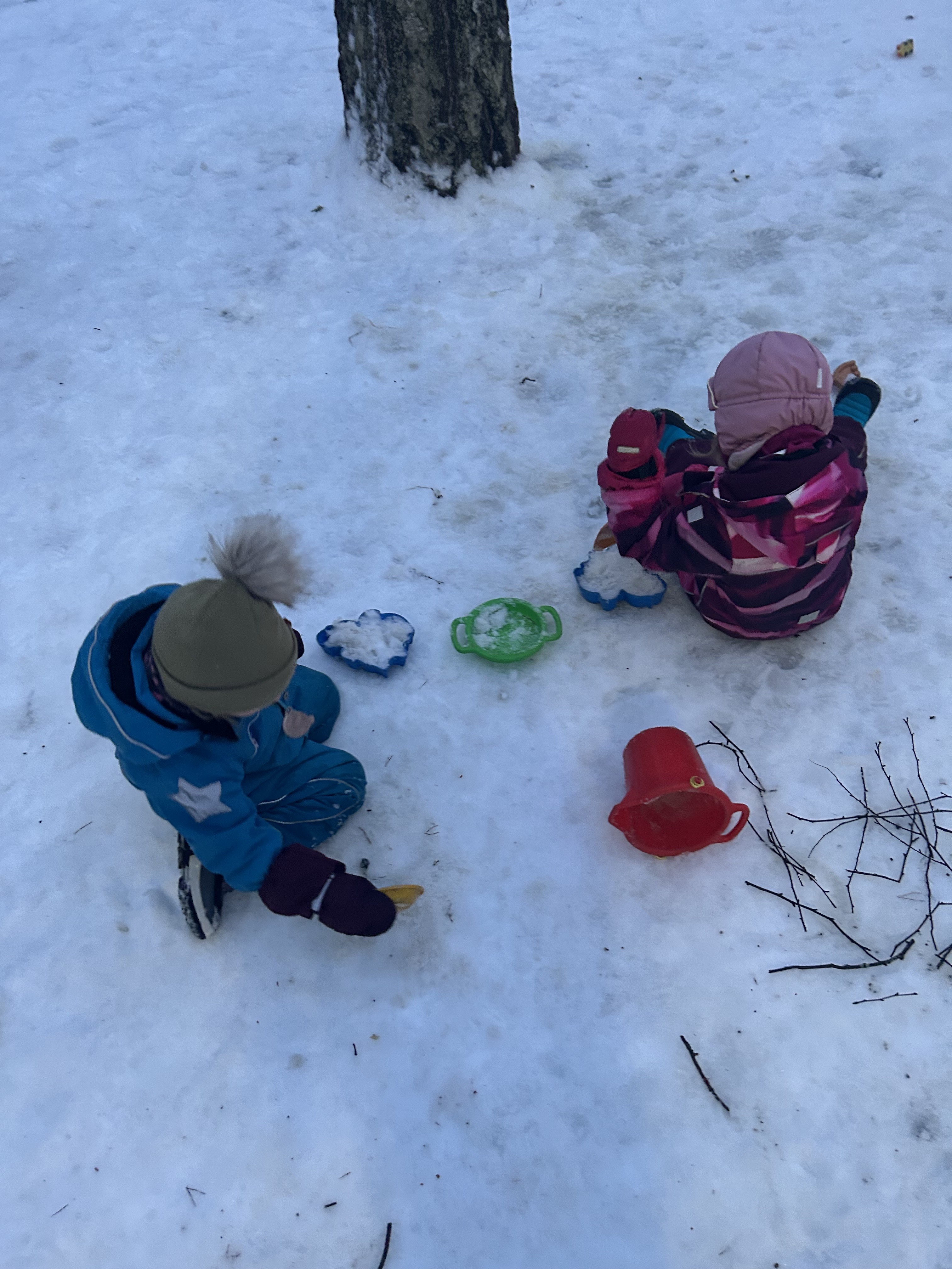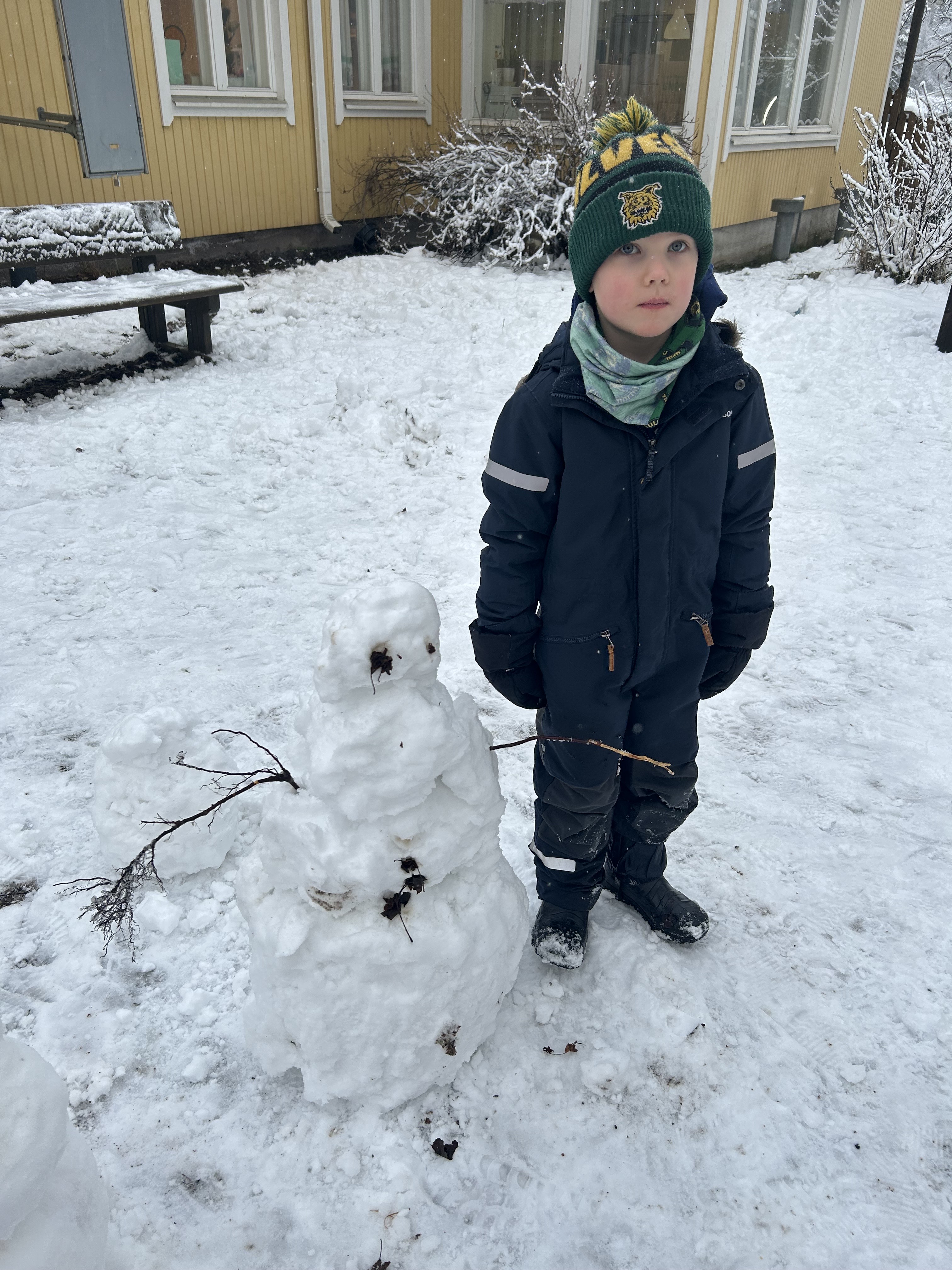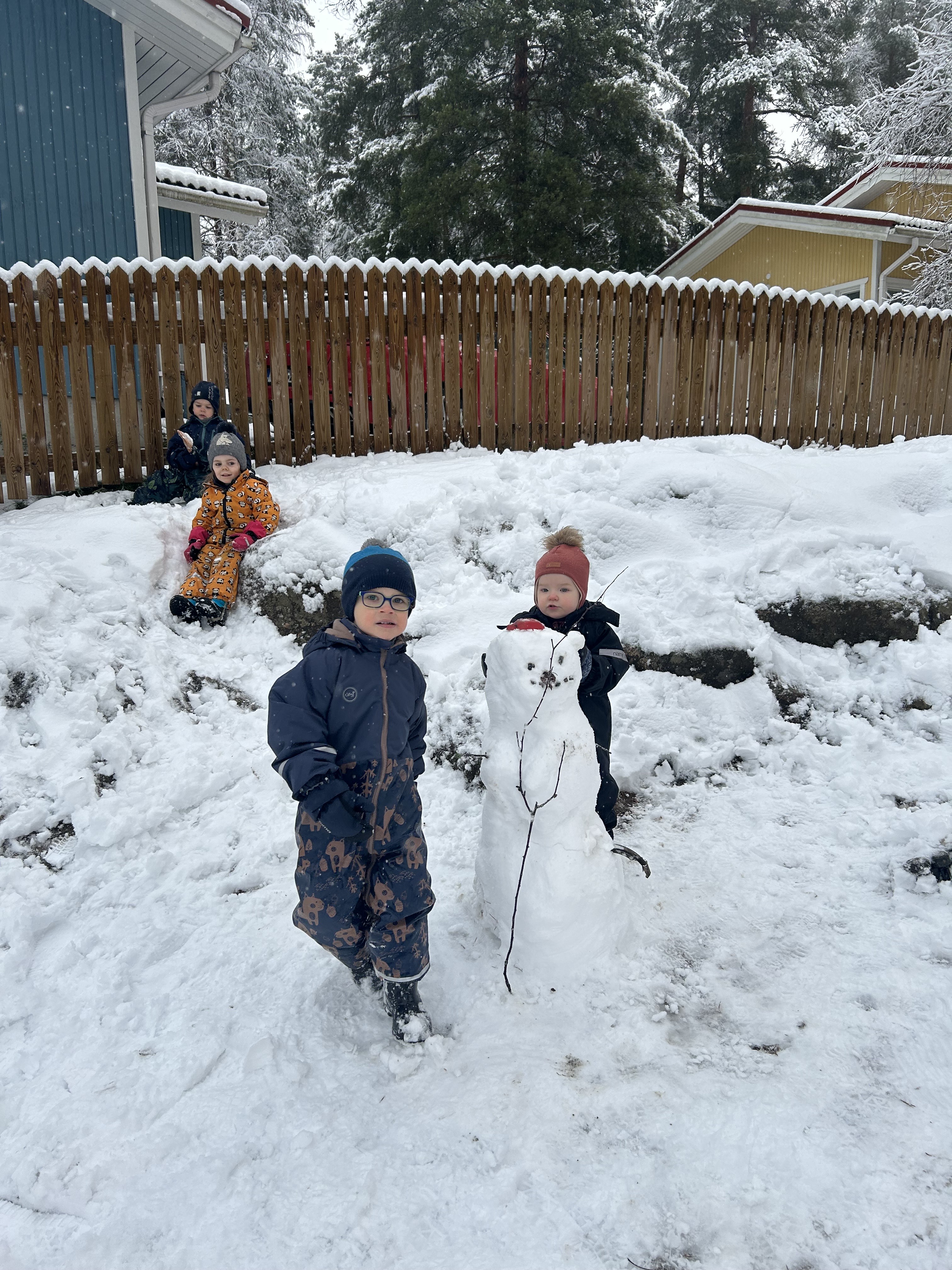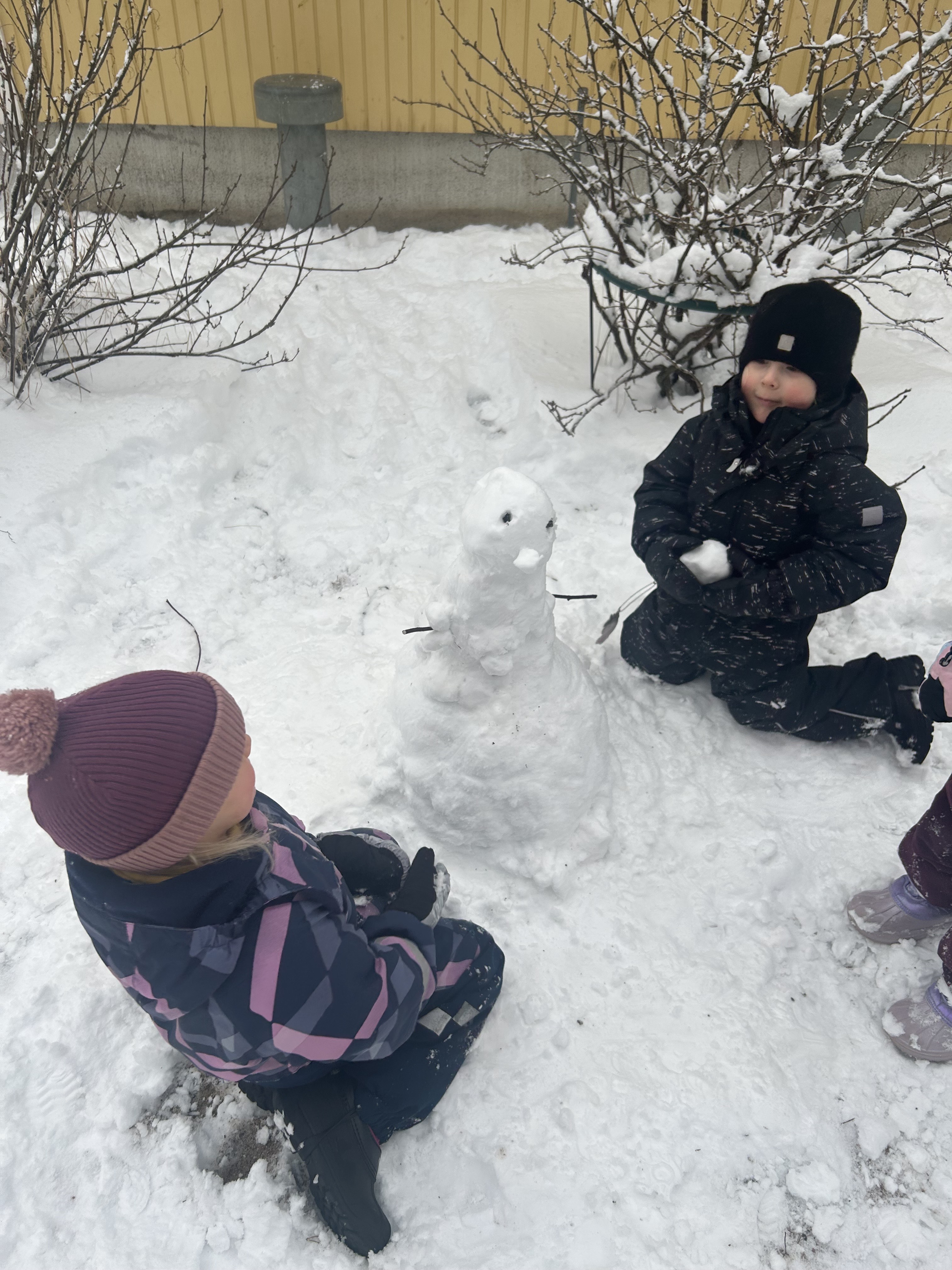 Ulkona saimme hetken nauttia lumesta ja tohina olikin melkoinen kun lumiukkoja alkoi tupsahtelemaan…