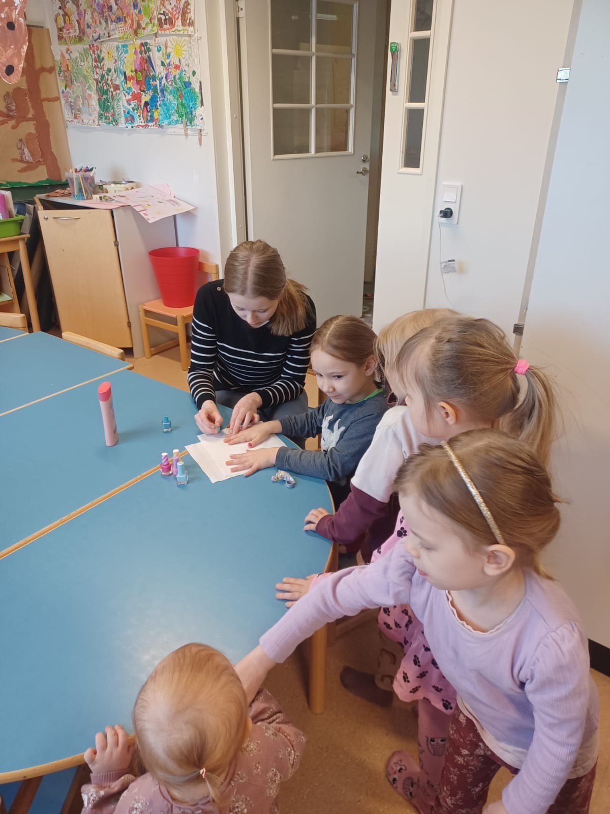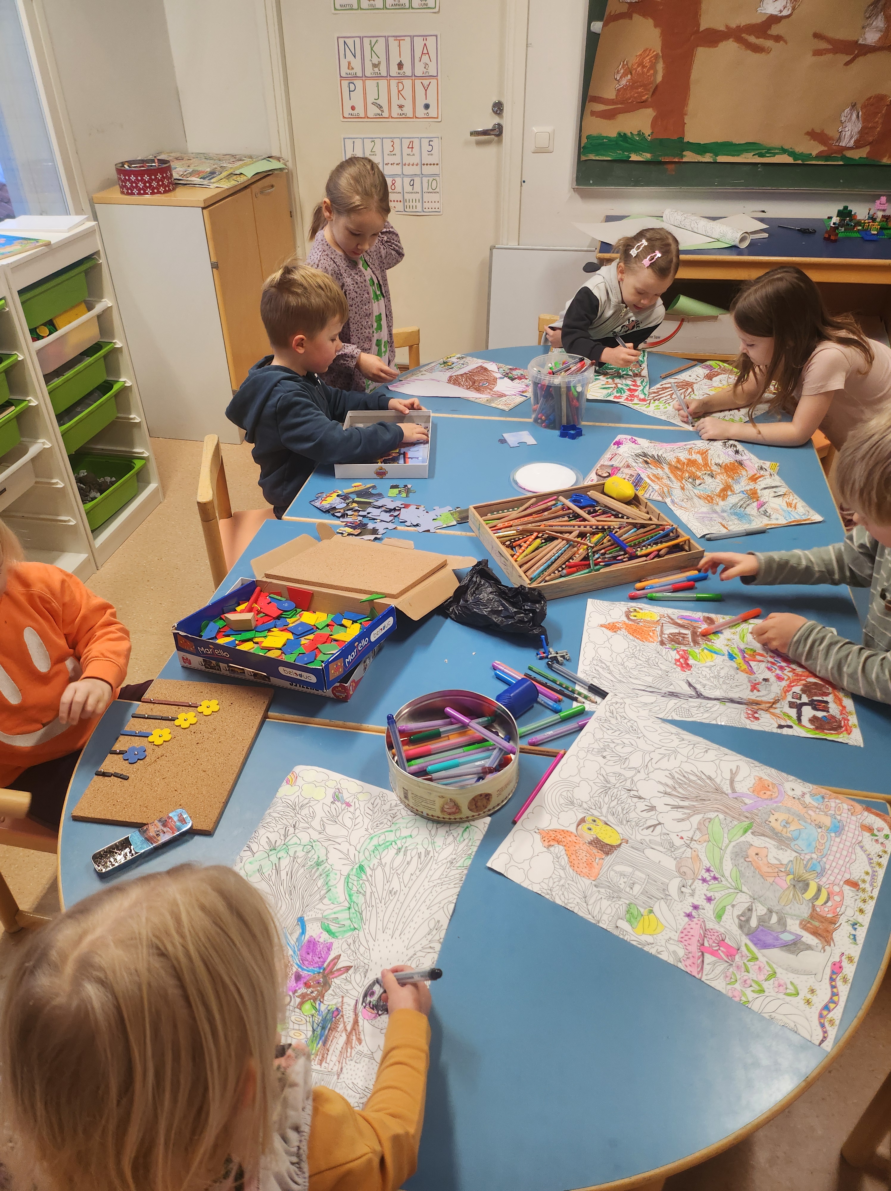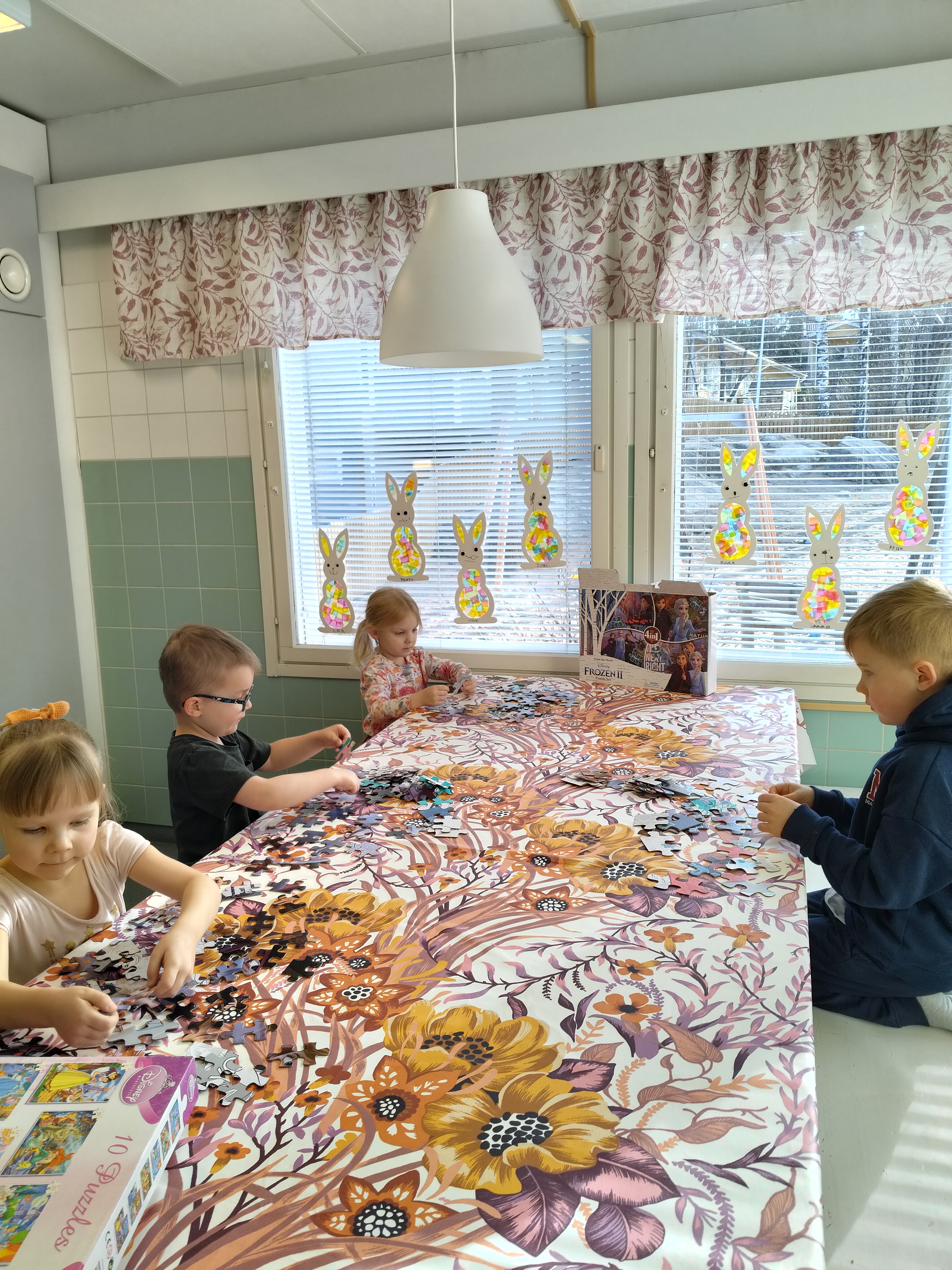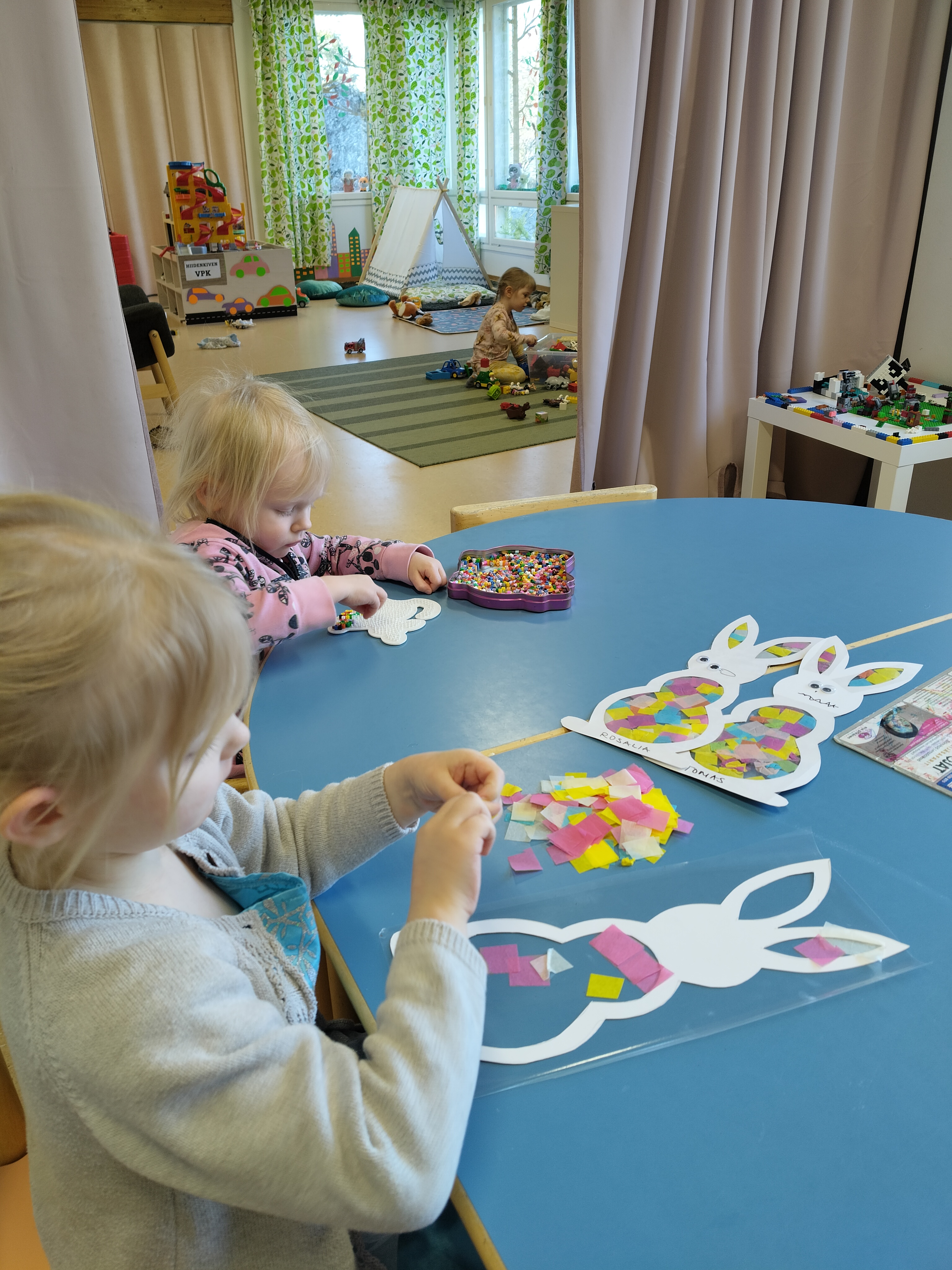 Pienryhmissä olemme pelailleet lautapelejä sekä palapelejä, tehneet viskaritehtäviä, leikkineet ja askarrelleet. Lasten osallisuus päästään hyvin huomioimaan pienryhmätoiminnassa. Tuuli pitää kevään aikana lapsille myös vuorovaikutuskerhoa pienryhmissä kerran viikossa. Tämä tukee vuorovaikutustaitojen kehittymistä ja yhteyden rakentamista leikkitilanteissa aikuisen ohjauksella.