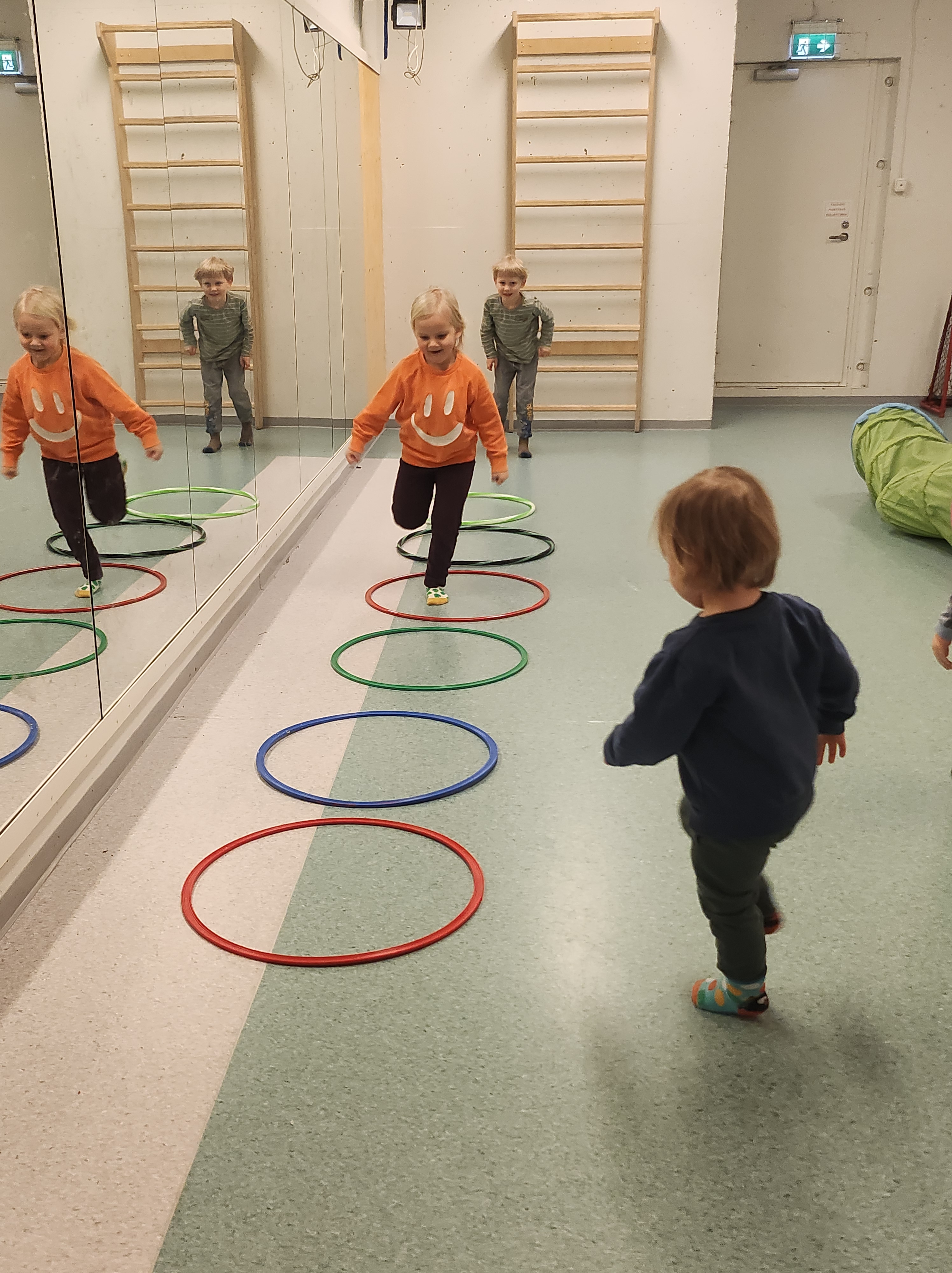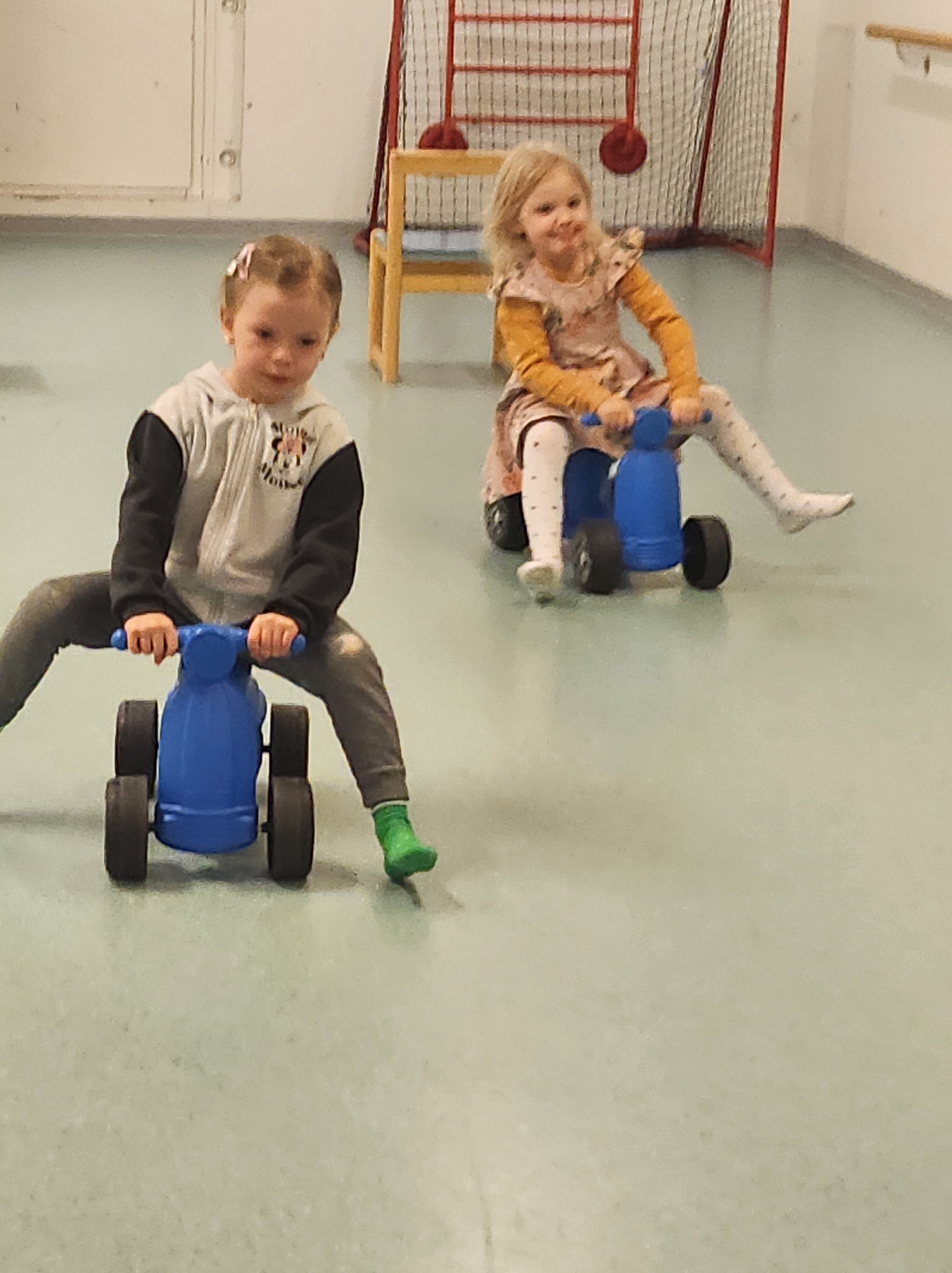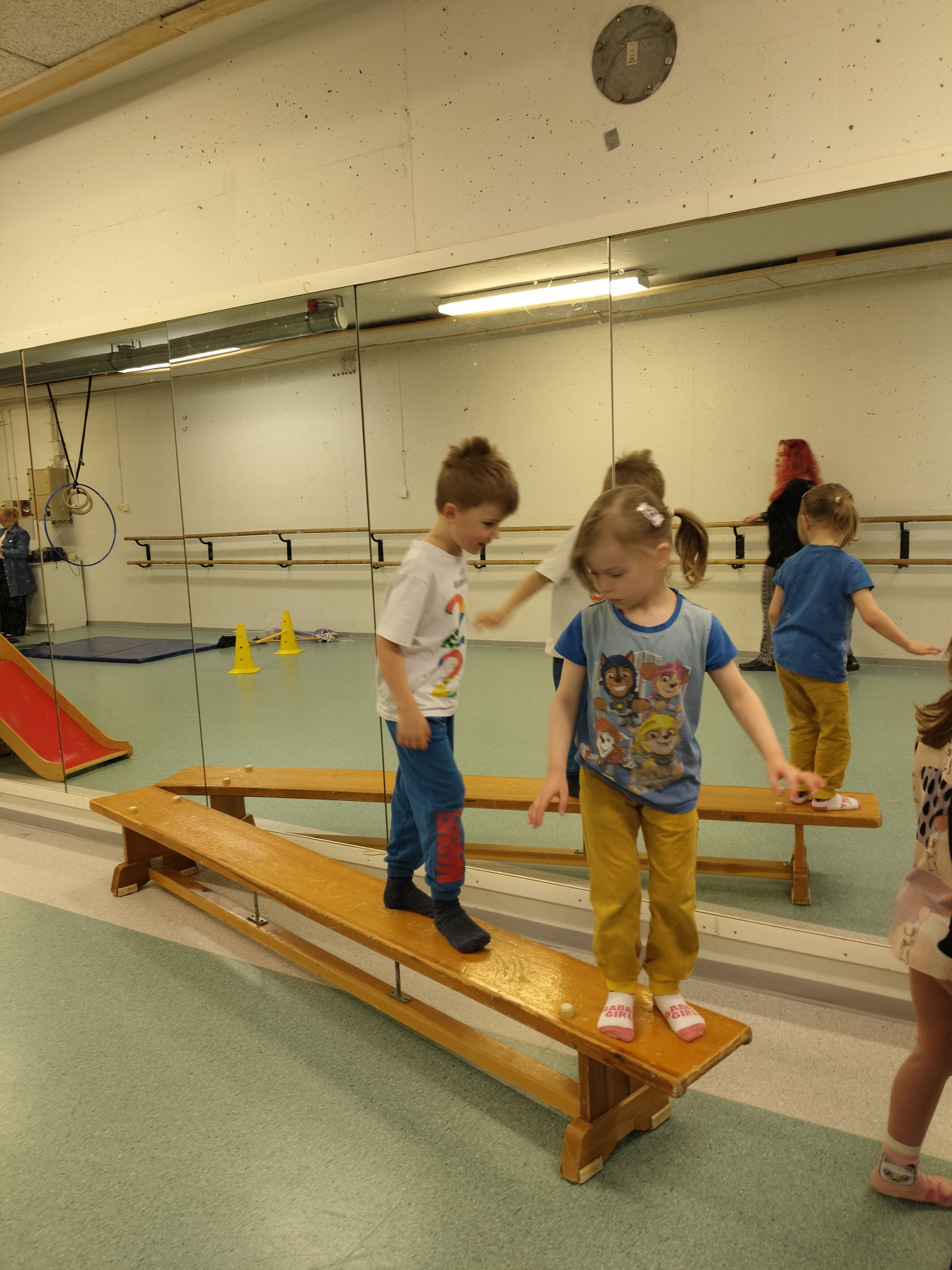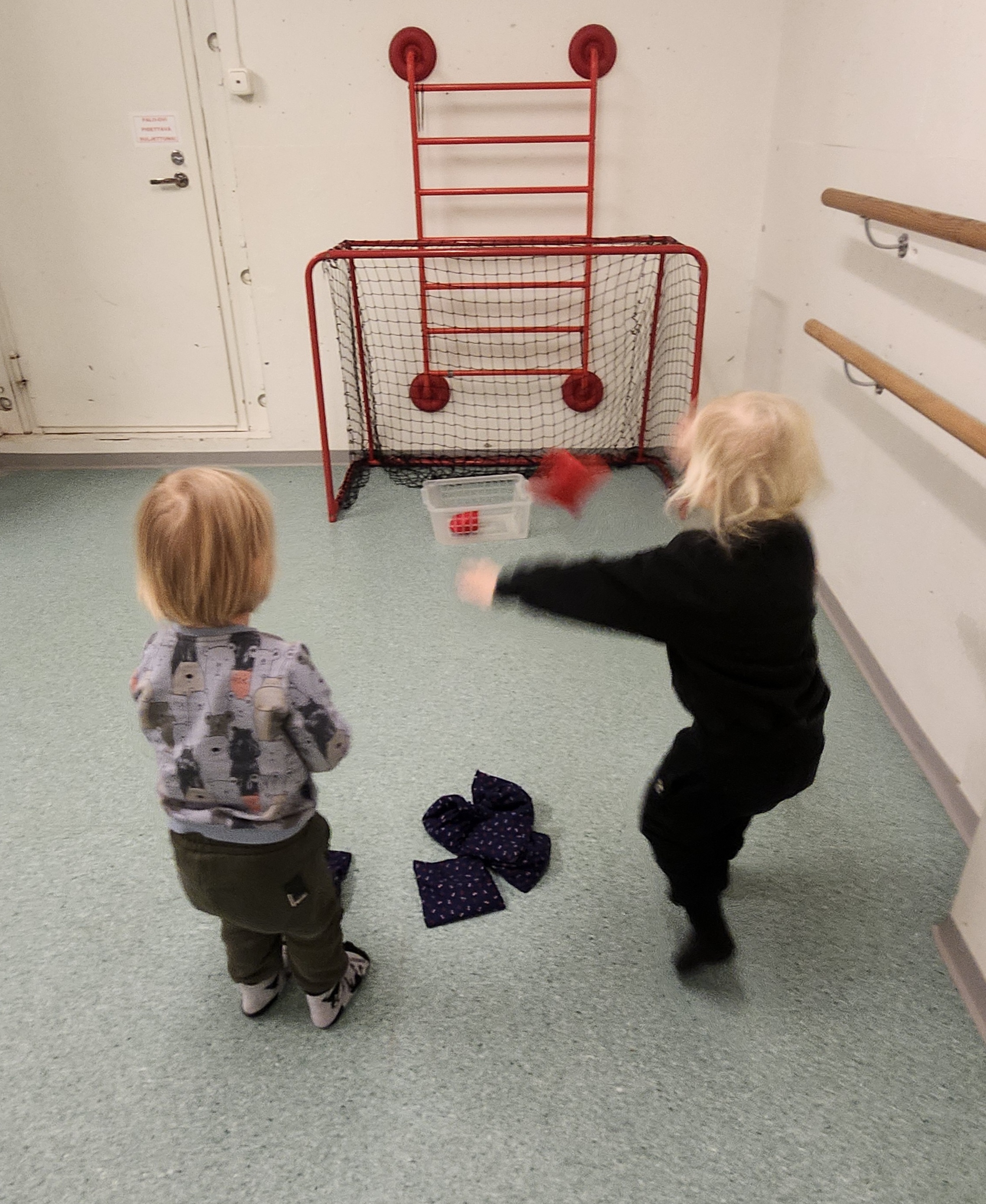 Jumpalla liikuttiin rummunsoiton tahtiin ja soiton pysähtyessä sai esittää haluamaansa eläintä. Toisella kierroksella leikittiin patsasleikkiä. Pallot ovat lasten oma suosikki ja niiden avulla tehtiin koordinaatioharjoitusta heittämällä sekä vierittämällä. Lopuksi pelasimme sählyä. Lapset ovat kehitelleet hauskoja tuuletuksia aina kun saavat maalin 🙂