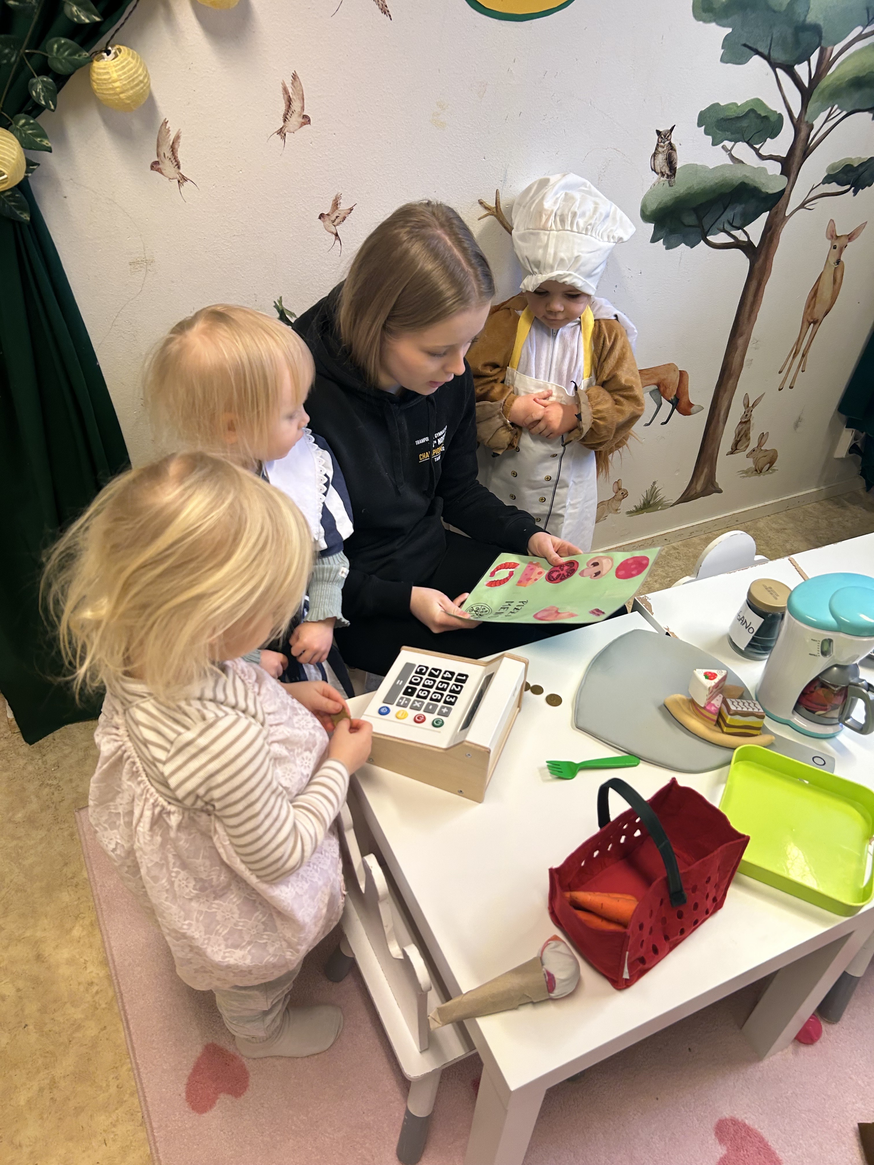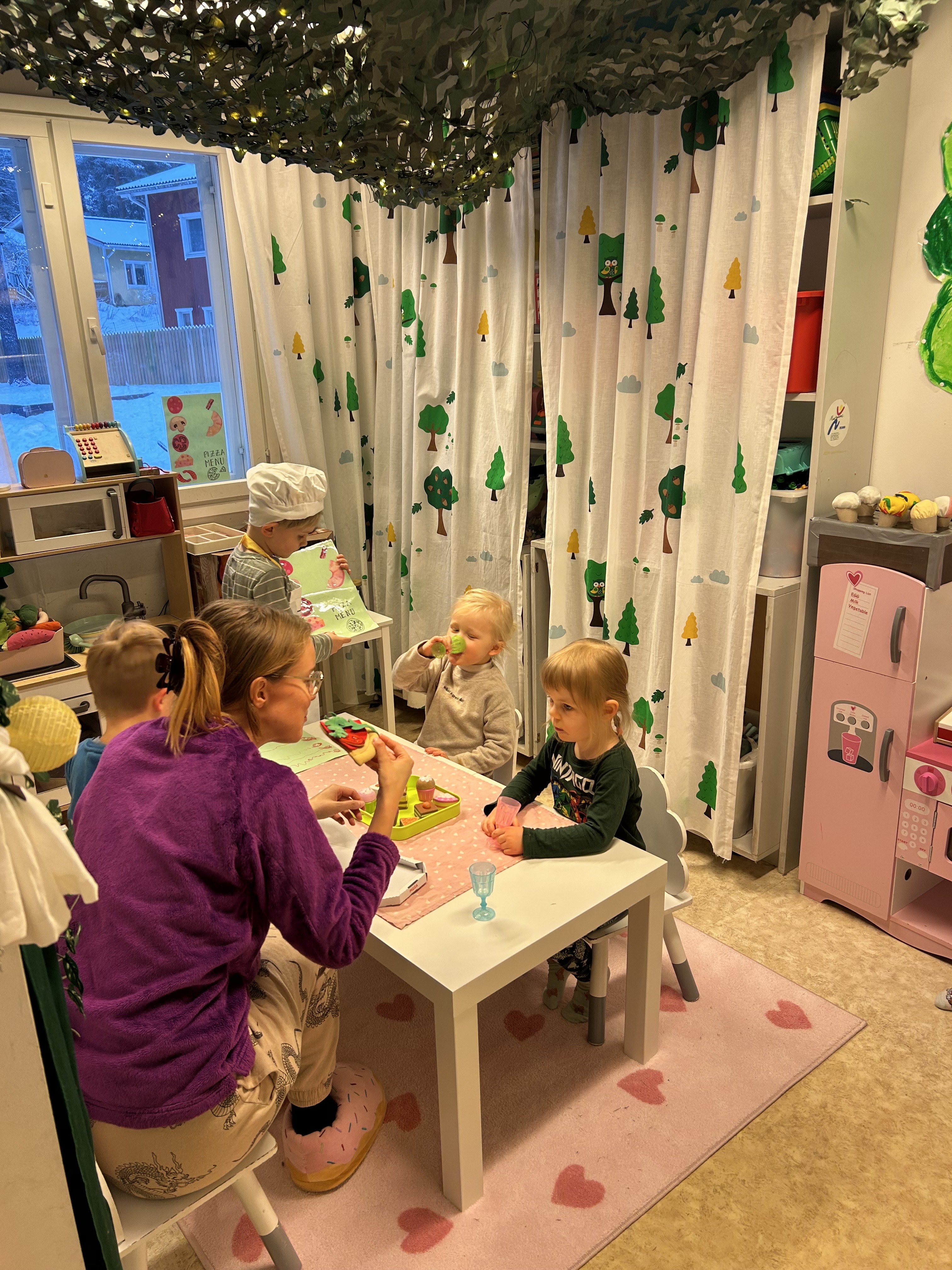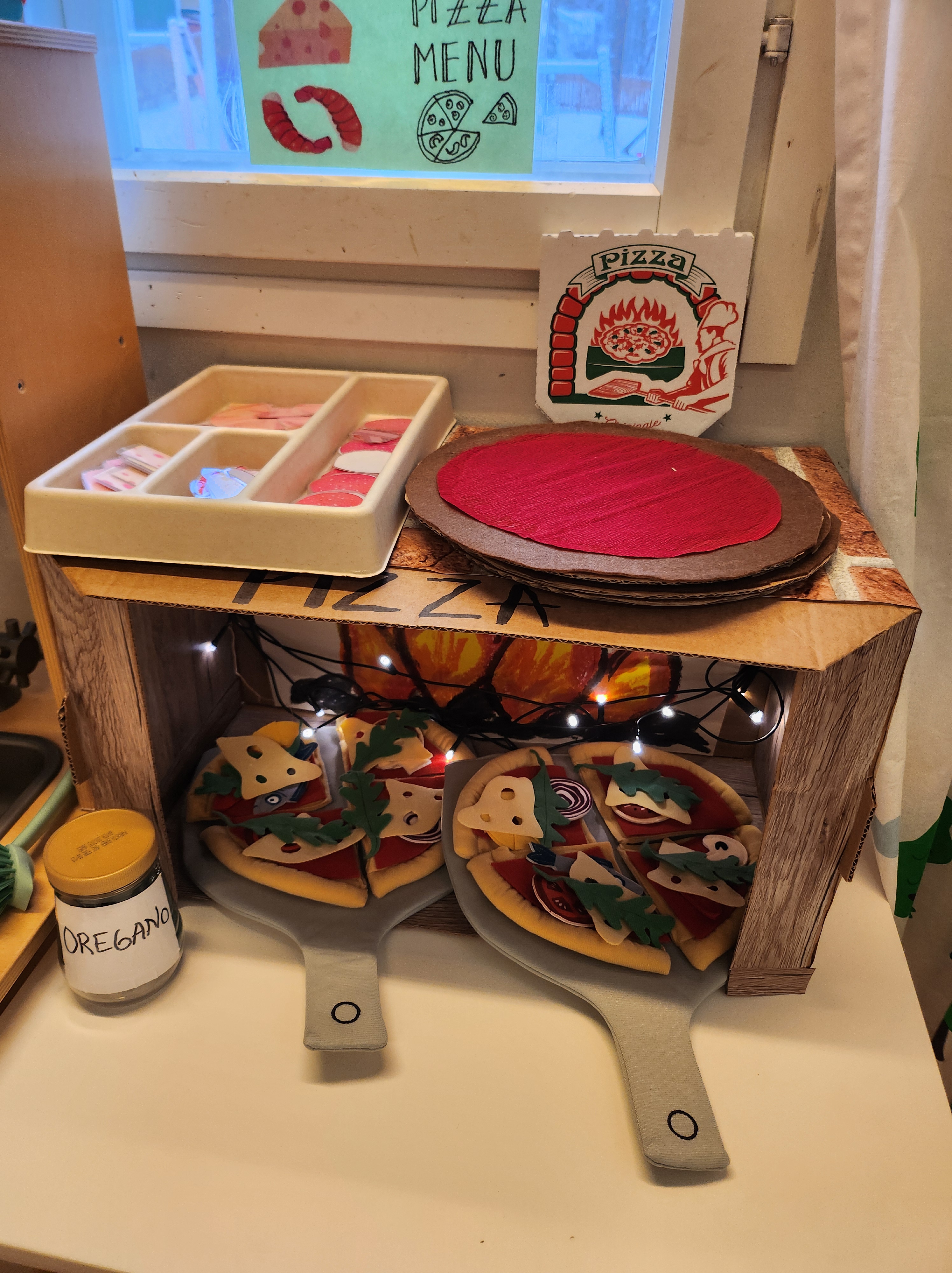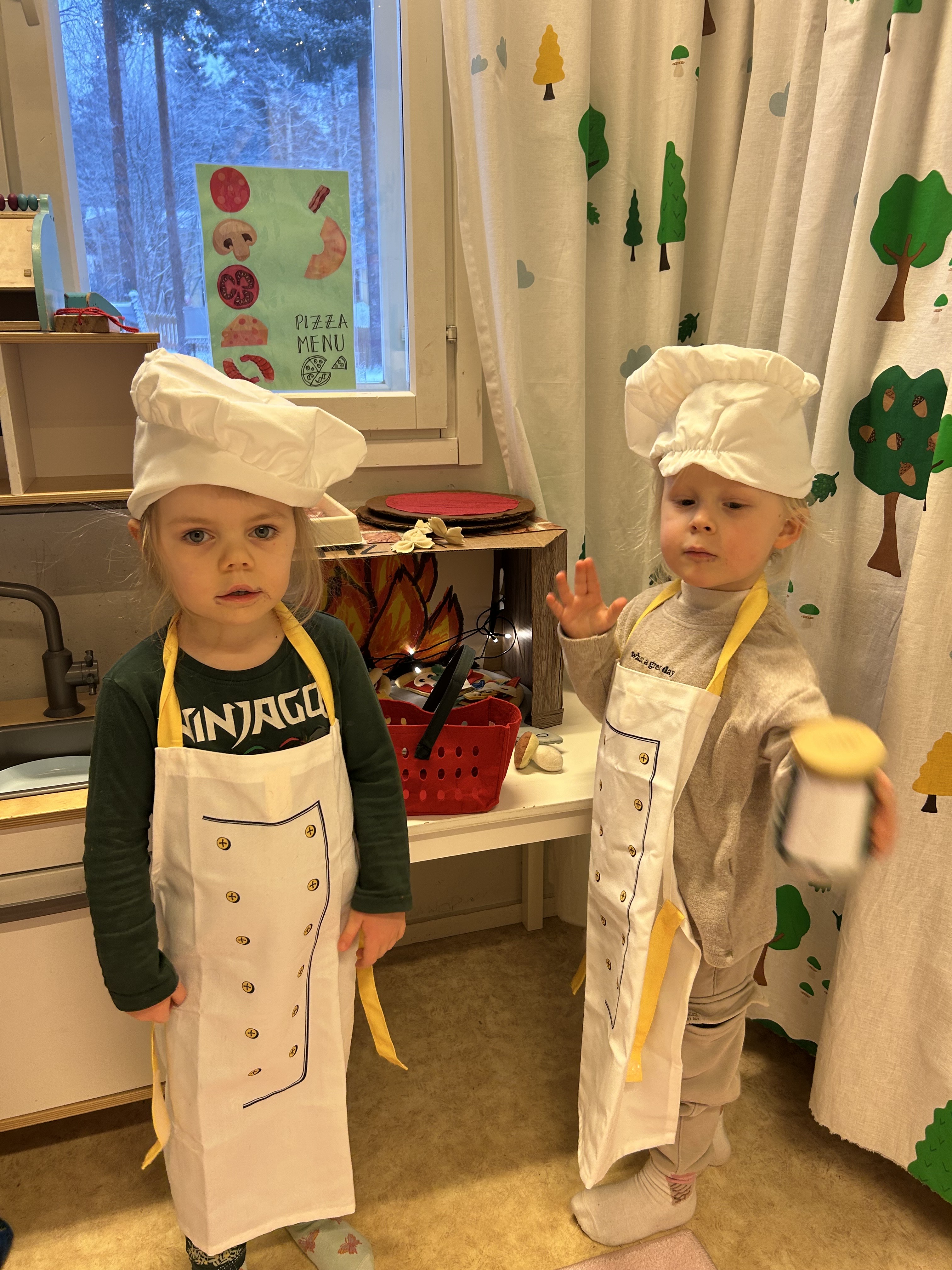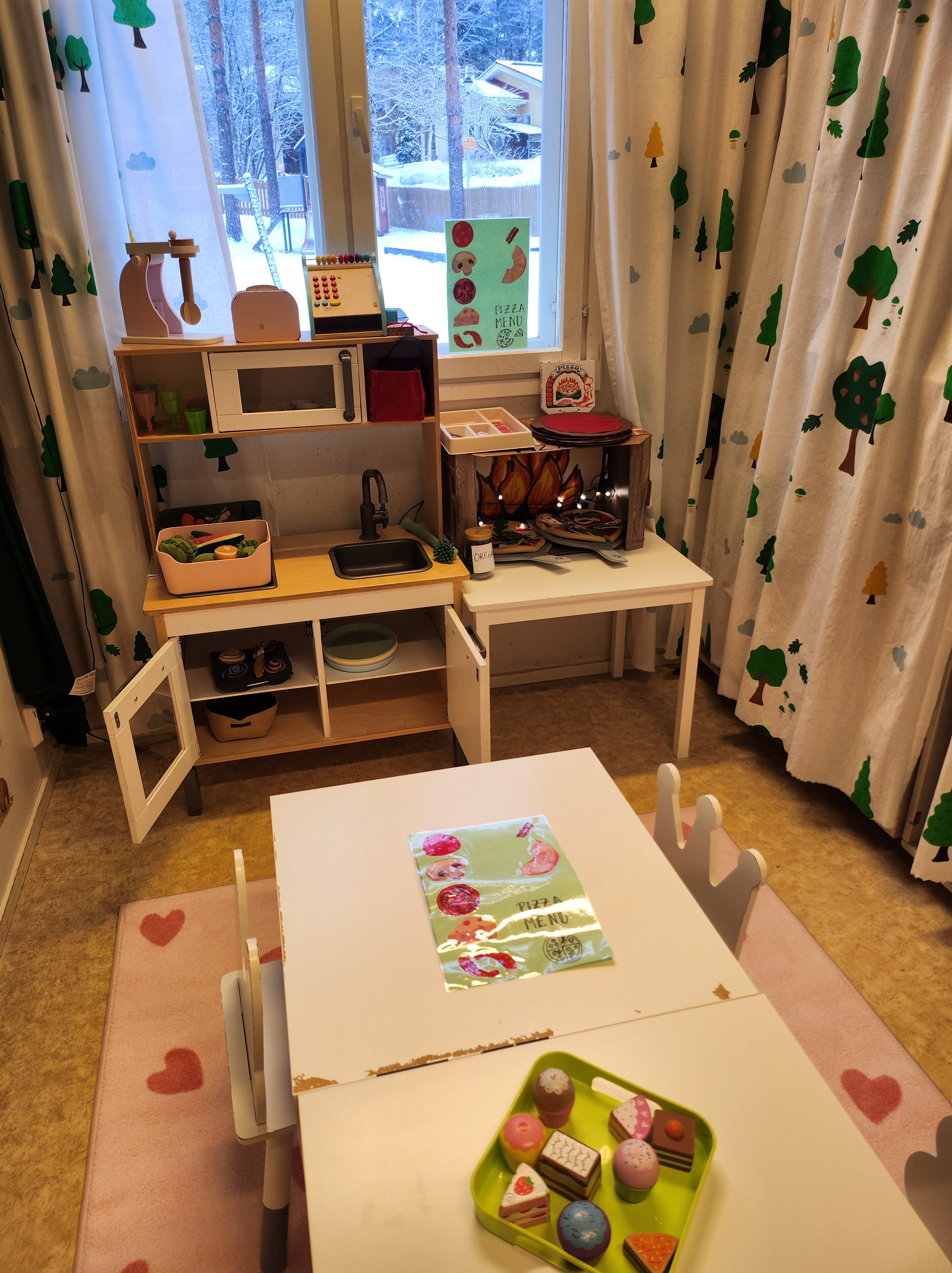 Lapsen osallisuus ryhmän toiminnassa huomioidaan päivittäin arjen eri askareissa. Lapset ovat olleet todella innokkaita pitämään aamupiiriä ja he pääsevät osallistumaan leikin rakentamiseen yhdessä aikuisen kanssa. Tällä hetkellä suunnittelemme leikkiympäristöjen piristämistä ja olemmekin lasten kanssa askarrelleet jätskejä ja pizzoja tuleviin leikkeihin 🙂