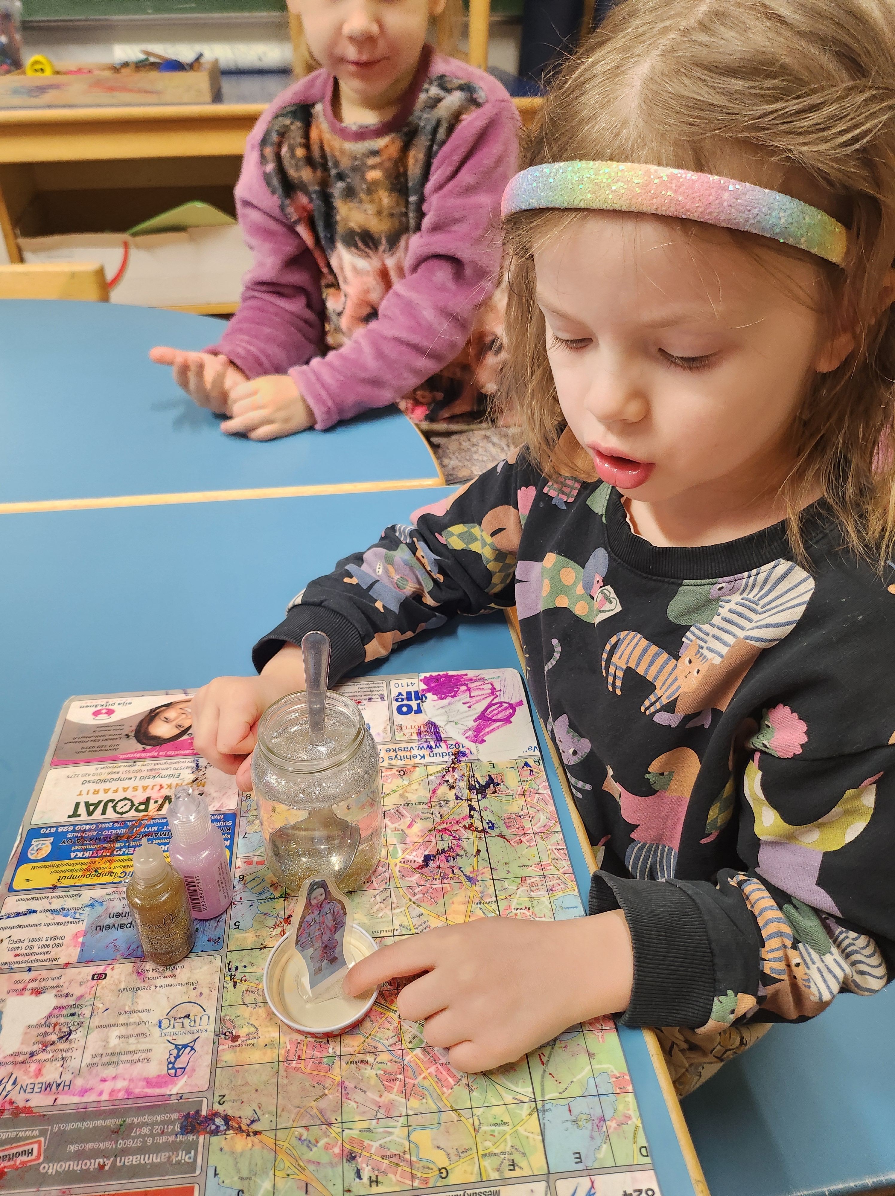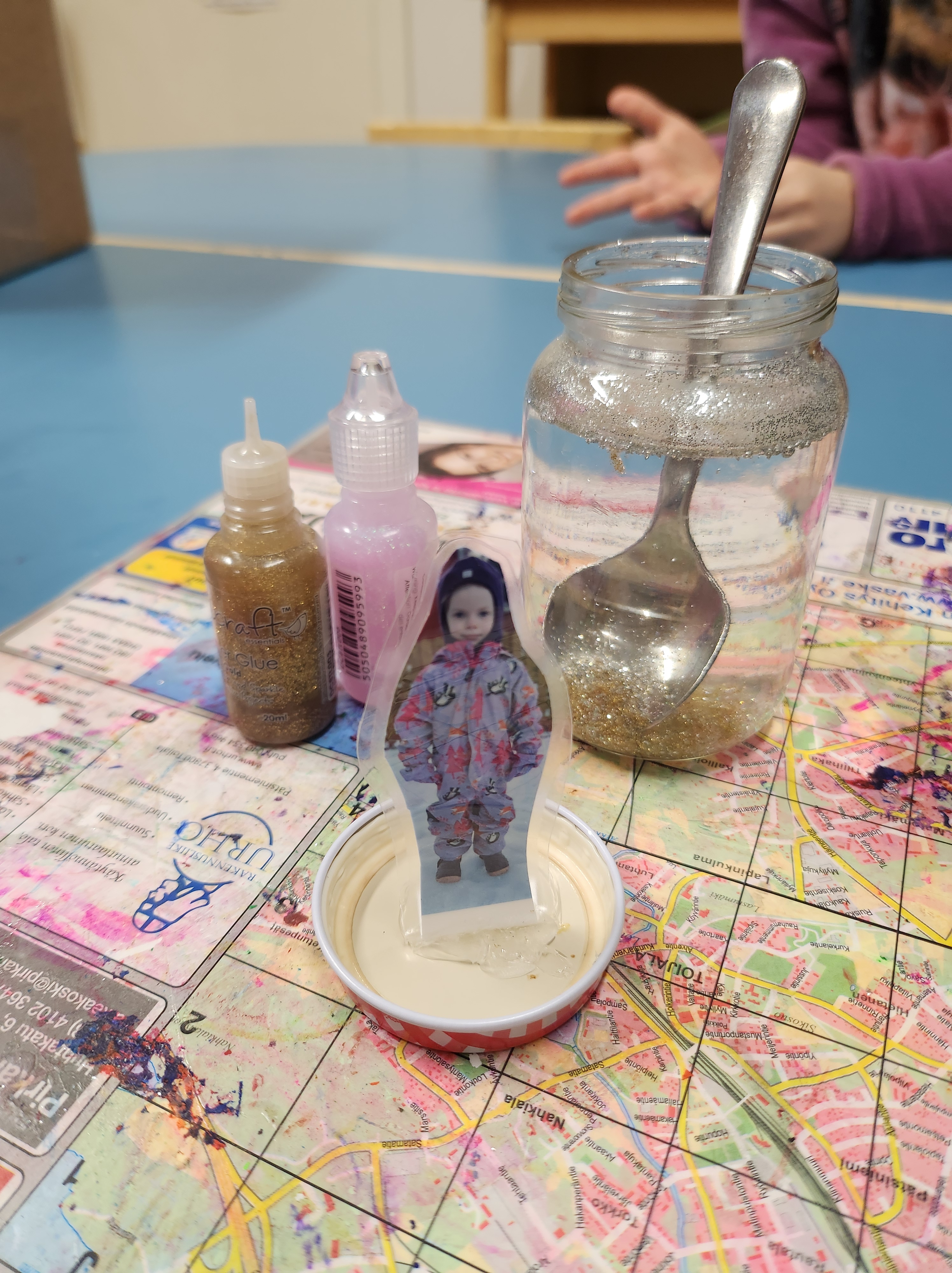 Teimme lasten kanssa hauskat lumisadepallot kimalleliimasta. Lapset saivat liottaa veteen kimalleliimaa ja laittaa omat kuvansa koristamaan palloa. Tämä toimi myös hauskana tieteellisenä kokeiluna 🙂 näistä tulee hienoja!
