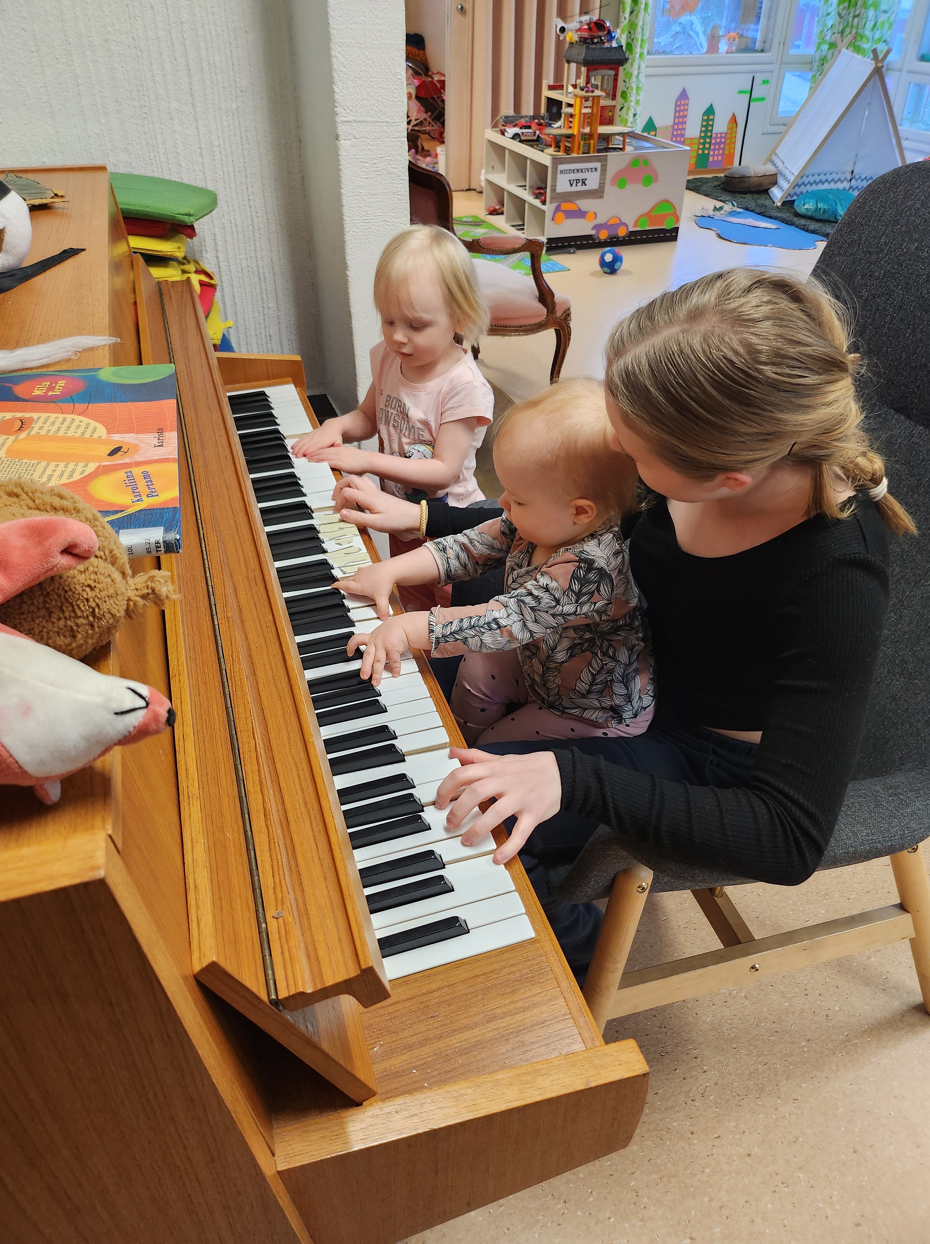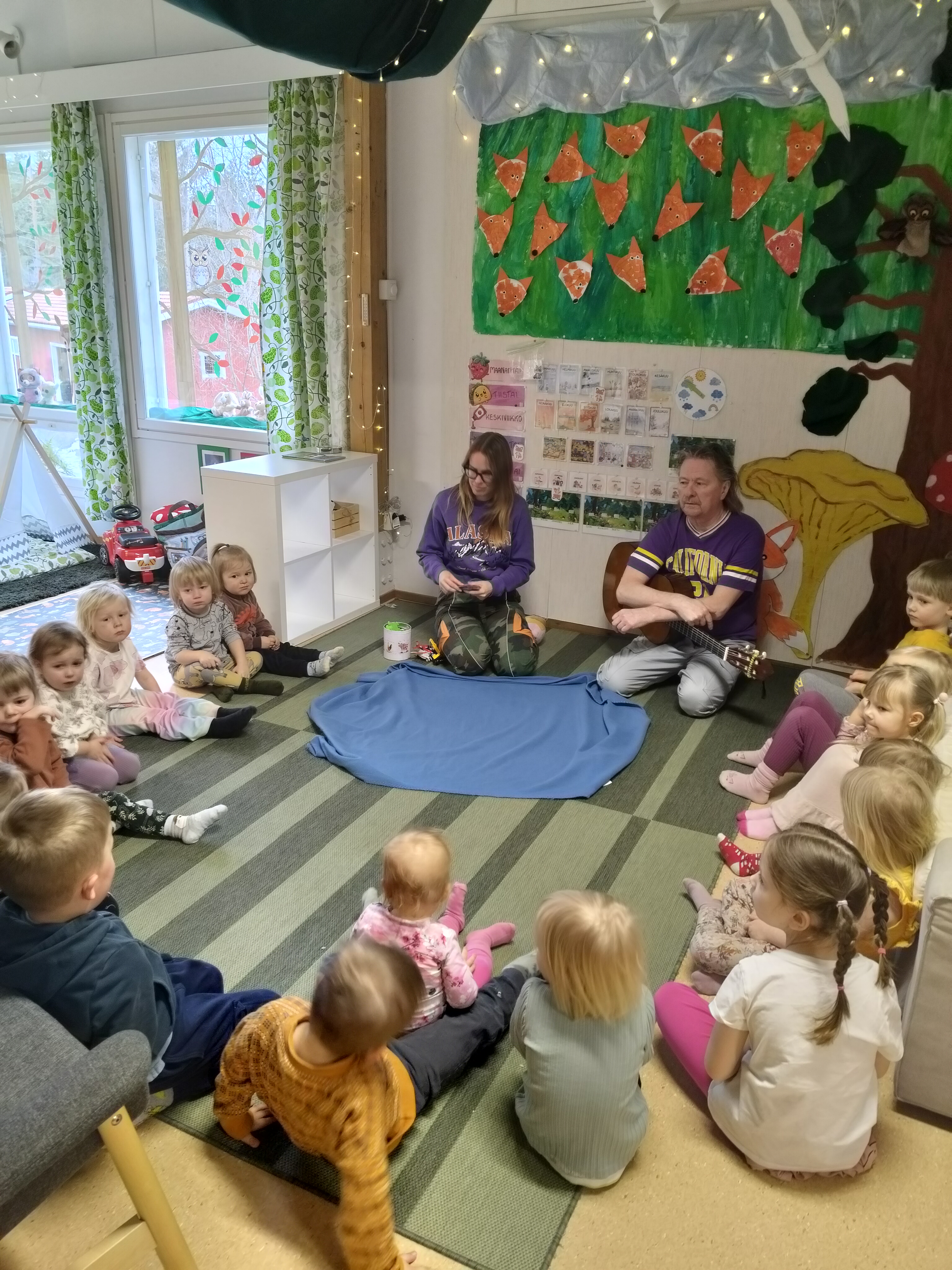 Musahetkellä lauloimme leikimme kannustuspiiriä. Lauloimme kielinuppua, metrolla mummolaan, sade lyö rumpua, jos sul on lysti on, havupuu ja lehtipuu, soittorasia sekä tutustuimme muutamiin soittimiin…