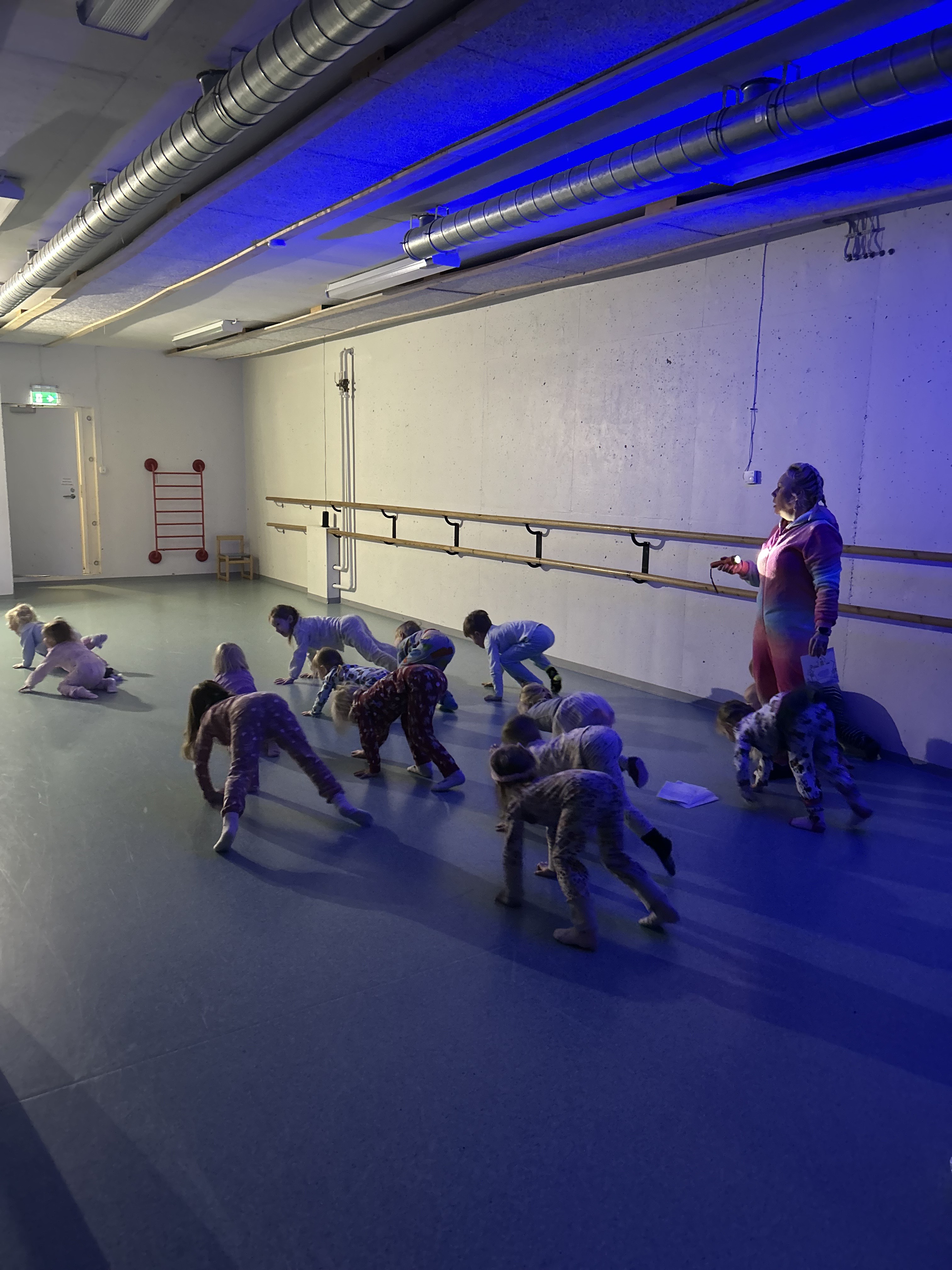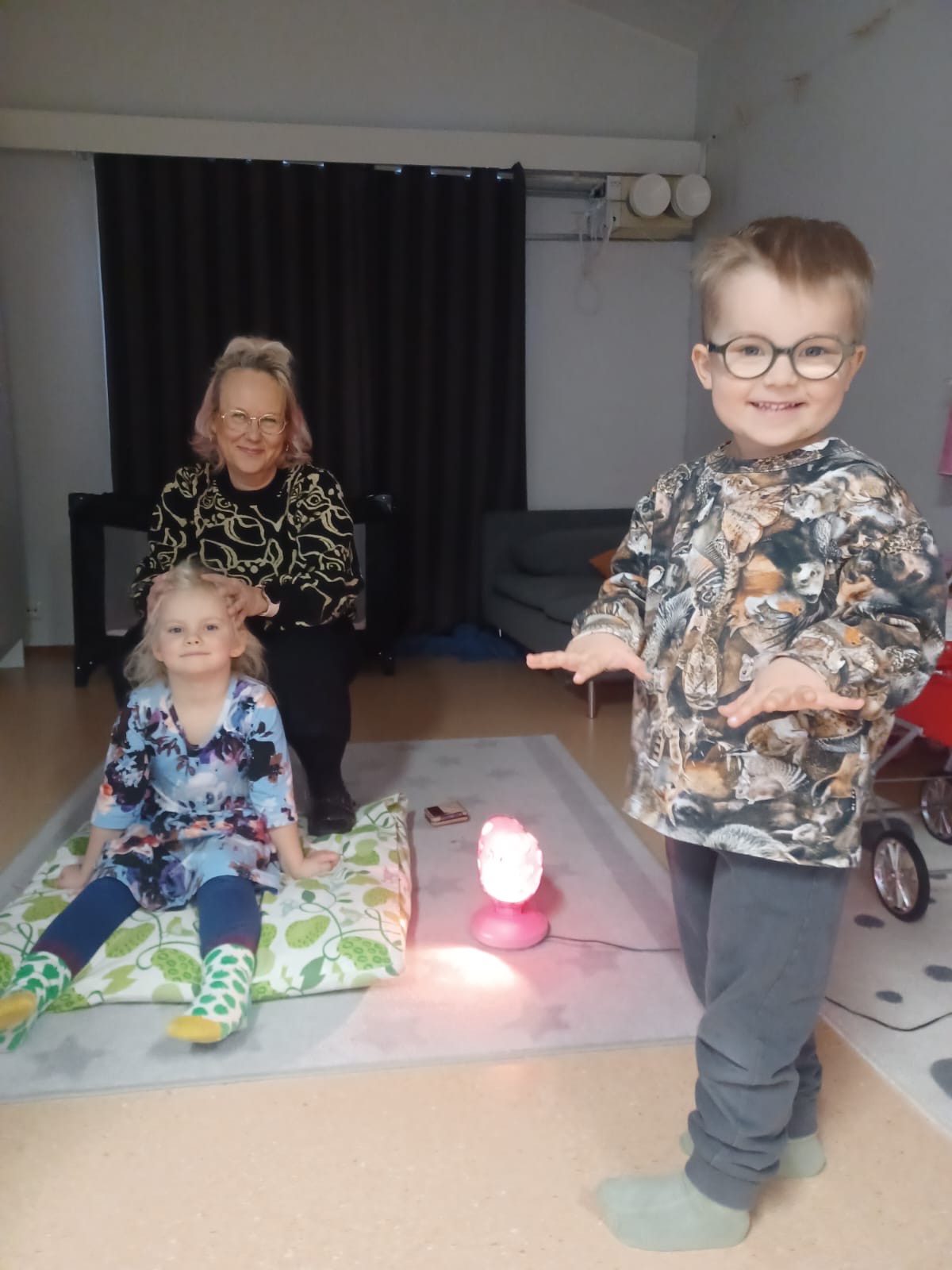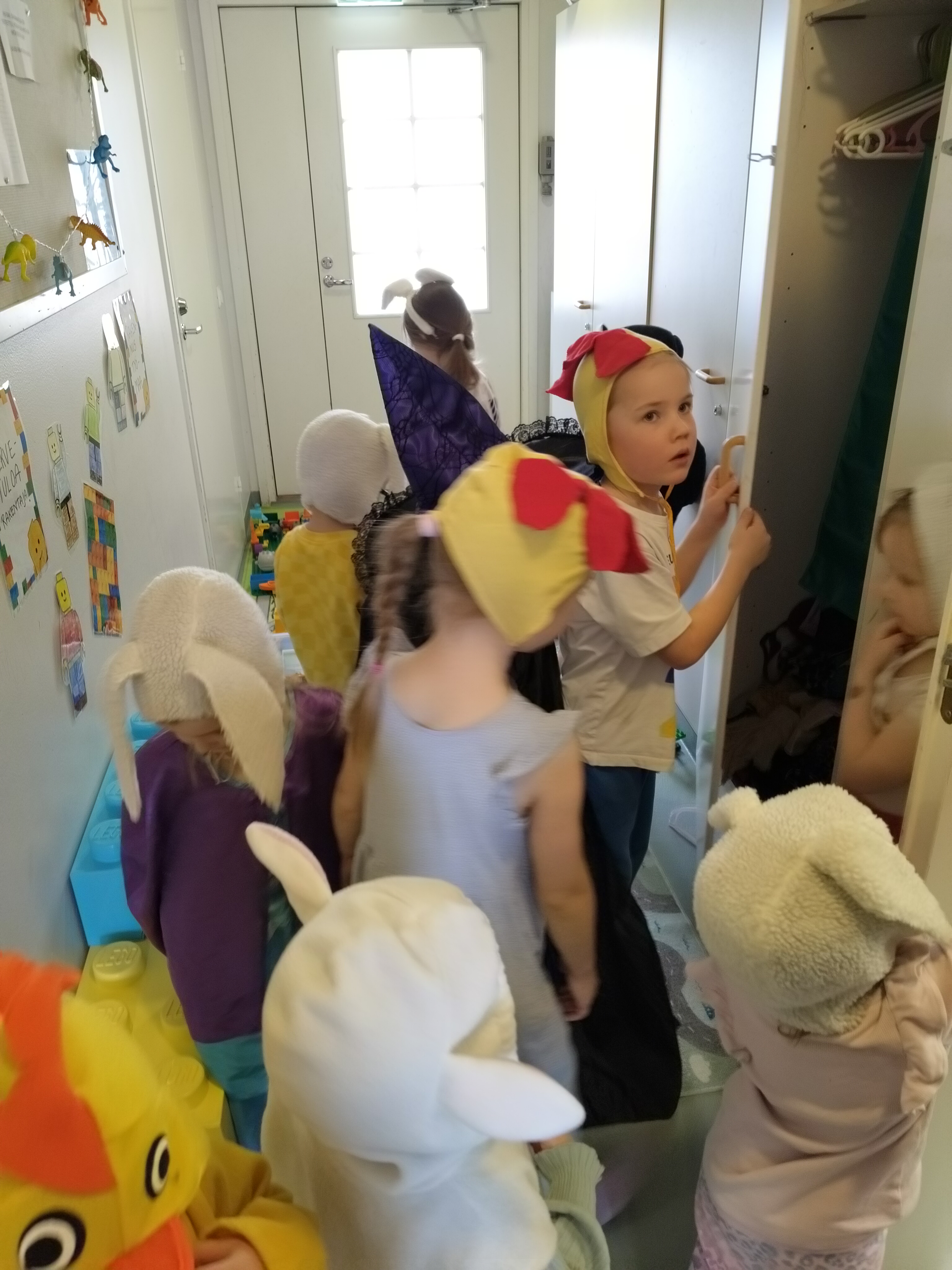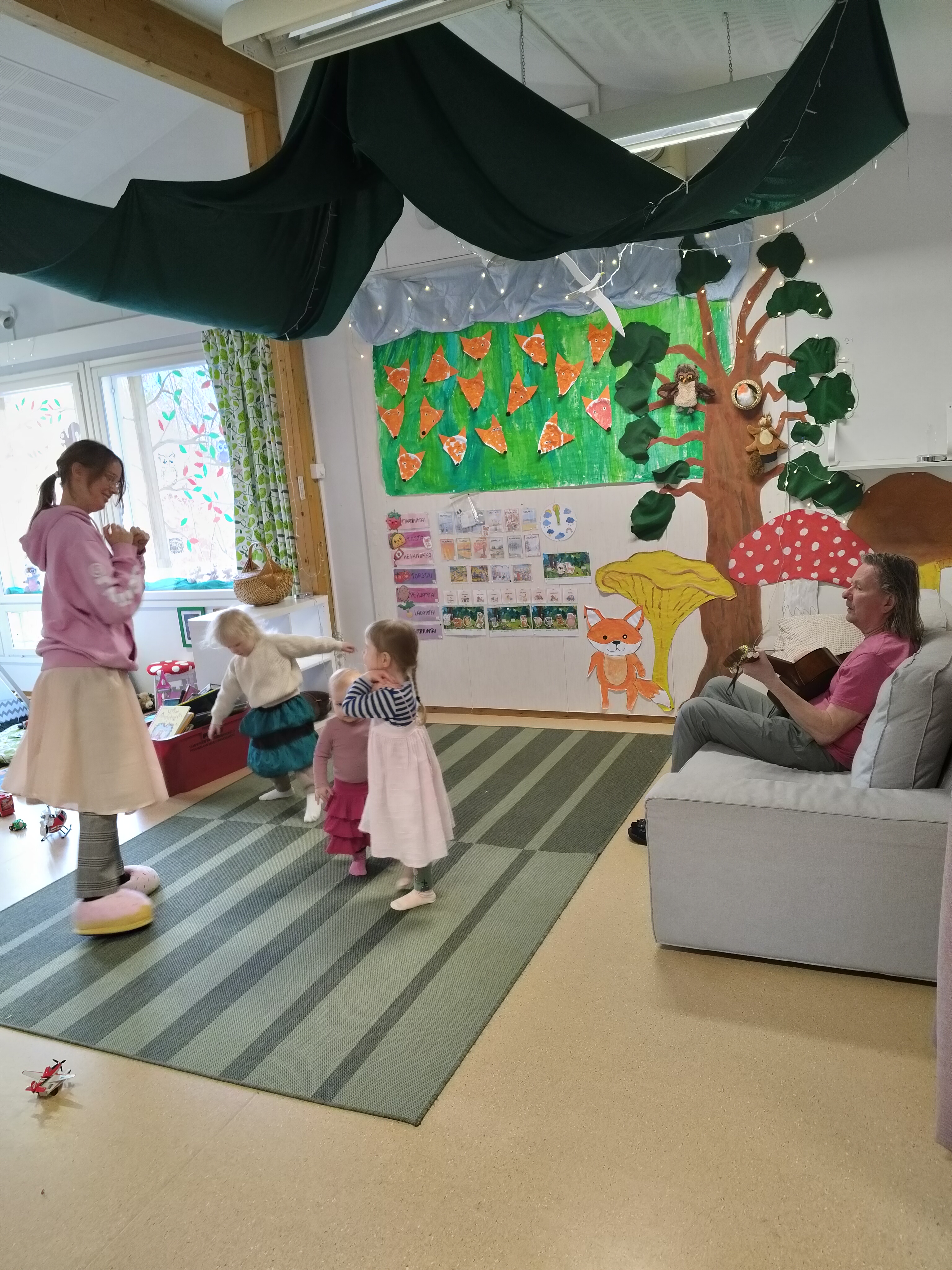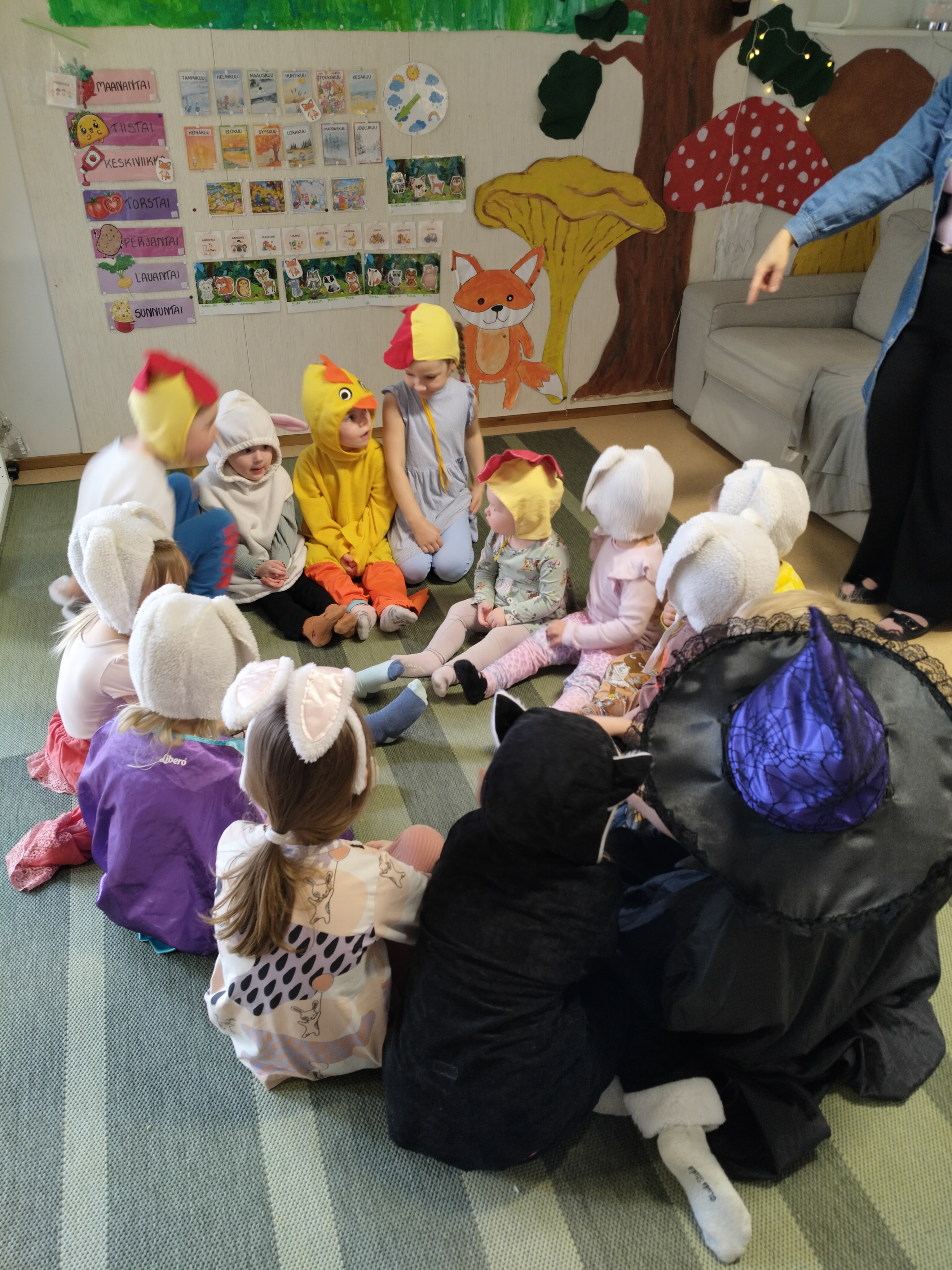 Opiskelijamme Ella piti lapsille sadutusta. Lapset innostuivat tarinan kerronnasta niin, että halusivat lopulta näytellä sen. Sadun nimi oli ”Ilkeä leijona ja kaksi pelokasta pupua & lentävä keijukainen”. Tämä oli hauska lasten oma projekti jossa he jokaiselle jakoivat roolit ja harjoittelivat kovasti. Esiintymispäivänä lapset kasasivat itse tuolit yleisölle ja kutsuivat kaikki paikalle. Esitys meni hienosti ja ryhmähenki oli ihailtavaa 🙂 esiintyjät saivat raikuvat aplodit!