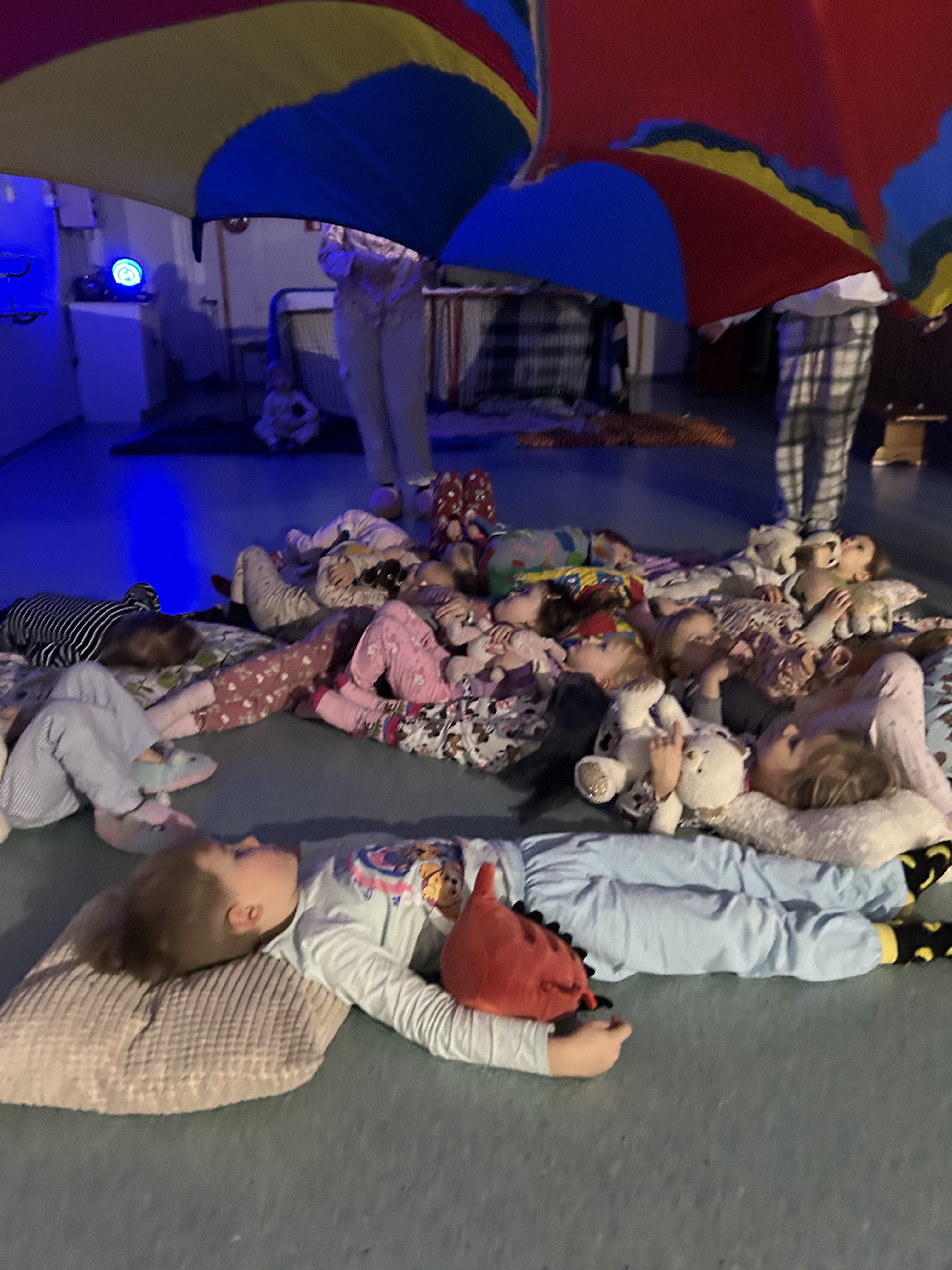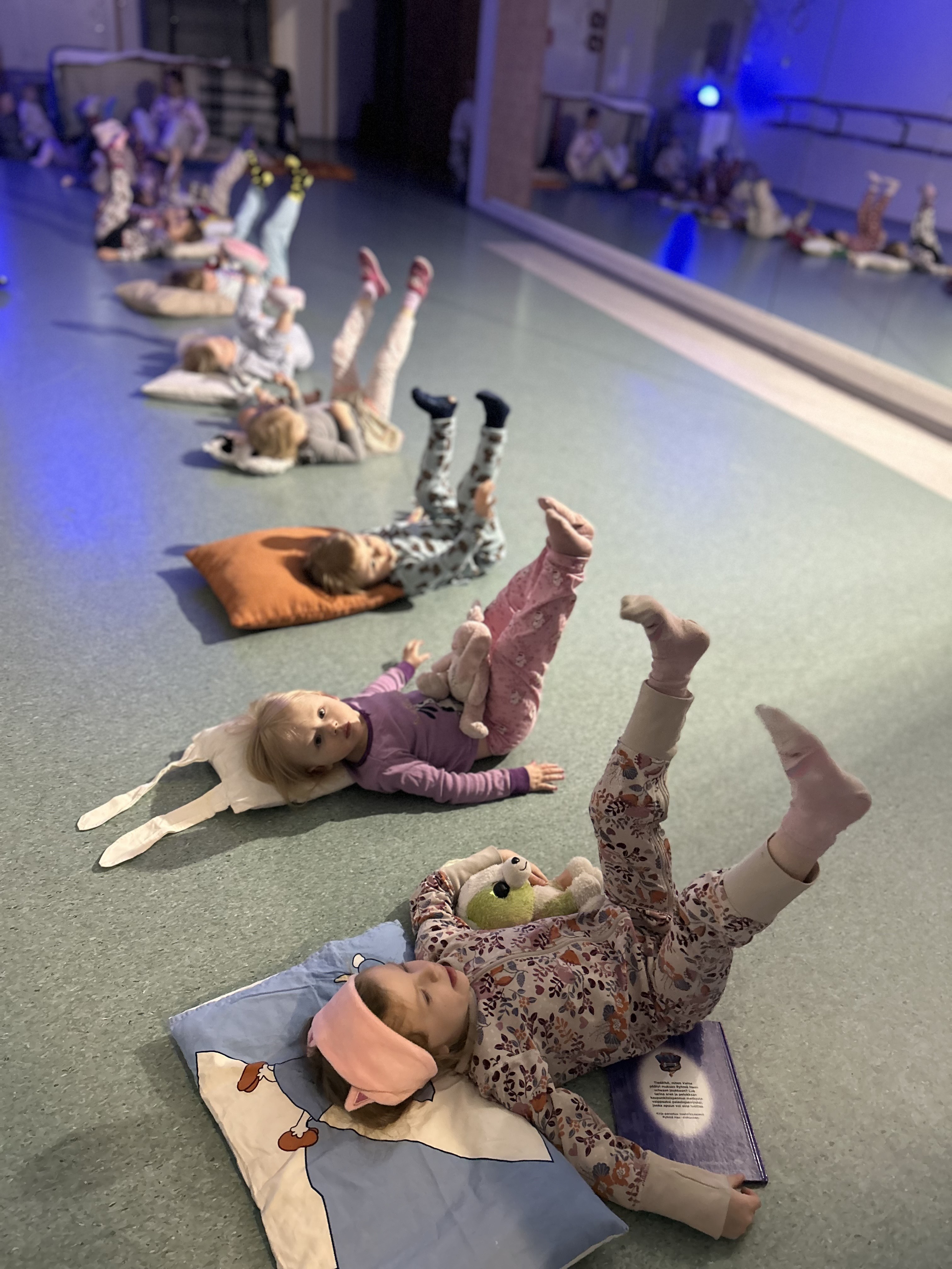 Viime viikon perjantaina vietimme lasten toivomaa pyjamassa päikkyyn päivää. Lapset saivat ottaa mukaansa tyynyn, pehmolelun ja kirjan. Tunnelma oli aamusta asti ihanan rauhallinen ja seesteinen 🙂 jumppasimme pommassa pehmolelujen kanssa, leikimme värivarjon alla, teimme rentoutumisharjoituksia ja luimme yhdessä kirjoja. Meillä oli todella kiva päivä lasten kanssa 🙂