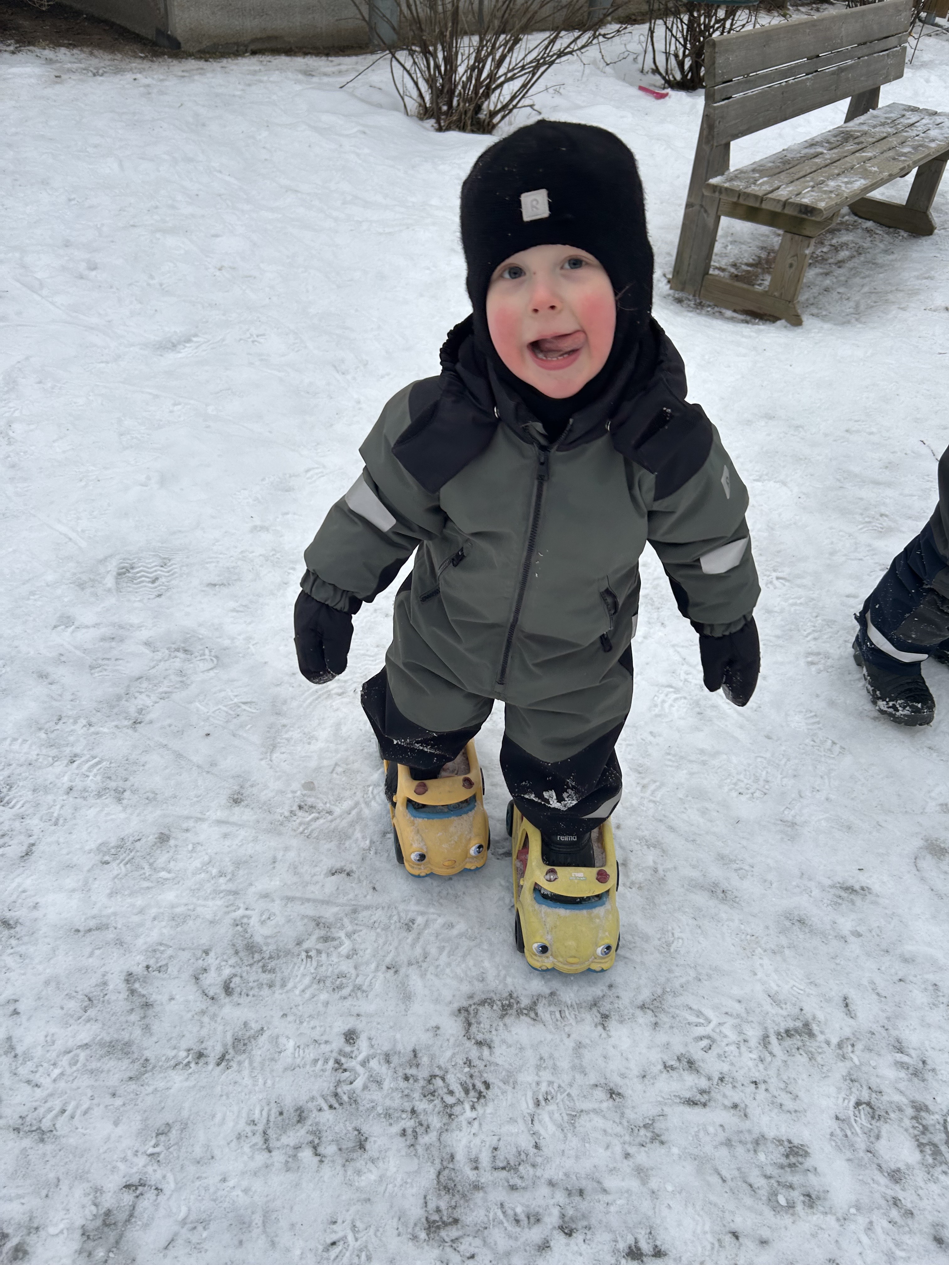 Lasten iloksi saimme paljon lunta ja haimme pulkat varastosta. Innostus oli suuri ja lapset odottivat pulkkia portin takana jännittyneinä… pääsimme laskemaan ja tekemään lumiukkoja 🙂
