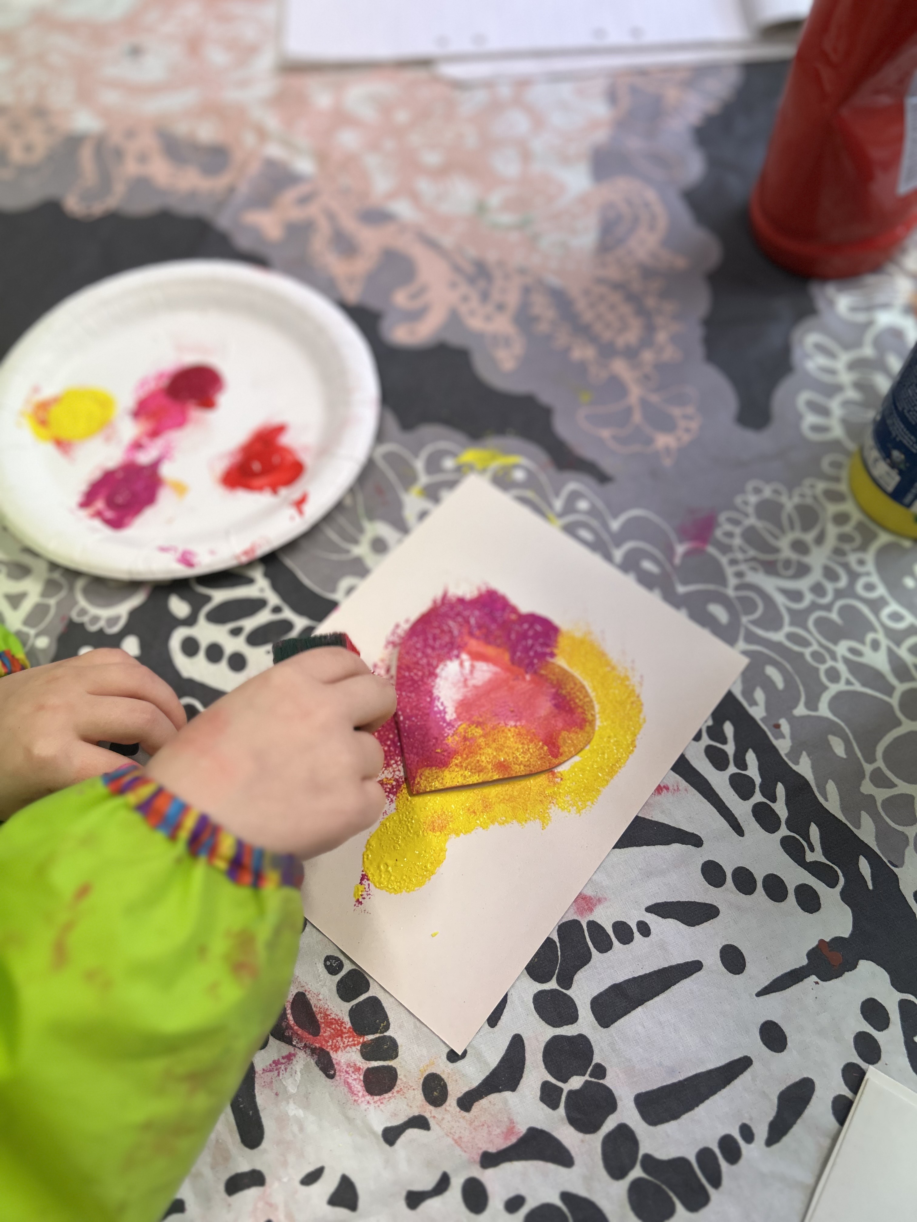 Saimme Taidetarvike Mannerilta kokeiluun askarteluhuopaa. Innostuimme maalaamaan huopaan värikkäitä sateenkaaria. Maali levittäytyy huopaan hauskasti ja elävoittää pintaa 🙂