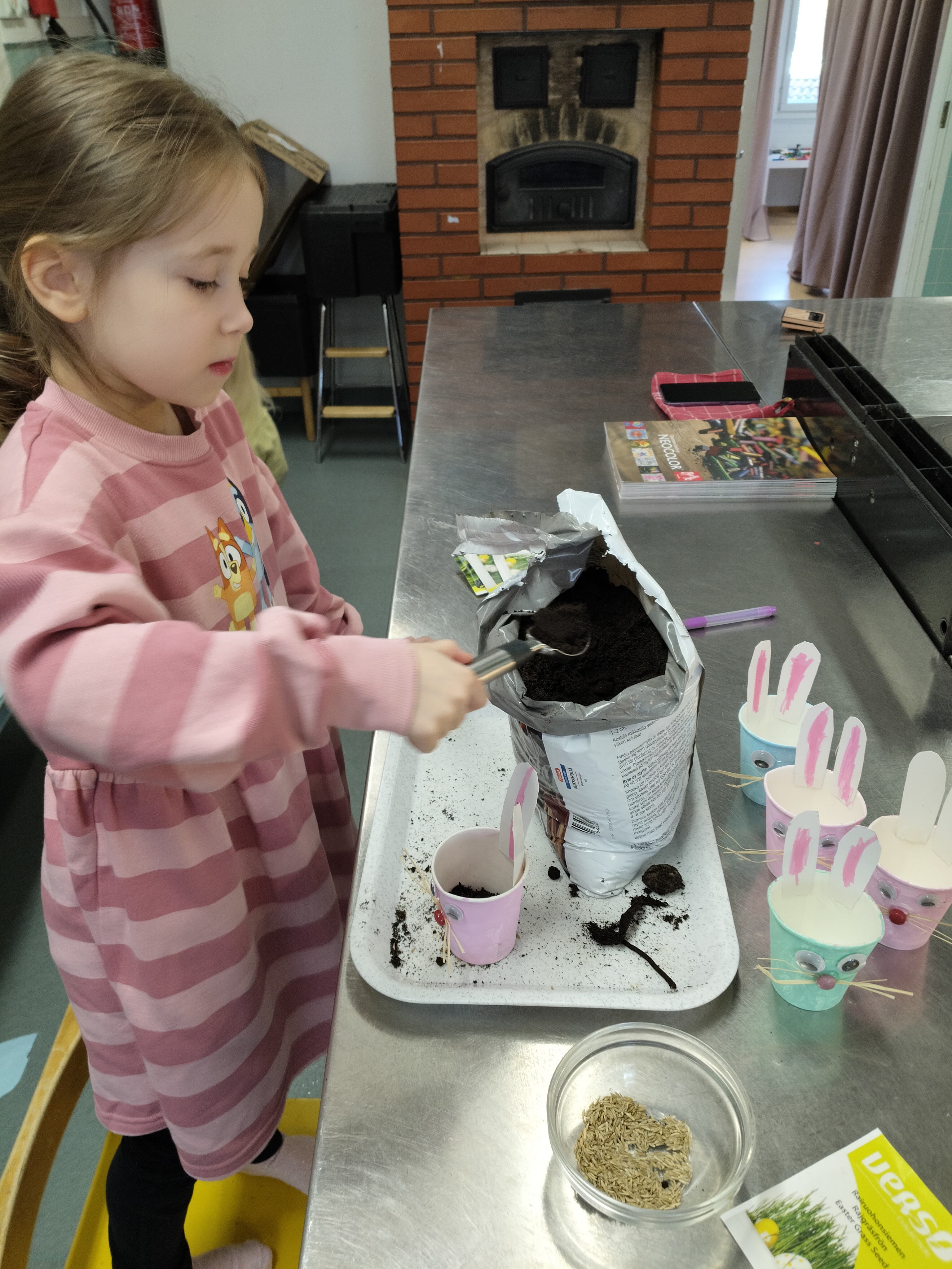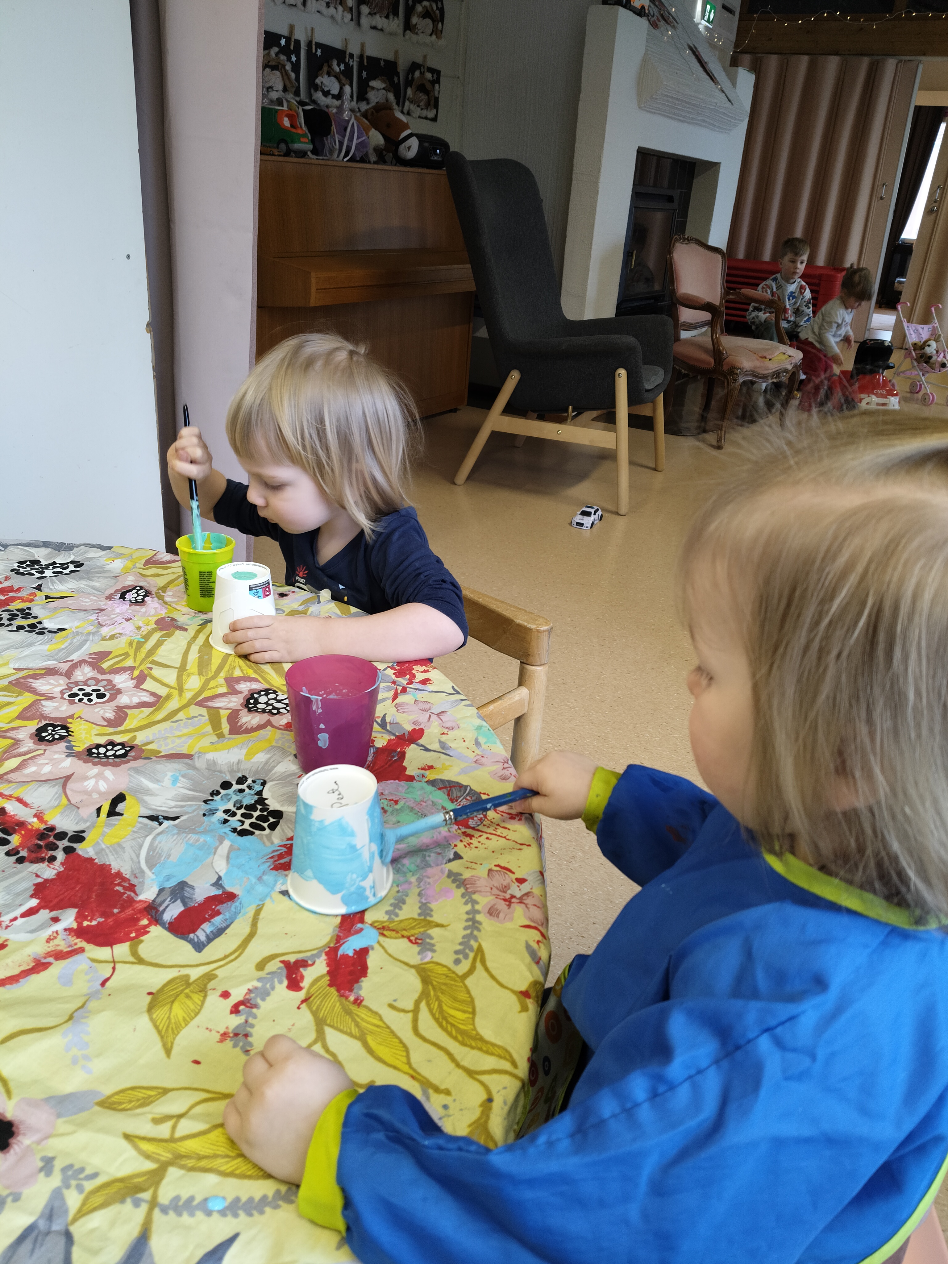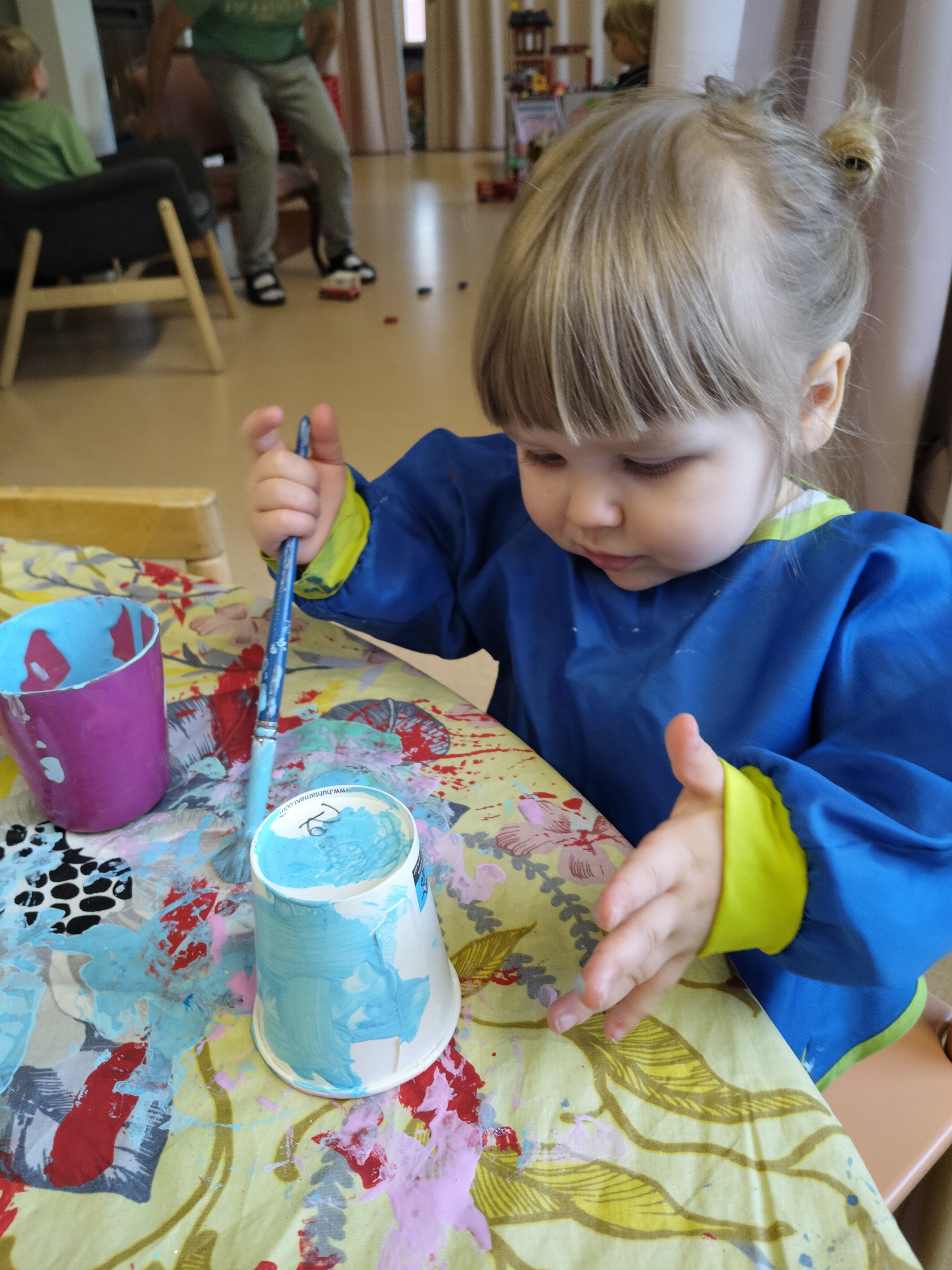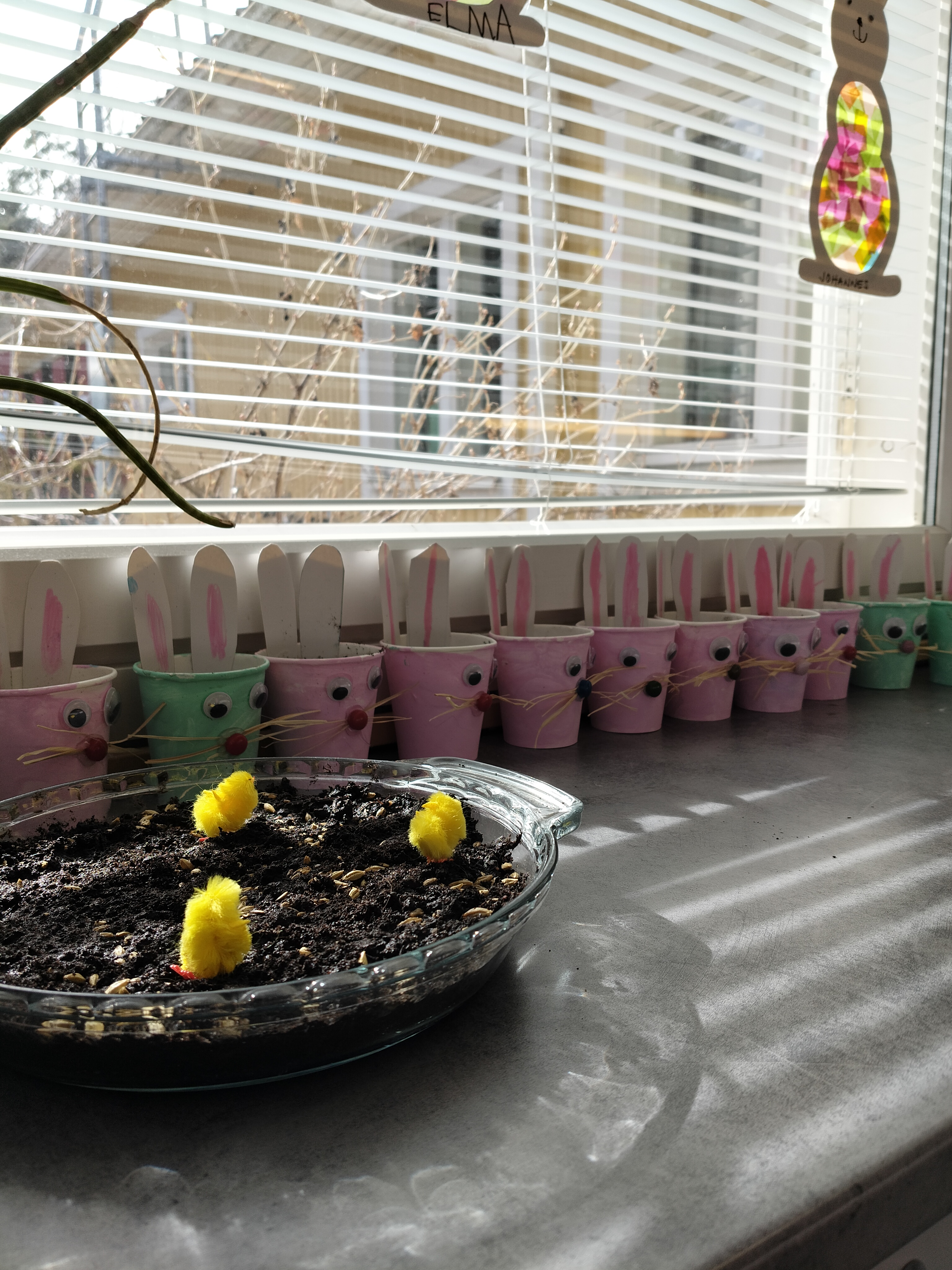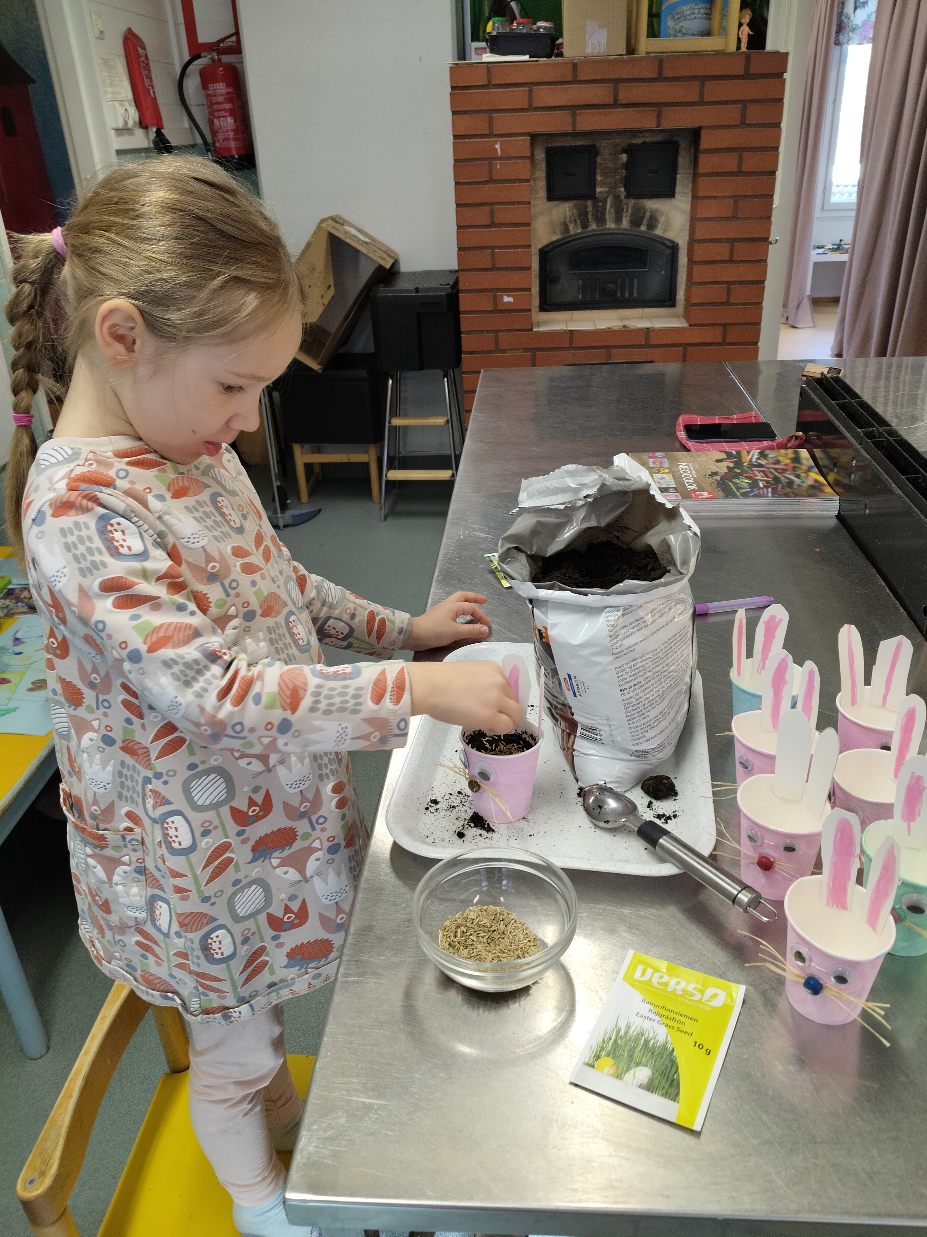 Tällä viikolla olemme aloittaneet pääsiäisruohon istuttamisen lasten kanssa. Lapset saivat maalata ja askarrella itselleen kupin, johon he itse istuttivat rairuohon. On hauska seurata vierestä kun lapset käyvät laulamassa ruohoille koska ne kuulemma kasvaa nopeammin jos niille laulaa 🙂