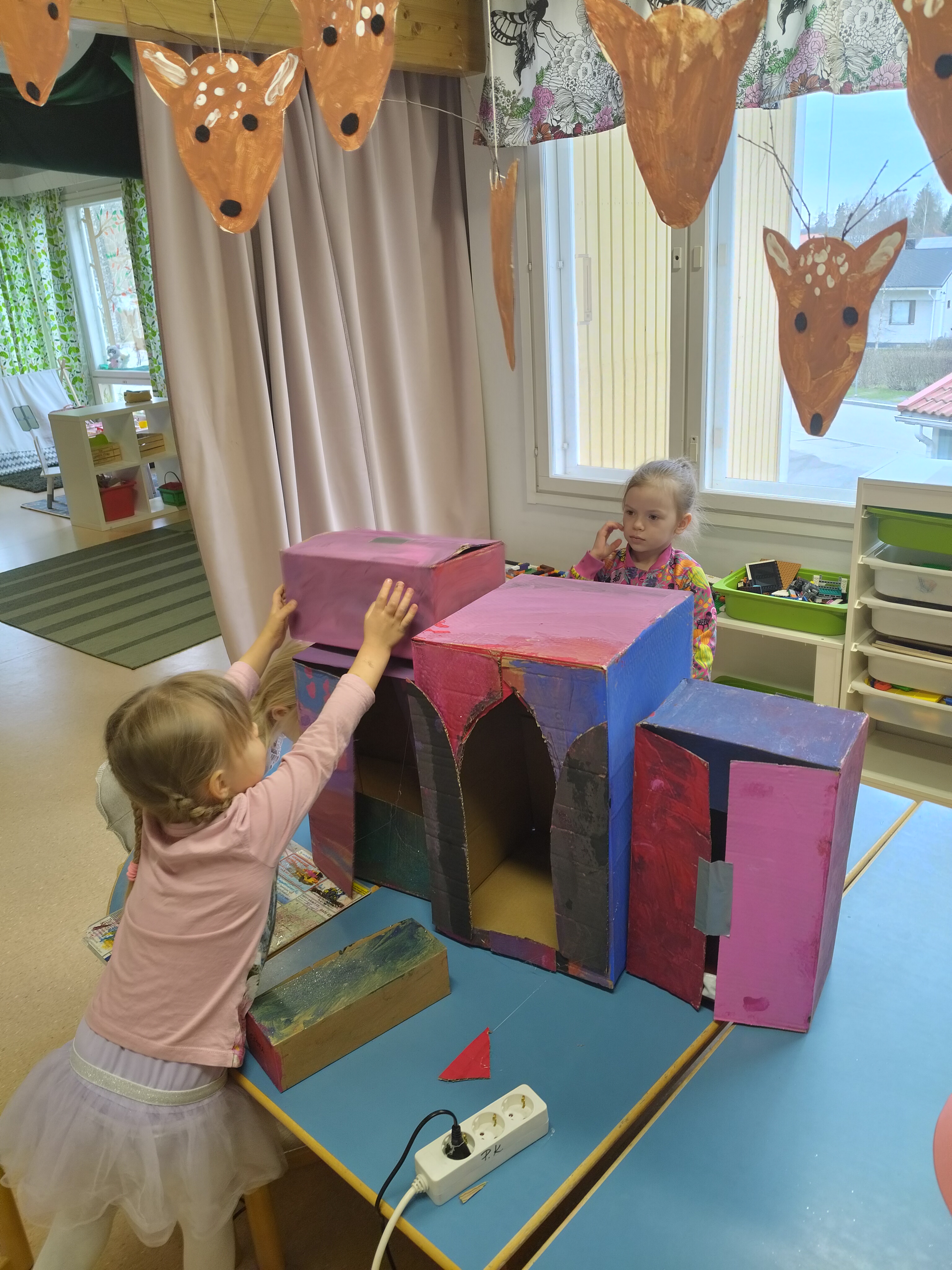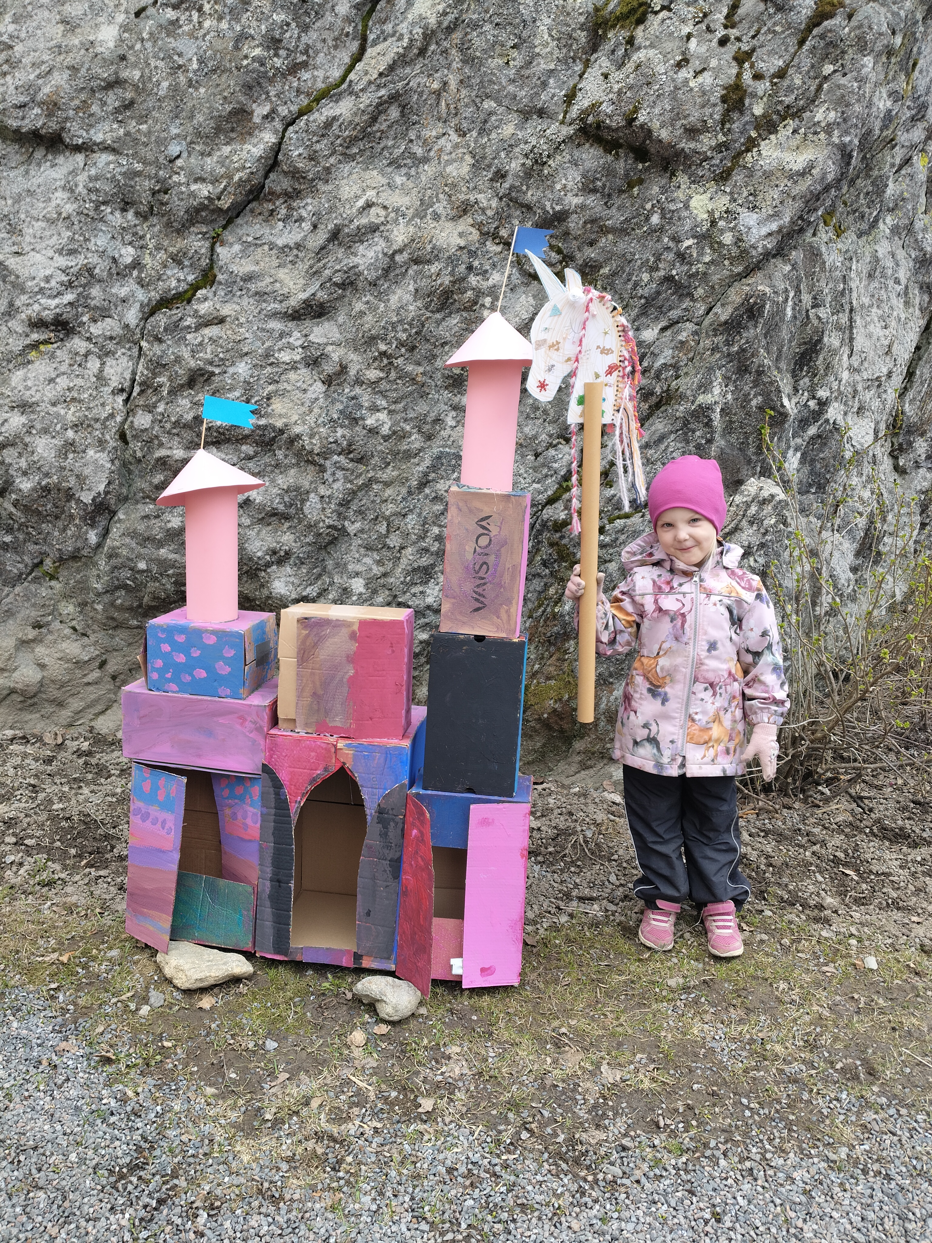 ”Päätin lasten kanssa toteuttaa pienryhmässä yksisarvislinna-projektin huomatessani, että idea kiinnosti kovasti. Kun pienryhmä oli kasassa, aloimme suunnittelemaan ja sovittelemaan pahvilaatikoita linnan muotoon. Lapset saivat itse koota pahvilaatikoista linnan. Teimme paperille suunnitelman, ja listan asioista miten linna koristellaan ja mitä linnaan tulee. Innostuksen näki lapsista, kun he saivat olla vahvasti mukana alusta alkaen.