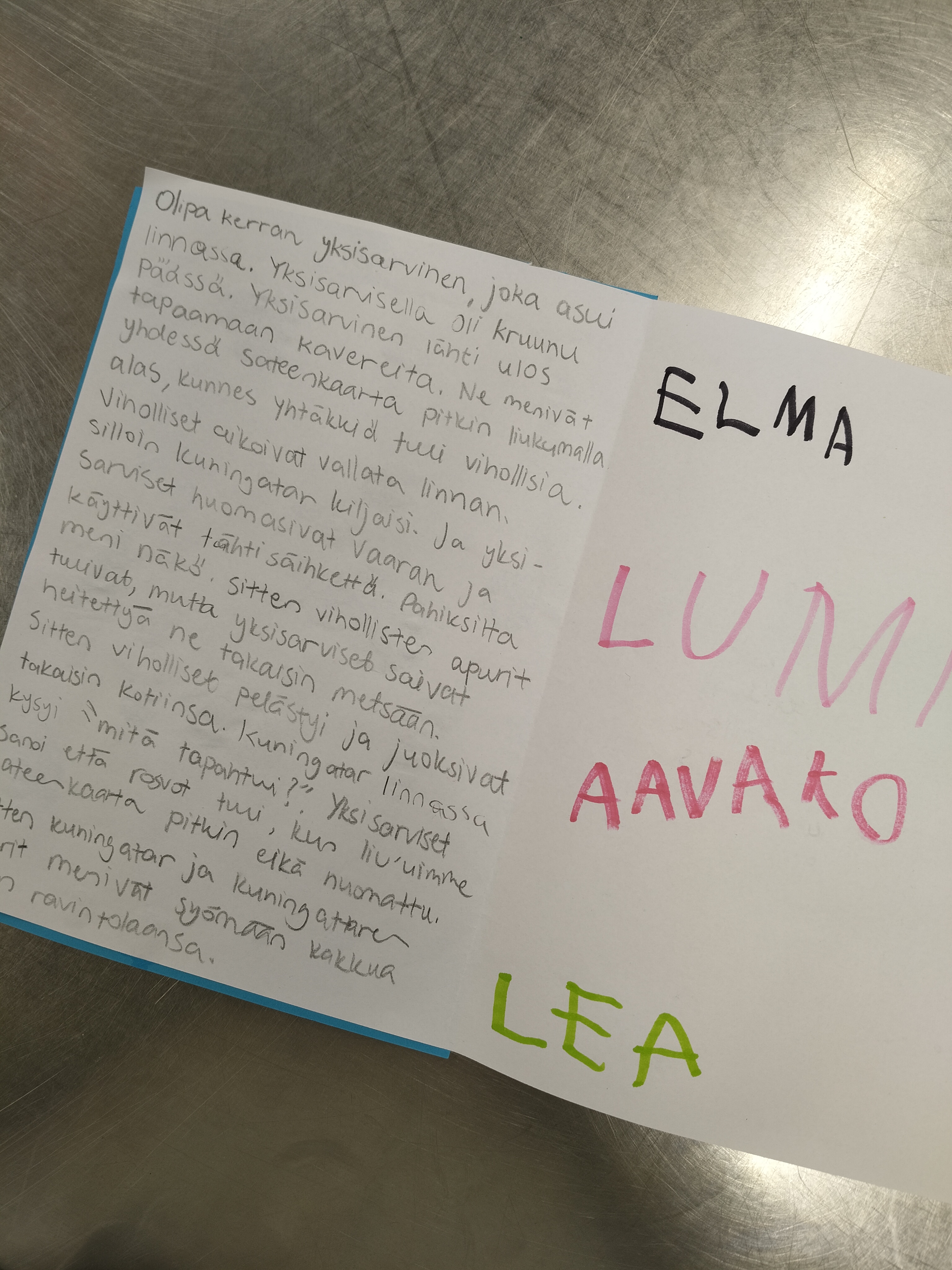 Linnan ja yksisarvisten innoittamana päätimme vielä luoda sadun pienryhmässä. Satu yksisarvisista, linnasta, kuningattaresta sekä pahiksista luettiin aamupiirillä. Sadun luonnissa olleet lapset saivat tulla aamupiirillä näyttämään piirrokset liittyen tarinaan ja juoneen. Lapset sekä minä olimme tyytyväisiä projektiin. Projekti päästi lasten luovuuden valloilleen ja oli todella mukava toteuttaa projekti, joka alkujuuriaan on lähtenyt lasten mielenkiinnonkohteista liikkeelle.”