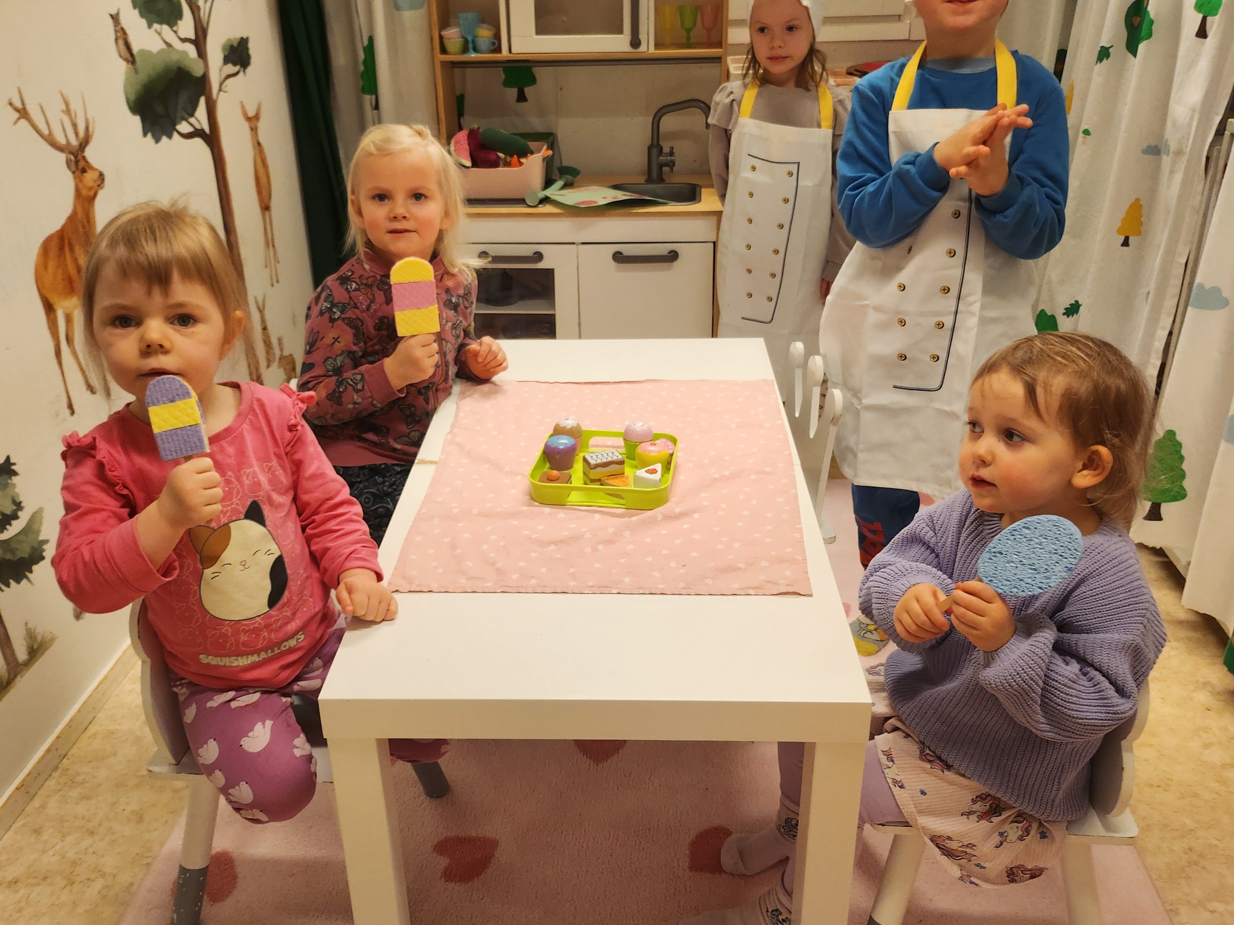 Lapsen osallisuus ryhmän toiminnassa huomioidaan päivittäin arjen eri askareissa. Lapset ovat olleet todella innokkaita pitämään aamupiiriä ja he pääsevät osallistumaan leikin rakentamiseen yhdessä aikuisen kanssa. Tällä hetkellä suunnittelemme leikkiympäristöjen piristämistä ja olemmekin lasten kanssa askarrelleet jätskejä ja pizzoja tuleviin leikkeihin 🙂