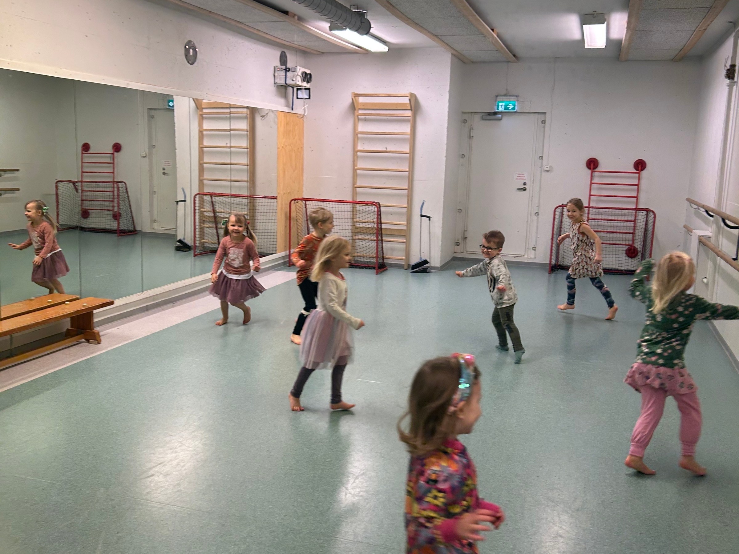Jumpalla liikuttiin rummunsoiton tahtiin ja soiton pysähtyessä sai esittää haluamaansa eläintä. Toisella kierroksella leikittiin patsasleikkiä. Pallot ovat lasten oma suosikki ja niiden avulla tehtiin koordinaatioharjoitusta heittämällä sekä vierittämällä. Lopuksi pelasimme sählyä. Lapset ovat kehitelleet hauskoja tuuletuksia aina kun saavat maalin 🙂