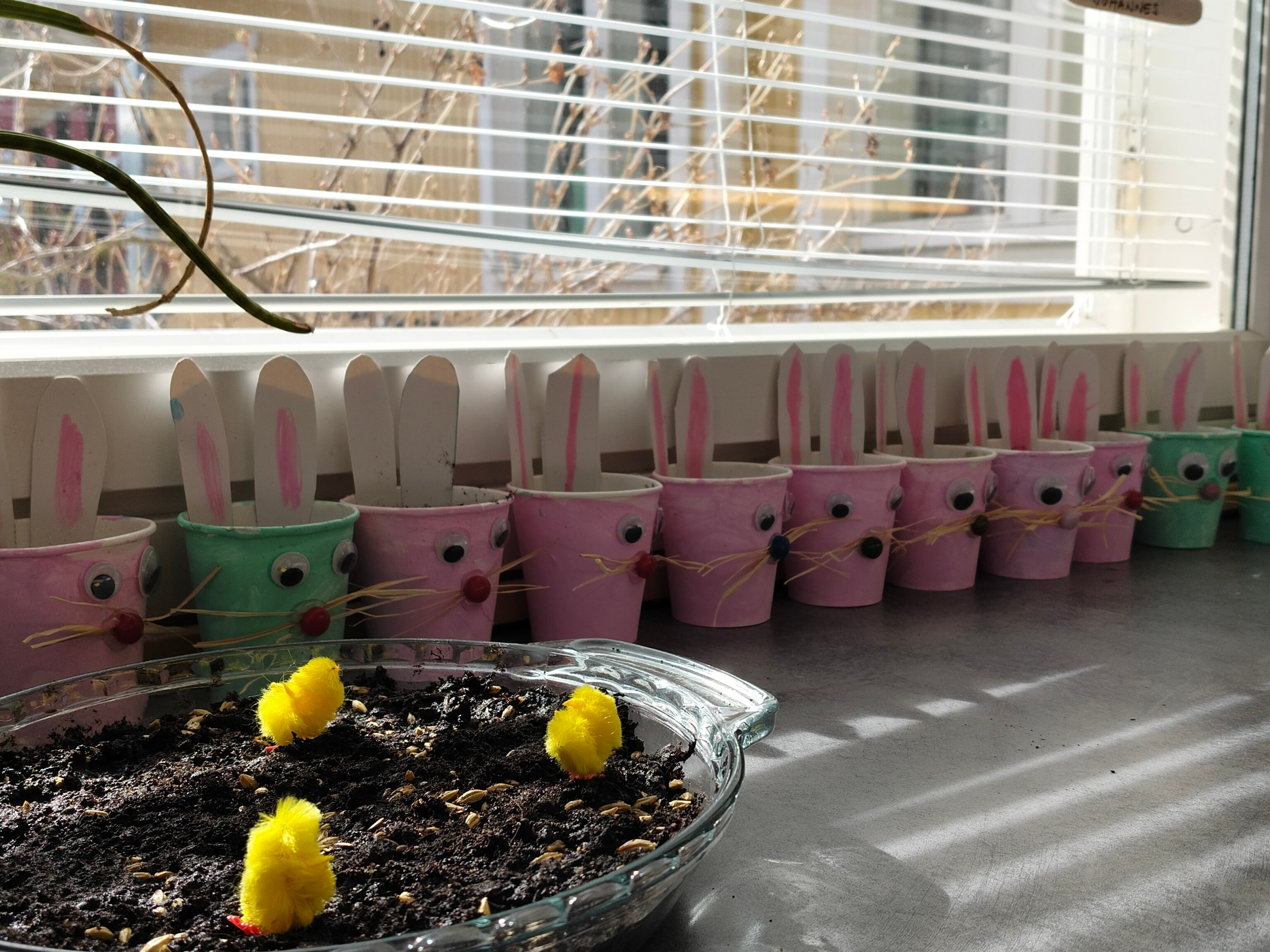 Tällä viikolla olemme aloittaneet pääsiäisruohon istuttamisen lasten kanssa. Lapset saivat maalata ja askarrella itselleen kupin, johon he itse istuttivat rairuohon. On hauska seurata vierestä kun lapset käyvät laulamassa ruohoille koska ne kuulemma kasvaa nopeammin jos niille laulaa 🙂